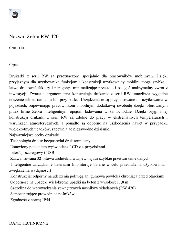 Nazwa: Zebra RW 420 Cena: TEL. Opis: Drukarki z serii RW są przeznaczone specjalnie dla pracowników mobilnych. Dzięki przyjaznym dla użytkownika funkcjom i konstrukcji użytkownicy mobilni mogą szybko i łatwo drukować faktury i paragony minimalizując przestoje i osiągać maksymalny zwrot z inwestycji. Zwarta i ergonomiczna konstrukcja drukarek z serii RW umożliwia wygodne noszenie ich na ramieniu lub przy pasku. Urządzenia te są przystosowane do użytkowania w pojazdach, zapewniając pracownikom mobilnym dodatkową swobodę dzięki oferowanym przez firmę Zebra inteligentnym opcjom ładowania w samochodzie. Dzięki oryginalnej konstrukcji drukarki z serii RW są zdolne do pracy w ekstremalnych temperaturach i warunkach atmosferycznych, a ponadto są odporne na uszkodzenia nawet w przypadku wielokrotnych upadków, zapewniając niezawodne działanie. Najważniejsze cechy drukarki: Technologia druku: bezpośredni druk termiczny Ustawiony pod kątem wyświetlacz LCD z 4 przyciskami Interfejs szeregowy i USB Zaawansowana 32-bitowa architektura zapewniająca szybkie przetwarzanie danych Inteligentne zarządzanie bateriami (monitoruje baterie w celu przedłużenia użytkowania i zwiększenia wydajności) Konstrukcja: odporny na uderzenia poliwęglan, gumowa powłoka chroniąca przed otarciami Odporność na upadek: wielokrotne upadki na beton z wysokości 1,8 m Szczelina do wprowadzania zewnętrznych nośników składanych (RW 420) Samocentrujące prowadnice nośników Zgodność z normą IP54 DANE TECHNICZNE NAZWA RW 420 Rodzaj Drukarka etykiet przenośna Technika wydruku Termiczna Rozdzielczość 203 dpi Szybkość wydruku Do 76,2 mm/s Maks. szerokość etykiet 104 mm Maks. długość etykiet b.d. Waga 907 g. Wymiary 160 x 76 x 175 mm Język programowania CPCL, emulacja ZPL i EPL Pamięć 8 MB SRAM, 4 MB Flash Złącze komunikacyjne RS 232, USB Dostępne opcje interfejs bezprzewodowy Bluetooth lub 802.11b/g, czytnik paska magnetycznego, czytnik kart chipowych zgodnych ze standardem EMV, samochodowy dok ładujący, ładowarka na cztery baterie, Zestaw montażowy do pojazdów, Pasek na ramię/pasek na rękę, Pokrowiec ochronny, Wszystkie podane ceny, są cenami netto do których należy doliczyć podatek VAT. Cennik nie stanowi oferty handlowej w rozumieniu art. 66 par.1 Kodeksu Cywilnego