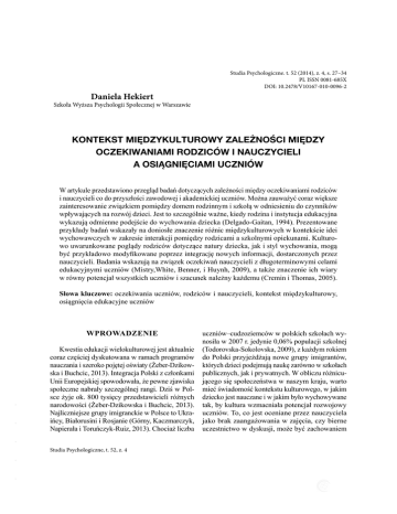 Studia Psychologiczne. t. 52 (2014), z. 4, s. 27–34 PL ISSN 0081-685X DOI: 10.2478/V10167-010-0096-2 Daniela Hekiert Szkoła Wyższa Psychologii Społecznej w Warszawie - WPROWADZENIE - - - - - - - - - Studia Psychologiczne, t. 52, z. 4 28 Daniela Hekiert - - - - - - - - - - - Studia Psychologiczne, t. 52, z. 4 Kontekst międzykulturowy zależności między oczekiwaniami rodziców i nauczycieli a osiągnięciami uczniów 29 - - - - - - - - - - - - - - Studia Psychologiczne, t. 52, z. 4 30 Daniela Hekiert - - - - - - - - - - - - - - - Studia Psychologiczne, t. 52, z. 4 Kontekst międzykulturowy zależności między oczekiwaniami rodziców i nauczycieli a osiągnięciami uczniów - 31 - - - - - - - - - - - - - - Studia Psychologiczne, t. 52, z. 4 32 Daniela Hekiert - Program rozwoju edukacji w War- Adolescence of Educational Studies, - Socializing young - - Na stronie - - - - - - - Studia Psychologiczne, t. 52, z. 4 Kontekst międzykulturowy zależności między oczekiwaniami rodziców i nauczycieli a osiągnięciami uczniów 33 Educational Studies Special educational needucation - Handbook of competence and motivation - Sprogforum - cial, economic, and educational reform to close in cultural context race, and family life Journal of Counseling Dzieci imigran- [ ols, gist, - - - - - - - - Studia Psychologiczne, t. 52, z. 4 34 Daniela Hekiert Education Edukacja wielokulturowa rzystwa Naukowego Daniela Hekiert Warsaw University of Social Sciences and Humanities CROSS-CULTURAL CONTEXT OF THE INFLUENCE OF PARENTS’ AND TEACHERS’ EXPECTATIONS ON PUPILS’ AND STUDENTS’ ACHIEVEMENTS ABSTRACT - - - - - - Studia Psychologiczne, t. 52, z. 4