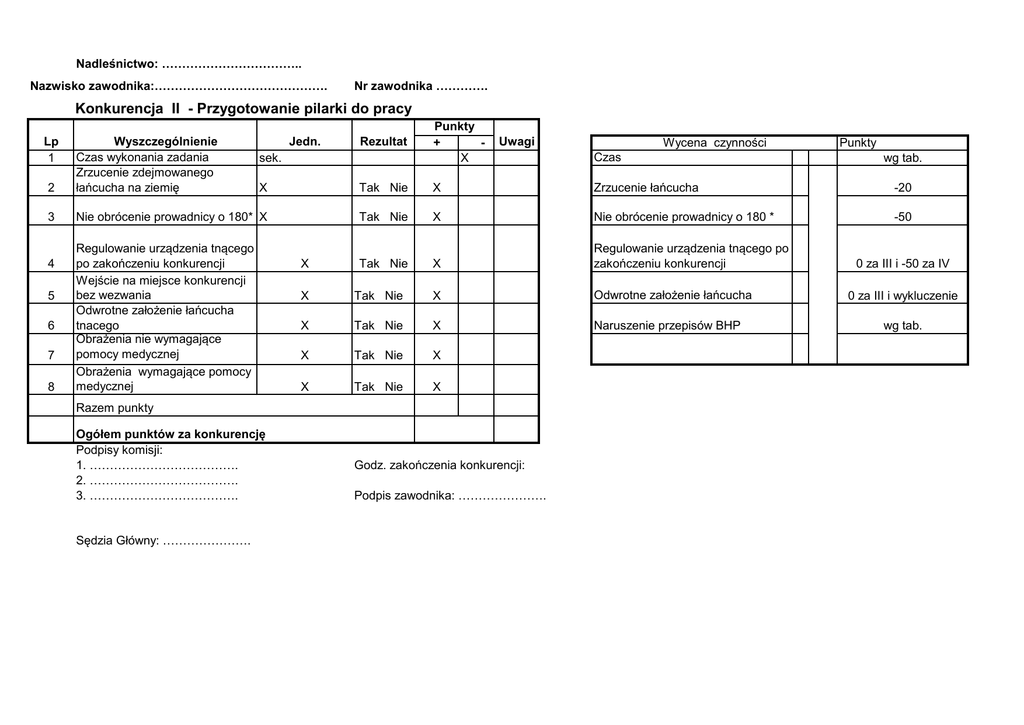 Nadleśnictwo: …………………………….. Nazwisko zawodnika:……………………………………. Nr zawodnika …………. Konkurencja II - Przygotowanie pilarki do pracy Lp 1 X Tak Nie X Zrzucenie łańcucha -20 3 Nie obrócenie prowadnicy o 180* X Tak Nie X Nie obrócenie prowadnicy o 180 * -50 X Regulowanie urządzenia tnącego po zakończeniu konkurencji 5 6 7 8 Rezultat Wycena czynności 2 4 Jedn. Punkty + X Wyszczególnienie Czas wykonania zadania Zrzucenie zdejmowanego łańcucha na ziemię sek. Regulowanie urządzenia tnącego po zakończeniu konkurencji Wejście na miejsce konkurencji bez wezwania Odwrotne założenie łańcucha tnacego Obrażenia nie wymagające pomocy medycznej Obrażenia wymagające pomocy medycznej X Tak Nie Uwagi X Tak Nie X Odwrotne założenie łańcucha X Tak Nie X Naruszenie przepisów BHP X Tak Nie X X Tak Nie X Razem punkty Ogółem punktów za konkurencję Podpisy komisji: 1. ………………………………. 2. ………………………………. 3. ………………………………. Sędzia Główny: …………………. Czas Godz. zakończenia konkurencji: Podpis zawodnika: …………………. Punkty wg tab. 0 za III i -50 za IV 0 za III i wykluczenie wg tab.