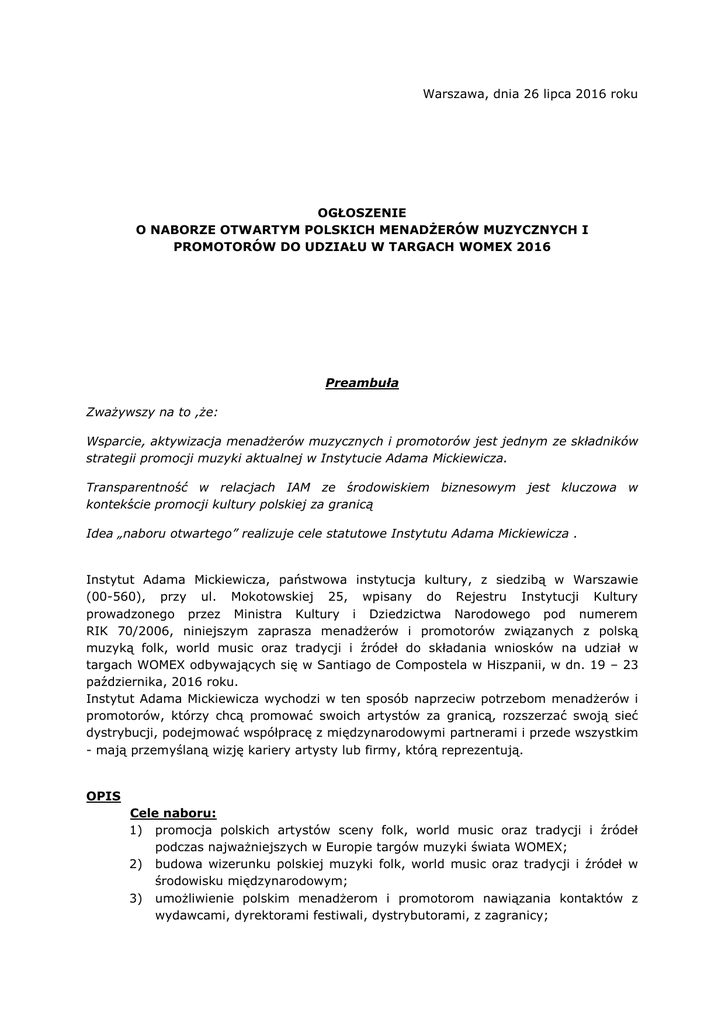 Warszawa, dnia 26 lipca 2016 roku OGŁOSZENIE O NABORZE OTWARTYM POLSKICH MENADŻERÓW MUZYCZNYCH I PROMOTORÓW DO UDZIAŁU W TARGACH WOMEX 2016 Preambuła Zważywszy na to ,że: Wsparcie, aktywizacja menadżerów muzycznych i promotorów jest jednym ze składników strategii promocji muzyki aktualnej w Instytucie Adama Mickiewicza. Transparentność w relacjach IAM ze środowiskiem biznesowym jest kluczowa w kontekście promocji kultury polskiej za granicą Idea „naboru otwartego” realizuje cele statutowe Instytutu Adama Mickiewicza . Instytut Adama Mickiewicza, państwowa instytucja kultury, z siedzibą w Warszawie (00-560), przy ul. Mokotowskiej 25, wpisany do Rejestru Instytucji Kultury prowadzonego przez Ministra Kultury i Dziedzictwa Narodowego pod numerem RIK 70/2006, niniejszym zaprasza menadżerów i promotorów związanych z polską muzyką folk, world music oraz tradycji i źródeł do składania wniosków na udział w targach WOMEX odbywających się w Santiago de Compostela w Hiszpanii, w dn. 19 – 23 października, 2016 roku. Instytut Adama Mickiewicza wychodzi w ten sposób naprzeciw potrzebom menadżerów i promotorów, którzy chcą promować swoich artystów za granicą, rozszerzać swoją sieć dystrybucji, podejmować współpracę z międzynarodowymi partnerami i przede wszystkim - mają przemyślaną wizję kariery artysty lub firmy, którą reprezentują. OPIS Cele naboru: 1) promocja polskich artystów sceny folk, world music oraz tradycji i źródeł podczas najważniejszych w Europie targów muzyki świata WOMEX; 2) budowa wizerunku polskiej muzyki folk, world music oraz tradycji i źródeł w środowisku międzynarodowym; 3) umożliwienie polskim menadżerom i promotorom nawiązania kontaktów z wydawcami, dyrektorami festiwali, dystrybutorami, z zagranicy; 4) umożliwienie wnioskodawcom uczestnictwa jako zaproszeni delegaci w stoisku promującym Polskę pod hasłem „Poland by Culture.pl” WSPARCIE 1. Instytut wesprze finansowo wnioskodawców w zakresie: 1) zwrotu kosztów zakupu akredytacji na targi WOMEX; 2) zapewnienia noclegu w Santiago de Compostela w hotelu os standardzie *** (jedynki ze śniadaniami w dn 18 – 24 października) 2. Instytut nie zapewnia i nie będzie pokrywał innych kosztów Wnioskodawcy, w tym kosztów podróży na Targi, a także nie będzie wypłacał wnioskodawcom diet ani honorariów. WNIOSKODAWCY 3. Ogłoszenie kieruje się do menadżerów muzycznych, promotorów, wydawców muzycznych posiadających w swoim katalogu polskich artystów oraz dyrektorów programowych/artystycznych polskich festiwali folkowych, world music i pokrewnych, zapraszających na swój festiwal polskich artystów 4. Podmioty, które poprzez nabór otwarty korzystały ze wsparcia Instytutu w roku 2015, będą mogły ubiegać się o wsparcie również w roku bieżącym. W tym przypadku jednak Instytut zapewni takiemu podmiotowi tylko i wyłącznie zwrot kosztów zakupu akredytacji na targi WOMEX. Pozostałe koszty, w tym koszty rezerwacji hotelowych i podróży muszą zostać pokryte przez Wnioskodawcę. FORMULARZ ZGŁOSZENIOWY 5. Osoby zgłaszające, zobowiązane są do wypełnienia formularza zgłoszeniowego zawierającego pytania mające na celu określenie profilu zgłaszającego, a także określającego cele wyjazdu na Targi oraz proponowany plan ewentualnych spotkań z zagranicznymi partnerami. Formularz zgłoszeniowy znajduje się na stronie iam.pl PROCEDURA 6. Nabór wniosków trwać będzie w okresie od dnia 27 lipca 2016 roku do 5 sierpnia 2016 roku, do godz 23.59. Formularz zgłoszeniowy należy przesłać e-mailem na adres [email protected]. 7. Do udziału w projekcie zaproszonych zostanie maksymalnie 10 wnioskodawców, których zgłoszenia zostaną najwyżej ocenione. 8. Do oceny merytorycznej są kierowane wyłącznie wnioski spełniające wymagania formalne, tj. przesłane w terminie i zawierające wypełnione wszystkie wymagane pozycje formularza. 9. Oceny merytorycznej wniosków dokonywać będzie Komisja, w składzie trzech osób (eksperta muzyki aktualnej IAM, realizatora i koordynatora projektów muzycznych IAM, oraz jednego eksperta zewnętrznego – koordynatora Targów WOMEX). 10. Wnioski będą oceniane, przez każdego z członków Komisji, według następujących kryteriów merytorycznych: 1) Doświadczenia w branży wynikającego z krótkiego opisu działalności wnioskodawcy – 0-10 pkt; 2) Rzeczowo sformułowanych celów wyjazdu na Targi WOMEX – 0-10 pkt; 3) Planu potencjalnych spotkań z zagranicznymi partnerami podczas Targów WOMEX – 0 – 10 pkt; 4) Przejrzyście i szczegółowo sformułowanych potencjalnych efektów wyjazdu na Targi WOMEX - 0 – 10 pkt; 11. Każdy z członków Komisji będzie przyznawał punkty, o których mowa w ust. 9 powyżej, samodzielnie, które następnie ulegną zsumowaniu i podzieleniu przez liczbę członków Komisji. 12.Wyniki, uzyskane przez wnioskodawców zostaną ogłoszone na stronach internetowych www.iam.pl i www.dontpanic.culture.pl do dnia 10 sierpnia 2016 roku. 13. Do uzyskania wsparcia Instytutu rekomendowane będą projekty, które uzyskały najwyższą punktację. 14. Instytut będzie się kontaktował z Wnioskodawcami, którzy złożyli formularze zgłoszeniowe, o których mowa w ust. 4 powyżej, celem zaproszenia do udziału w projekcie. 15. Zwrot kosztów zakupu akredytacji, o której mowa w pkt 1, odbędzie się przelewem na podane konto Wnioskodawcy w terminie 14 dni od momentu dostarczenia prawidłowo przygotowanego raportu z wyjazdu na Targi WOMEX wraz z dokumentem księgowym potwierdzającym zakup ww. akredytacji. Wzór raportu znajduje się w załączniku nr 2. 16. W przypadku, w którym wybrany Wnioskodawca nie weźmie udziału w Targach, z przyczyn od niego zależnych, zobowiązany będzie do zwrotu Instytutowi kosztów związanych z wykupionym noclegiem, w wysokości kosztów poniesionych przez Instytut, w terminie 7 dni od daty dostarczenia wezwania do zapłaty. 