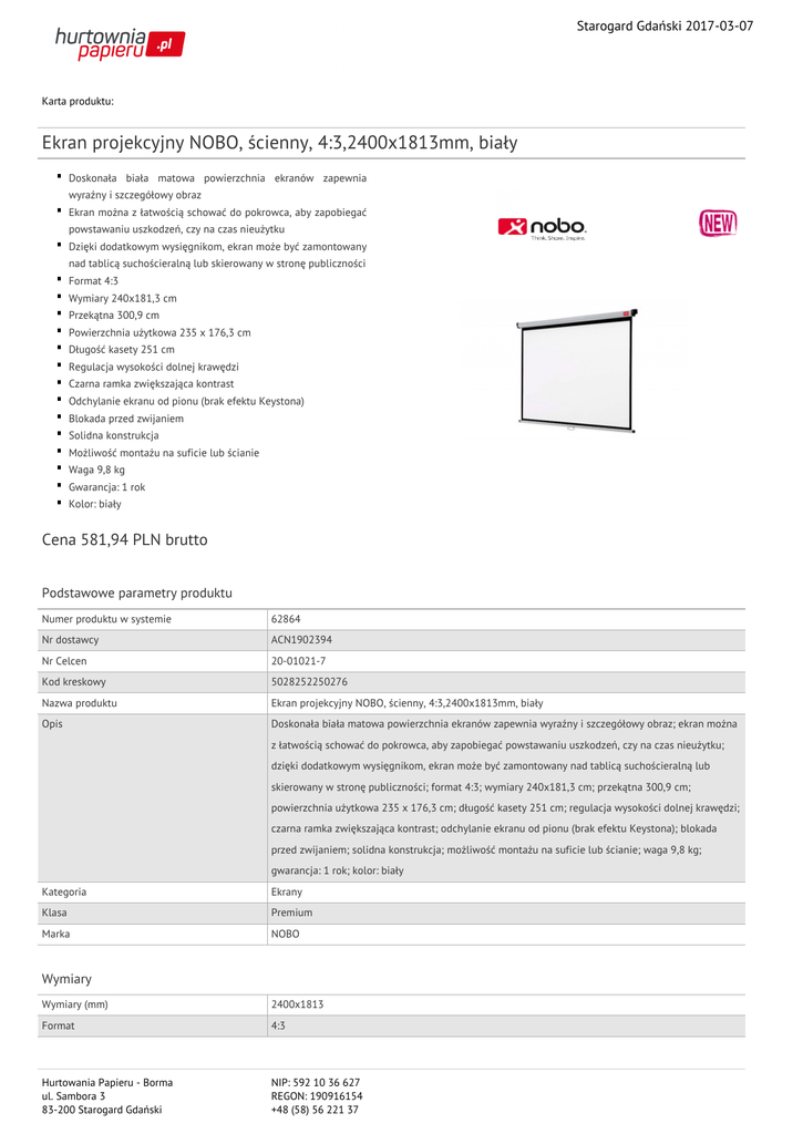 Starogard Gdański 2017-03-07 Karta produktu: Ekran projekcyjny NOBO, ścienny, 4:3,2400x1813mm, biały Doskonała biała matowa powierzchnia ekranów zapewnia wyraźny i szczegółowy obraz Ekran można z łatwością schować do pokrowca, aby zapobiegać powstawaniu uszkodzeń, czy na czas nieużytku Dzięki dodatkowym wysięgnikom, ekran może być zamontowany nad tablicą suchościeralną lub skierowany w stronę publiczności Format 4:3 Wymiary 240x181,3 cm Przekątna 300,9 cm Powierzchnia użytkowa 235 x 176,3 cm Długość kasety 251 cm Regulacja wysokości dolnej krawędzi Czarna ramka zwiększająca kontrast Odchylanie ekranu od pionu (brak efektu Keystona) Blokada przed zwijaniem Solidna konstrukcja Możliwość montażu na suficie lub ścianie Waga 9,8 kg Gwarancja: 1 rok Kolor: biały Cena 581,94 PLN brutto Podstawowe parametry produktu Numer produktu w systemie 62864 Nr dostawcy ACN1902394 Nr Celcen 20-01021-7 Kod kreskowy 5028252250276 Nazwa produktu Ekran projekcyjny NOBO, ścienny, 4:3,2400x1813mm, biały Opis Doskonała biała matowa powierzchnia ekranów zapewnia wyraźny i szczegółowy obraz; ekran można z łatwością schować do pokrowca, aby zapobiegać powstawaniu uszkodzeń, czy na czas nieużytku; dzięki dodatkowym wysięgnikom, ekran może być zamontowany nad tablicą suchościeralną lub skierowany w stronę publiczności; format 4:3; wymiary 240x181,3 cm; przekątna 300,9 cm; powierzchnia użytkowa 235 x 176,3 cm; długość kasety 251 cm; regulacja wysokości dolnej krawędzi; czarna ramka zwiększająca kontrast; odchylanie ekranu od pionu (brak efektu Keystona); blokada przed zwijaniem; solidna konstrukcja; możliwość montażu na suficie lub ścianie; waga 9,8 kg; gwarancja: 1 rok; kolor: biały Kategoria Ekrany Klasa Premium Marka NOBO Wymiary Wymiary (mm) 2400x1813 Format 4:3 Hurtowania Papieru - Borma ul. Sambora 3 83-200 Starogard Gdański NIP: 592 10 36 627 REGON: 190916154 +48 (58) 56 221 37 Starogard Gdański 2017-03-07 Karta katalogowa produktu cd. Ekran projekcyjny NOBO, ścienny, 4:3,2400x1813mm, biały Cecha Produkt Ekran projekcyjny W ofercie od 2017-01 Rodzaj Ścienny Typ Standard Wspólny słownik zamówień CPV 30237210-4 Ekrany antyodblaskowe Certyfikaty Ilość lat gwarancji 1 Hit Standard Nowy produkt w ofercie Nowość Kolor Kolor Biały Pozostałe zdjęcia produktu Serdecznie zapraszamy do współpracy Hurtowania Papieru - Borma zespół. Hurtowania Papieru - Borma ul. Sambora 3 83-200 Starogard Gdański NIP: 592 10 36 627 REGON: 190916154 +48 (58) 56 221 37