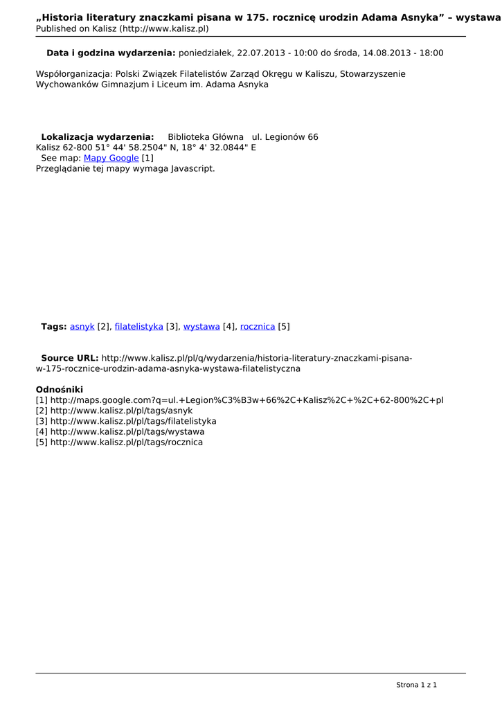 „Historia literatury znaczkami pisana w 175. rocznicę urodzin Adama Asnyka” – wystawa Published on Kalisz (http://www.kalisz.pl) Data i godzina wydarzenia: poniedziałek, 22.07.2013 - 10:00 do środa, 14.08.2013 - 18:00 Współorganizacja: Polski Związek Filatelistów Zarząd Okręgu w Kaliszu, Stowarzyszenie Wychowanków Gimnazjum i Liceum im. Adama Asnyka Lokalizacja wydarzenia: Biblioteka Główna ul. Legionów 66 Kalisz 62-800 51° 44' 58.2504" N, 18° 4' 32.0844" E See map: Mapy Google [1] Przeglądanie tej mapy wymaga Javascript. Tags: asnyk [2], filatelistyka [3], wystawa [4], rocznica [5] Source URL: http://www.kalisz.pl/pl/q/wydarzenia/historia-literatury-znaczkami-pisanaw-175-rocznice-urodzin-adama-asnyka-wystawa-filatelistyczna Odnośniki [1] http://maps.google.com?q=ul.+Legion%C3%B3w+66%2C+Kalisz%2C+%2C+62-800%2C+pl [2] http://www.kalisz.pl/pl/tags/asnyk [3] http://www.kalisz.pl/pl/tags/filatelistyka [4] http://www.kalisz.pl/pl/tags/wystawa [5] http://www.kalisz.pl/pl/tags/rocznica Strona 1 z 1 Powered by TCPDF (www.tcpdf.org)