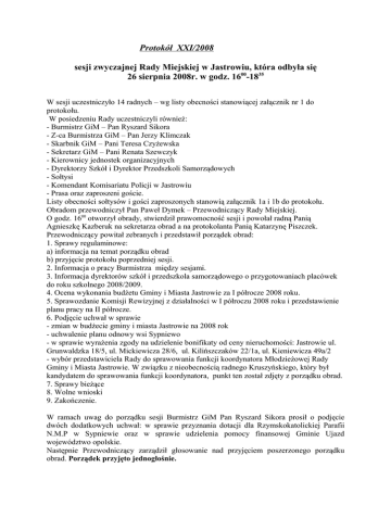 Protokół XXI/2008 sesji zwyczajnej Rady Miejskiej w Jastrowiu, która odbyła się 26 sierpnia 2008r. w godz. 1600-1835 W sesji uczestniczyło 14 radnych – wg listy obecności stanowiącej załącznik nr 1 do protokołu. W posiedzeniu Rady uczestniczyli również: - Burmistrz GiM – Pan Ryszard Sikora - Z-ca Burmistrza GiM – Pan Jerzy Klimczak - Skarbnik GiM – Pani Teresa Czyżewska - Sekretarz GiM – Pani Renata Szewczyk - Kierownicy jednostek organizacyjnych - Dyrektorzy Szkół i Dyrektor Przedszkoli Samorządowych - Sołtysi - Komendant Komisariatu Policji w Jastrowiu - Prasa oraz zaproszeni goście. Listy obecności sołtysów i gości zaproszonych stanowią załącznik 1a i 1b do protokołu. Obradom przewodniczył Pan Paweł Dymek – Przewodniczący Rady Miejskiej. O godz. 1600 otworzył obrady, stwierdził prawomocność sesji i powołał radną Panią Agnieszkę Kazberuk na sekretarza obrad a na protokolanta Panią Katarzynę Piszczek. Przewodniczący powitał zebranych i przedstawił porządek obrad: 1. Sprawy regulaminowe: a) informacja na temat porządku obrad b) przyjęcie protokołu poprzedniej sesji. 2. Informacja o pracy Burmistrza między sesjami. 3. Informacja dyrektorów szkół i przedszkola samorządowego o przygotowaniach placówek do roku szkolnego 2008/2009. 4. Ocena wykonania budżetu Gminy i Miasta Jastrowie za I półrocze 2008 roku. 5. Sprawozdanie Komisji Rewizyjnej z działalności w I półroczu 2008 roku i przedstawienie planu pracy na II półrocze. 6. Podjęcie uchwał w sprawie - zmian w budżecie gminy i miasta Jastrowie na 2008 rok - uchwalenie planu odnowy wsi Sypniewo - w sprawie wyrażenia zgody na udzielenie bonifikaty od ceny nieruchomości: Jastrowie ul. Grunwaldzka 18/5, ul. Mickiewicza 28/6, ul. Kilińszczaków 22/1a, ul. Kieniewicza 49a/2 - wybór przedstawiciela Rady do sprawowania funkcji koordynatora Młodzieżowej Rady Gminy i Miasta Jastrowie. W związku z nieobecnością radnego Kruszyńskiego, który był kandydatem do sprawowania funkcji koordynatora, punkt ten został zdjęty z porządku obrad. 7. Sprawy bieżące 8. Wolne wnioski 9. Zakończenie. W ramach uwag do porządku sesji Burmistrz GiM Pan Ryszard Sikora prosił o podjęcie dwóch dodatkowych uchwał: w sprawie przyznania dotacji dla Rzymskokatolickiej Parafii N.M.P w Sypniewie oraz w sprawie udzielenia pomocy finansowej Gminie Ujazd województwo opolskie. Następnie Przewodniczący zarządził głosowanie nad przyjęciem poszerzonego porządku obrad. Porządek przyjęto jednogłośnie. Przewodniczący poinformował, że protokół poprzedniej sesji był wyłożony do wglądu w biurze rady, uwag do protokołu nie było i protokół przyjęto jednogłośnie. Ad. 2 Burmistrz przedstawił informację o swojej pracy między sesjami – (zał. nr 2 do protokołu). Pytań nie było. Informację Burmistrza przyjęto jednogłośnie. Ad. 3 Przewodniczący Rady Pan Dymek powiedział, że Komisja Oświaty w dniu 25 sierpnia br odwiedziła wszystkie placówki szkolne i przedszkolne położone w naszej gminie zapoznając się z ich stanem przygotowań do nowego roku szkolnego. W związku z tym poprosił przewodniczącego Komisji Oświaty Pana Trawińskiego o stwierdzenie, czy zdaniem Komisji dyrektorzy placówek w pełni wykorzystali okres wakacji by dobrze przygotować swoja placówkę do nowego roku szkolnego. Radny Trawiński – są spokojni o nowy rok szkolny, może jeszcze nie wszystko zrobione, ale i tak nie jest źle. Najgorsza sytuacja jest w Publicznym Gimnazjum w Jastrowiu. Drugi poważny problem, to place wokół placówek (najgorszy to przy Przedszkolu Samorządowym). Ponadto Przewodniczący Komisji Oświaty zadał pytanie, czy nie można by było przesunąć patroli policyjnych z godzin dziennych na godziny nocne? Przewodniczący Rady Pan Dymek – zarządził głosowanie nad przedstawioną informacją – została ona przez radnych przyjęta jednogłośnie. Ad. 4 Następnie Przewodniczący Rady poprosił Burmistrza Gminy i Miasta Jastrowie o przedstawienie oceny wykonania budżetu Gminy i Miasta Jastrowie za I półrocze 2008 roku. Została przedstawiona. W dalszej kolejności Przewodniczący Rady poprosił przewodniczących komisji branżowych o przedstawienie, jak została przyjęta na posiedzeniach „Informacja o przebiegu wykonania budżetu za I półrocze 2008 r.” (załącznik Nr 3 do protokołu). Komisja Rozwoju Gospodarczego, Budżetu oraz Integracji Europejskiej – jednogłośnie; Komisja Porządku Publicznego, Gospodarki Gminnej i Ochrony Środowiska – jednogłośnie; Komisja Oświaty, Zdrowia, Kultury, Sportu i Spraw Socjalnych – jednogłośnie. Przewodniczący Dymek zarządził głosowanie całej Rady nad przedstawioną całościowo oceną (informacją)z wykonania budżetu za I półrocze 2008 roku. Została ona przyjęta jednogłośnie (14 głosów „za”). Ad. 5 Sprawozdanie Komisji Rewizyjnej z działalności w I półroczu 2008 roku i przedstawienie planu pracy na II półrocze. Przewodniczący Dymek poprosił o zabranie głosu Przewodniczącego Komisji Pana Stanisława Gawluka. Radny Gawluk odczytał przygotowane „sprawozdanie z działalności Komisji Rewizyjnej Rady Miejskiej w Jastrowiu za I półrocze 2008 roku.” Stanowi ono załącznik Nr 4 do niniejszego protokołu. Przewodniczący Dymek poddał pod głosowanie niniejsze sprawozdanie – przyjęto je jednogłośnie. Ad. 6 Przystąpiono do kolejnego punktu porządku obrad. Podjęcie uchwał w sprawie: Jako pierwszy głos zabrał Burmistrz GiM Ryszard Sikora przedstawiając i uzasadniając treść uchwały w sprawie przyznania dotacji dla Rzymskokatolickiej Parafii pw. Narodzenia N.M.P w Sypniewie (wniosek Parafii, Rady Sołeckiej oraz radnych wsi Sypniewo – zał. Nr 5 do protokołu). Wypowiedź Burmistrza uzupełnił radny Pan Edward Grzelak. Wywiązała się dyskusja w kwestii kosztów, jakie zostały poniesione już na tę inwestycje. Radny Sakowicz poprosił o przerwę na uzg