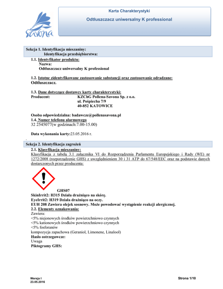 Karta Charakterystyki Odtłuszczacz uniwersalny K professional Sekcja 1. Identyfikacja mieszaniny: Identyfikacja przedsiębiorstwa: 1.1. Identyfikator produktu: Nazwa: Odtłuszczacz uniwersalny K professional 1.2. Istotne zidentyfikowane zastosowanie substancji oraz zastosowanie odradzane: Odtłuszczacz. 1.3. Dane dotyczące dostawcy karty charakterystyki: Producent: KZChG Pollena-Savona Sp. z o.o. ul. Pośpiecha 7/9 40-852 KATOWICE Osoba odpowiedzialna: [email protected] 1.4. Numer telefonu alarmowego 32 2545077(w godzinach:7.00-15.00) Data wykonania karty:23.05.2016 r. . Sekcja 2. Identyfikacja zagrożeń 2.1. Klasyfikacja mieszaniny: Klasyfikacja z tabelą 3.1 załącznika VI do Rozporządzenia Parlamentu Europejskiego i Rady (WE) nr 1272/2008 (rozporządzenie GHS) z uwzględnieniem 30 i 31 ATP do 67/548/EEC oraz na podstawie danych dostarczonych przez producenta: GHS07 SkinIrrit2: H315 Działa drażniąco na skórę. EyeIrrit2: H319 Działa drażniąco na oczy. EUH 208 Zawiera olejek sosnowy. Może powodować wystąpienie reakcji alergicznej. 2.2. Elementy oznakowania: Zawiera: <5% niejonowych środków powierzchniowo czynnych <5% kationowych środków powierzchniowo czynnych <5% fosforanów kompozycja zapachowa (Geraniol, Limonene, Linalool) Hasło ostrzegawcze: Uwaga Piktogramy GHS: Wersja I 23.05.2016 Strona 1/10 Karta Charakterystyki Odtłuszczacz uniwersalny K professional GHS07 Zwroty wskazujące rodzaj zagrożenia: H315 Działa drażniąco na skórę. H319 Działa drażniąco na oczy. EUH208 Zawiera olejek sosnowy. Może powodować wystąpienie reakcji alergicznej. Zwroty wskazujące środki ostrożności: P101 W razie konieczności zasięgnięcia porady lekarza należy pokazać pojemnik lub etykietę. P102 Chronić przed dziećmi. P264 Dokładnie umyć ręce po użyciu. P301 + P330 + P331 W PRZYPADKU POŁKNIĘCIA: Wypłukać usta. NIE wywoływać wymiotów. P305+P351+P338 W PRZYPADKU DOSTANIA SIĘ DO OCZU: Ostrożnie płukać wodą przez kilka minut. Wyjąć soczewki kontaktowe, jeżeli są i można je łatwo usunąć. Nadal płukać. P501 Pojemnik i jego zawartość utylizować zgodnie z przepisami lokalnymi, regionalnymi, krajowymi lub międzynarodowymi 2.3. Inne zagrożenia: Brak informacji dot. spełniania kryteriów PBT lub vPvB zgodnie z zał. XIII rozporządzenia 1907/2006 (REACH).Badania nie zostały przeprowadzone. Sekcja 3. Skład/informacja o składnikach 3.1. Substancje: Nie dotyczy. 3.2. Mieszaniny: Klasyfikację substancji zawartych w produkcie podano zgodnie z tabelą 3.1 oraz 3.2 załącznika VI do Rozporządzenia Parlamentu Europejskiego i Rady (WE) nr 1272/2008 (rozporządzenie CLP) z uwzględnieniem 30 i 31 ATP do 67/548/EEC oraz na podstawie danych dostarczonych przez producenta. Nazwa niebezpiecznej substancji Zakres stężeń Numer CAS Numer indeksowy Numer WE Alkohole, C12-14, etoksylowane <2% 68439-50-9 brak 500-213-3 Pirofosforan potasu Nr Rej. REACH: 01-2119489369-18 Wersja I 23.05.2016 <2,5% 7320-34-5 brak 230-785-7 Symbole niebezpieczeństwa GHS05; GHS07; Niebezpieczeństwo EyeDam1: H318 AcuteTox4: H302 GHS07; Uwaga EyeIrrit2: H319 Strona 2/10 Karta Charakterystyki Odtłuszczacz uniwersalny K professional Chlorek metylu oksyetylenowanej czwartorzędowej C12-14 alkilo metylo aminy Etanoloamina; 2-aminoetanol Nr Rej. REACH: 01-2119486455-28 Olejek sosnowy <1% <2% <0,4% 863679-20-3 141-43-5 8002-09-3 brak 603-030-00-8 brak brak 205-483-3 289-870-2 GHS05 ; GHS07 Niebezpieczeństwo AcuteTox4: H302 EyeDam1: H318 SkinIrrit2: H315 GHS05; GHS07 Niebezpieczeństwo Acute Tox. 4: H332 Acute Tox. 4: H312 Acute Tox. 4: H302 Skin Corr. 1B: H314 STOT SE 3: H335 GHS02; GHS07; GHS08; GHS09 Niebezpieczeństwo AspTox1: H304 FlamLiq3: H226 SkinSens1: H317 EyeIrrit2: H319 AquaticAcute1: H400 AquaticChronic1: H410 Brzmienie użytych zwrotów – patrz p. 16. Sekcja 4. Środki pierwszej pomocy 4.1. Opis środków pierwszej pomocy: 4.1.1 Wytyczne dotyczące pierwszej pomocy wg istotnych dróg narażenia: Kartę Charakterystyki okazać lekarzowi udzielającemu pomocy. W przypadku narażenia na pary i aerozole produktu osobę poszkodowaną przenieść do dobrze wentylowanego pomieszczenia zwrócić się o pomoc lekarską a) drogi oddechowe: osobę poszkodowaną natychmiast przenieść do dobrze wentylowanego pomieszczenia; osobę poszkodowaną umieścić w pozycji półleżącej, rozluźnić ubranie, upewnić się czy w ustach osoby poszkodowanej nie zalegają przedmioty lub wydzielina utrudniające oddychanie; jęli poszkodowany nie oddycha – wykonać sztuczne oddychanie; niezwłocznie zwrócić się o pomoc lekarską w przypadku wystąpienia trudności z oddychaniem. b) skóra: zdjąć zanieczyszczone ubranie; zabrudzoną skórę przemyć dużą ilością wody z mydłem; do mycia skóry nie używać żadnych rozpuszczalników ani rozcieńczalników; niezwłocznie skonsultować z lekarzem jeżeli wystąpi podrażnienie. c) oczy: zanieczyszczone oczy płukać, przy otwartych powiekach, ciągłym strumieniem bieżącej wody przez 10 ÷ 15 minut; unikać silnego strumienia wody, który może stworzyć ryzyko uszkodzenia rogówki; w przypadku utrzymującego się pieczenia lub podrażnienia skonsultować się z lekarzem; nie używać żadnych płynów do przemywania oczu ani żadnych maści przed konsultacją lekarską; w przypadku, gdy osoba poszkodowana nosi szkła kontaktowe zdjąć je, jeżeli to możliwe; niezwłocznie zwrócić się o pomoc lekarską Wersja I 23.05.2016 Strona 3/10 Karta Charakterystyki Odtłuszczacz uniwersalny K professional d) przewód pokarmowy: wypłukać usta dużą ilością bieżącej wody; osobie nieprzytomnej nie podawać nic do ust ; nie wywoływać wymiotów; niezwłocznie skonsultować z lekarzem – pokazać lekarzowi Kartę Charakterystyki lub etykietę 4.1.2. Inne: Brak. 4.2. Najważniejsze ostre i opóźnione objawy oraz skutki narażenia: Ostre: Zawiera olejek sosnowy. Może powodować wystąpienie reakcji alergicznej. Opóźnione: Zawi