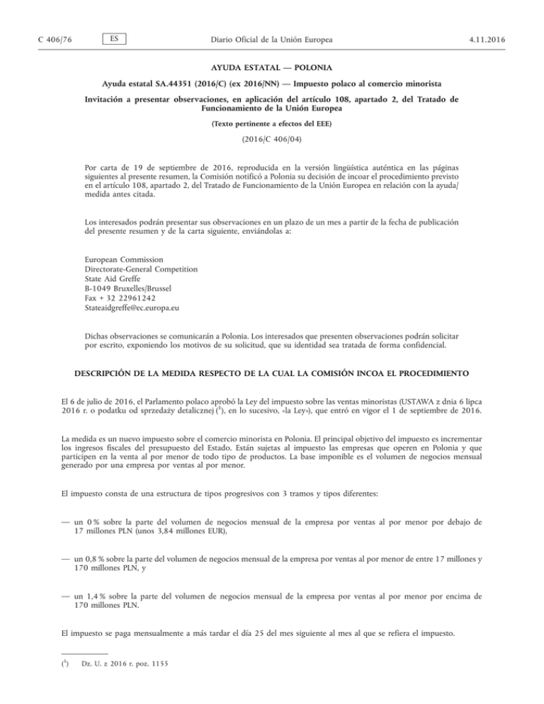 C 406/76 ES Diario Oficial de la Unión Europea 4.11.2016 AYUDA ESTATAL — POLONIA Ayuda estatal SA.44351 (2016/C) (ex 2016/NN) — Impuesto polaco al comercio minorista Invitación a presentar observaciones, en aplicación del artículo 108, apartado 2, del Tratado de Funcionamiento de la Unión Europea (Texto pertinente a efectos del EEE) (2016/C 406/04) Por carta de 19 de septiembre de 2016, reproducida en la versión lingüística auténtica en las páginas siguientes al presente resumen, la Comisión notificó a Polonia su decisión de incoar el procedimiento previsto en el artículo 108, apartado 2, del Tratado de Funcionamiento de la Unión Europea en relación con la ayuda/ medida antes citada. Los interesados podrán presentar sus observaciones en un plazo de un mes a partir de la fecha de publicación del presente resumen y de la carta siguiente, enviándolas a: European Commission Directorate-General Competition State Aid Greffe B-1049 Bruxelles/Brussel Fax + 32 22961242 [email protected] Dichas observaciones se comunicarán a Polonia. Los interesados que presenten observaciones podrán solicitar por escrito, exponiendo los motivos de su solicitud, que su identidad sea tratada de forma confidencial. DESCRIPCIÓN DE LA MEDIDA RESPECTO DE LA CUAL LA COMISIÓN INCOA EL PROCEDIMIENTO El 6 de julio de 2016, el Parlamento polaco aprobó la Ley del impuesto sobre las ventas minoristas (USTAWA z dnia 6 lipca 2016 r. o podatku od sprzedaży detalicznej (1), en lo sucesivo, «la Ley»), que entró en vigor el 1 de septiembre de 2016. La medida es un nuevo impuesto sobre el comercio minorista en Polonia. El principal objetivo del impuesto es incrementar los ingresos fiscales del presupuesto del Estado. Están sujetas al impuesto las empresas que operen en Polonia y que participen en la venta al por menor de todo tipo de productos. La base imponible es el volumen de negocios mensual generado por una empresa por ventas al por menor. El impuesto consta de una estructura de tipos progresivos con 3 tramos y tipos diferentes: — un 0 % sobre la parte del volumen de negocios mensual de la empresa por ventas al por menor por debajo de 17 millones PLN (unos 3,84 millones EUR), — un 0,8 % sobre la parte del volumen de negocios mensual de la empresa por ventas al por menor de entre 17 millones y 170 millones PLN, y — un 1,4 % sobre la parte del volumen de negocios mensual de la empresa por ventas al por menor por encima de 170 millones PLN. El impuesto se paga mensualmente a más tardar el día 25 del mes siguiente al mes al que se refiera el impuesto. (1) Dz. U. z 2016 r. poz. 1155 4.11.2016 ES Diario Oficial de la Unión Europea C 406/77 EVALUACIÓN DE LA MEDIDA Aunque un impuesto basado en el volumen de negocios, como tal, no plantea problemas en materia de ayuda estatal, la Comisión considera en esta fase que la progresividad de los tipos impositivos constituye ayuda estatal. La Comisión considera que los tipos impositivos progresivos establecen diferencias entre las empresas de ventas al por menor, que se encuentran en una situación fáctica y jurídica comparable respecto al objetivo del impuesto, sobre la base de su tamaño y su volumen de negocios, y concede una ventaja selectiva a las empresas con un volumen de negocios inferior. Las empresas con un volumen de negocios bajo tributan a un tipo medio sustancialmente más bajo que las empresas con un volumen de negocios alto, lo que alivia las cargas que las empresas con un volumen de negocios bajo deben soportar en comparación con las empresas con un volumen de negocios alto. Pueden justificarse impuestos progresivos sobre el volumen de negocios si el objetivo específico perseguido por el impuesto requiere tipos progresivos. No obstante, Polonia no ha demostrado que la progresividad de los tipos impositivos esté justificada por la lógica y la finalidad del impuesto, que consiste en recaudar fondos para el presupuesto general. Por tanto, la Comisión considera en esta fase que el carácter progresivo de los tipos impositivos constituye ayuda estatal, ya que todos los demás criterios para recibir esta calificación parecen cumplirse. Basándose en una evaluación preliminar, las medidas no parecen justificadas por la naturaleza o la estructura general del sistema ni compatibles con el mercado interior. Como el impuesto sobre las ventas minoristas, incluido su tipo progresivo, ha entrado recientemente en vigor y era aplicable en la fecha de la decisión, la Comisión considera necesario emitir un requerimiento de suspensión de conformidad con el artículo 13, apartado 1, del Reglamento (UE) 2015/1589 del Consejo (1). Un requerimiento de suspensión constituye una medida provisional que la Comisión puede adoptar y en la que pide a un Estado miembro que suspenda toda concesión de ayuda ilegal a la espera de una decisión final de la Comisión. (1) Véase el Reglamento (UE) 2015/1589 del Consejo, de 13 de julio de 2015, por el que se establecen normas detalladas para la aplicación del artículo 108 del Tratado de Funcionamiento de la Unión Europea (DO L 248 de 24.9.2015, p. 19). C 406/78 ES Diario Oficial de la Unión Europea 4.11.2016 TEXTO DE LA CARTA 1. PROCEDURA (1) Z informacji prasowych opublikowanych w lutym 2016 r. Komisja dowiedziała się, że Polska rozważa przyjęcie ustawy wprowadzającej podatek obrotowy od sprzedaży detalicznej obejmujący progresywne stawki podatku. (2) W dniach 11 lutego i 30 maja 2016 r. służby Komisji wystosowały do władz polskich dwa pisma, w których zwróciły się o więcej informacji na temat planowanej ustawy i wezwały władze polskie do skonsultowania się ze służbami Komisji przed jej przyjęciem. Służby Komisji podkreśliły podobieństwa między planowaną ustawą a węgierską opłatą z tytułu kontroli łańcucha żywnościowego i zwróciły uwagę władz polskich na przeprowadzoną przez Komisję wstępną ocenę pomocy państwa w związku z tą opłatą (1). Służby 