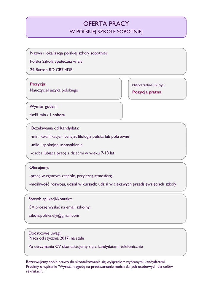 OFERTA PRACY W POLSKIEJ SZKOLE SOBOTNIEJ Nazwa i lokalizacja polskiej szkoły sobotniej: Polska Szkoła Społeczna w Ely 24 Barton RD CB7 4DE Pozycja: Nauczyciel języka polskiego Niepotrzebne usunąć: Pozycja płatna Wymiar godzin: 4x45 min / 1 sobota Oczekiwania od Kandydata: -min. kwalifikacje: licencjat filologia polska lub pokrewne Praca od (data): Styczeń 2017 -miłe i spokojne usposobienie -osoba lubiąca pracę z dziećmi w wieku 7-13 lat Oferujemy: -pracę w zgranym zespole, przyjazną atmosferę -możliwość rozwoju, udział w kursach; udział w ciekawych przedsięwzięciach szkoły Sposób aplikacji/kontakt: CV proszę wysłać na email szkolny: [email protected] Dodatkowe uwagi: Praca od stycznia 2017, na stałe Po otrzymaniu CV skontaktujemy się z kandydatami telefonicznie Rezerwujemy sobie prawo do skontaktowania się wyłącznie z wybranymi kandydatami. Prosimy o wpisanie ‘Wyrażam zgodę na przetwarzanie moich danych osobowych dla celów rekrutacji’.