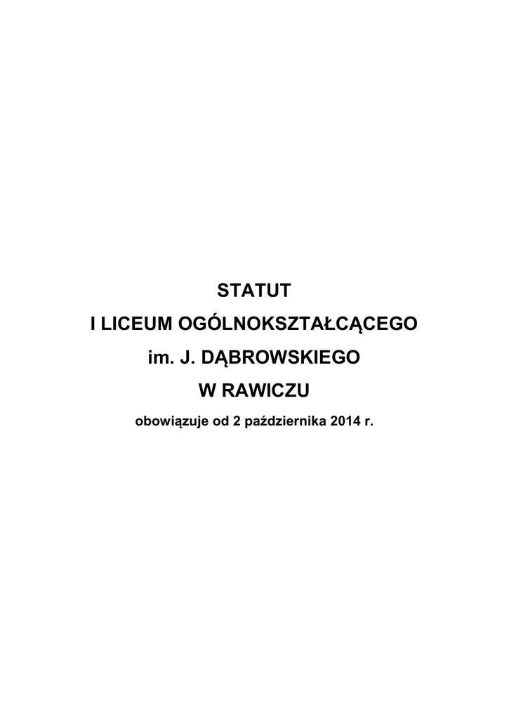 STATUT I LICEUM OGÓLNOKSZTAŁCĄCEGO im. J. DĄBROWSKIEGO W RAWICZU obowiązuje od 2 października 2014 r. SPIS TREŚCI ROZDZIAŁ I - INFORMACJE OGÓLNE O PLACÓWCE ................................................................... 3 ROZDZIAŁ II - MISJA SZKOŁY I MODEL ABSOLWENTA ............................................................... 4 ROZDZIAŁ III - CELE I ZADANIA SZKOŁY ...................................................................................... 6 ROZDZIAŁ IV - SPOSOBY REALIZACJI ZADAŃ SZKOŁY .............................................................. 9 ROZDZIAŁ V - ZASADY UDZIELANIA I ORGANIZACJI POMOCY PSYCHOLOGICZNO-PEDAGOGICZNEJ.............................................................. 14 ROZDZIAŁ VI - NAUCZANIE INDYWIDUALNE .............................................................................. 20 ROZDZIAŁ VII - INDYWIDUALNY TOK NAUKI, INDYWIDUALNY PROGRAM NAUKI .................. 21 ROZDZIAŁ VIII - ORGANY SZKOŁY I ICH KOMPETENCJE .......................................................... 23 ROZDZIAŁ IX - ORGANIZACJA NAUCZANIA I WYCHOWANIA .................................................... 32 ROZDZIAŁ X - ORGANIZACJA WYCHOWANIA I OPIEKI ............................................................. 35 ROZDZIAŁ XI - ORGANIZACJA SZKOŁY ...................................................................................... 38 ROZDZIAŁ XII - WEWNĄTRZSZKOLNY SYSTEM OCENIANIA .................................................... 44 ROZDZIAŁ XIII - ZASADY ZWALNIANIA UCZNIÓW I USPRAWIEDLIWIANIA NIEOBECNOŚCI NA ZAJĘCIACH SZKOLNYCH W LICEUM.......................................................... 55 ROZDZIAŁ XIV - NAUCZYCIELE I INNI PRACOWNICY SZKOŁY ................................................. 57 ROZDZIAŁ XV - PODSTAWOWE PRAWA I OBOWIĄZKI CZŁONKA SPOŁECZNOŚCI SZKOLNEJ .............................................................................. 68 ROZDZIAŁ XVI - UCZNIOWIE SZKOŁY ......................................................................................... 71 ROZDZIAŁ XVII - PRZEPISY KOŃCOWE ...................................................................................... 76 STATUT I LICEUM OGÓLNOKSZTAŁCĄCEGO im. J. DĄBROWSKIEGO W RAWICZU ROZDZIAŁ I INFORMACJE OGÓLNE O PLACÓWCE §1 1. I Liceum Ogólnokształcące im. Jarosława Dąbrowskiego w Rawiczu, zwane dalej Liceum, jest publiczną ponadgimnazjalną, szkołą ogólnokształcącą, która: 1) 2) 3) 4) 5) prowadzi bezpłatne nauczanie i wychowanie w zakresie ramowych planów nauczania; przeprowadza rekrutację uczniów w oparciu o zasadę powszechnej dostępności; zatrudnia nauczycieli posiadających kwalifikacje określone w odrębnych przepisach; realizuje programy nauczania uwzględniające podstawę programową kształcenia; realizuje ustalone przez Ministra Edukacji Narodowej zasady oceniania, klasyfikowania i promowania uczniów oraz przeprowadzania egzaminów i sprawdzianów. 2. Siedzibą Szkoły jest budynek wraz z działką przy ulicy Jarosława Dąbrowskiego 29 w Rawiczu. 3. Organem prowadzącym Liceum jest Powiat Rawicki. 4. Nadzór pedagogiczny nad Szkołą sprawuje Wielkopolski Kurator Oświaty. 5. Liceum Ogólnokształcące Dąbrowskiego w Rawiczu. 6. Ustalona nazwa używana jest w pełnym brzmieniu. 7. Czas trwania nauki w Liceum wynosi trzy lata. 8. Oferta kształcenia ogólnego w Liceum jest zgodna z ramowymi planami nauczania. 9. Dyrektor Liceum, w porozumieniu z Radą Szkoły, z uwzględnieniem zainteresowań uczniów oraz możliwości organizacyjnych, kadrowych i finansowych Liceum, wyznacza na początku etapu edukacyjnego dla danego oddziału lub zespołu od 2 do 4 przedmiotów, ujętych w podstawie programowej w zakresie rozszerzonym. używa nazwy: I Liceum Ogólnokształcące im. Jarosława 10. Ukończenie Liceum umożliwia uzyskanie świadectwa dojrzałości po zdaniu egzaminu maturalnego. 11. Szkoła jest jednostką budżetową. 3 STATUT I LICEUM OGÓLNOKSZTAŁCĄCEGO im. J. DĄBROWSKIEGO W RAWICZU ROZDZIAŁ II MISJA SZKOŁY I MODEL ABSOLWENTA §2 Szkoła opracowała Misję Szkoły i Model Absolwenta. Stanowią one integralną cześć oferty edukacyjnej, a osiągnięcie zawartych w nich założeń jest jednym z głównych celów Szkoły. Misja Szkoły Najważniejsze jest to, aby być kimś, kto nie przestaje się uczyć… Jan Paweł II Misja Szkoły zakłada, że istniejemy dla naszych uczniów, tych ambitnych, zdolnych, odpowiedzialnych, ale także dla tych mniej zdolnych i mniej ambitnych, mających problemy. Chcemy zapewnić każdemu uczniowi bezpieczne, przyjazne i jak najlepsze warunki rozwoju, stworzyć bogatą ofertę edukacyjną Szkoły, wyposażyć uczniów w wiedzę i umiejętności niezbędne do dalszego kształcenia, przygotować uczniów do życia w rodzinie i środowisku lokalnym, w ojczyźnie, w zjednoczonej Europie, jak również do odnalezienia się na rynku pracy we współczesnej rzeczywistości. Absolwent tej Szkoły będzie uczniem umiejącym współpracować w grupie, komunikować się z innymi, współtworzyć społeczeństwo informacyjne, odrzucać przemoc i agresję, szanować poglądy, znać cel i sens swojego istnienia. Nie możemy zapomnieć, że I Liceum Ogólnokształcące w Rawiczu to Szkoła z tradycjami i historią, to ludzie z nią związani, to absolwenci tej Szkoły, emerytowani nauczyciele. Model absolwenta Liceum Absolwent I Liceum Ogólnokształcące im. Jarosława Dąbrowskiego w Rawiczu to obywatel Europy XXI wieku, który: 1. Pielęgnuje tradycje narodowe i rodzinne, czuje się członkiem wspólnoty, w której żyje. 2. Szanuje odrębność narodową, kulturową i wyznaniową innych społeczeństw. 3. Jest przygotowany do pełnienia ról społecznych, do życia w rodzinie i społeczeństwie. 4. Posiada szeroką wiedzę przewidzianą programem nauczania, umożliwiającą mu podjęcie studiów i realizację życiowych celów, jest nastawiony na rozwój i rzetelną pracę. 5. 