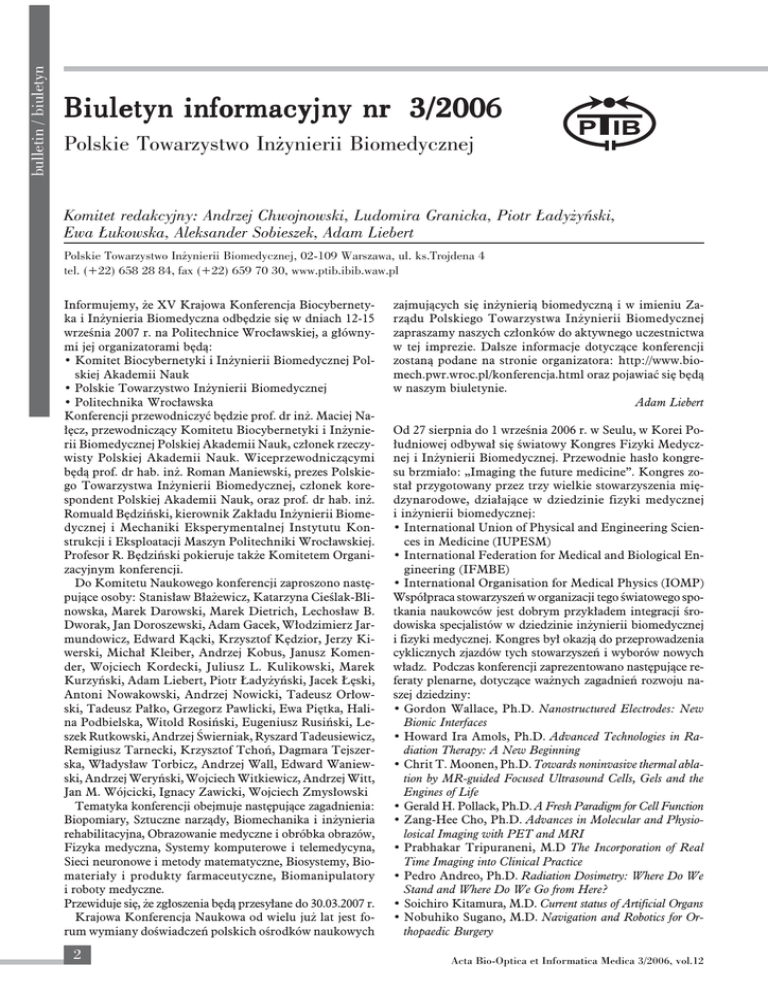 bulletin / biuletyn Biuletyn informacyjny nr 3/2006 Polskie Towarzystwo Inżynierii Biomedycznej Komitet redakcyjny: Andrzej Chwojnowski, Ludomira Granicka, Piotr Ładyżyński, Ewa Łukowska, Aleksander Sobieszek, Adam Liebert Polskie Towarzystwo Inżynierii Biomedycznej, 02-109 Warszawa, ul. ks.Trojdena 4 tel. (+22) 658 28 84, fax (+22) 659 70 30, www.ptib.ibib.waw.pl Informujemy, że XV Krajowa Konferencja Biocybernetyka i Inżynieria Biomedyczna odbędzie się w dniach 12-15 września 2007 r. na Politechnice Wrocławskiej, a głównymi jej organizatorami będą: • Komitet Biocybernetyki i Inżynierii Biomedycznej Polskiej Akademii Nauk • Polskie Towarzystwo Inżynierii Biomedycznej • Politechnika Wrocławska Konferencji przewodniczyć będzie prof. dr inż. Maciej Nałęcz, przewodniczący Komitetu Biocybernetyki i Inżynierii Biomedycznej Polskiej Akademii Nauk, członek rzeczywisty Polskiej Akademii Nauk. Wiceprzewodniczącymi będą prof. dr hab. inż. Roman Maniewski, prezes Polskiego Towarzystwa Inżynierii Biomedycznej, członek korespondent Polskiej Akademii Nauk, oraz prof. dr hab. inż. Romuald Będziński, kierownik Zakładu Inżynierii Biomedycznej i Mechaniki Eksperymentalnej Instytutu Konstrukcji i Eksploatacji Maszyn Politechniki Wrocławskiej. Profesor R. Będziński pokieruje także Komitetem Organizacyjnym konferencji. Do Komitetu Naukowego konferencji zaproszono następujące osoby: Stanisław Błażewicz, Katarzyna Cieślak-Blinowska, Marek Darowski, Marek Dietrich, Lechosław B. Dworak, Jan Doroszewski, Adam Gacek, Włodzimierz Jarmundowicz, Edward Kącki, Krzysztof Kędzior, Jerzy Kiwerski, Michał Kleiber, Andrzej Kobus, Janusz Komender, Wojciech Kordecki, Juliusz L. Kulikowski, Marek Kurzyński, Adam Liebert, Piotr Ładyżyński, Jacek Łęski, Antoni Nowakowski, Andrzej Nowicki, Tadeusz Orłowski, Tadeusz Pałko, Grzegorz Pawlicki, Ewa Piętka, Halina Podbielska, Witold Rosiński, Eugeniusz Rusiński, Leszek Rutkowski, Andrzej Świerniak, Ryszard Tadeusiewicz, Remigiusz Tarnecki, Krzysztof Tchoń, Dagmara Tejszerska, Władysław Torbicz, Andrzej Wall, Edward Waniewski, Andrzej Weryński, Wojciech Witkiewicz, Andrzej Witt, Jan M. Wójcicki, Ignacy Zawicki, Wojciech Zmysłowski Tematyka konferencji obejmuje następujące zagadnienia: Biopomiary, Sztuczne narządy, Biomechanika i inżynieria rehabilitacyjna, Obrazowanie medyczne i obróbka obrazów, Fizyka medyczna, Systemy komputerowe i telemedycyna, Sieci neuronowe i metody matematyczne, Biosystemy, Biomateriały i produkty farmaceutyczne, Biomanipulatory i roboty medyczne. Przewiduje się, że zgłoszenia będą przesyłane do 30.03.2007 r. Krajowa Konferencja Naukowa od wielu już lat jest forum wymiany doświadczeń polskich ośrodków naukowych 2 zajmujących się inżynierią biomedyczną i w imieniu Zarządu Polskiego Towarzystwa Inżynierii Biomedycznej zapraszamy naszych członków do aktywnego uczestnictwa w tej imprezie. Dalsze informacje dotyczące konferencji zostaną podane na stronie organizatora: http://www.biomech.pwr.wroc.pl/konferencja.html oraz pojawiać się będą w naszym biuletynie. Adam Liebert Od 27 sierpnia do 1 września 2006 r. w Seulu, w Korei Południowej odbywał się światowy Kongres Fizyki Medycznej i Inżynierii Biomedycznej. Przewodnie hasło kongresu brzmiało: „Imaging the future medicine”. Kongres został przygotowany przez trzy wielkie stowarzyszenia międzynarodowe, działające w dziedzinie fizyki medycznej i inżynierii biomedycznej: • International Union of Physical and Engineering Sciences in Medicine (IUPESM) • International Federation for Medical and Biological Engineering (IFMBE) • International Organisation for Medical Physics (IOMP) Współpraca stowarzyszeń w organizacji tego światowego spotkania naukowców jest dobrym przykładem integracji środowiska specjalistów w dziedzinie inżynierii biomedycznej i fizyki medycznej. Kongres był okazją do przeprowadzenia cyklicznych zjazdów tych stowarzyszeń i wyborów nowych władz. Podczas konferencji zaprezentowano następujące referaty plenarne, dotyczące ważnych zagadnień rozwoju naszej dziedziny: • Gordon Wallace, Ph.D. Nanostructured Electrodes: New Bionic Interfaces • Howard Ira Amols, Ph.D. Advanced Technologies in Radiation Therapy: A New Beginning • Chrit T. Moonen, Ph.D. Towards noninvasive thermal ablation by MR-guided Focused Ultrasound Cells, Gels and the Engines of Life • Gerald H. Pollack, Ph.D. A Fresh Paradigm for Cell Function • Zang-Hee Cho, Ph.D. Advances in Molecular and Physiolosical Imaging with PET and MRI • Prabhakar Tripuraneni, M.D The Incorporation of Real Time Imaging into Clinical Practice • Pedro Andreo, Ph.D. Radiation Dosimetry: Where Do We Stand and Where Do We Go from Here? • Soichiro Kitamura, M.D. Current status of Artificial Organs • Nobuhiko Sugano, M.D. Navigation and Robotics for Orthopaedic Burgery Acta Bio-Optica et Informatica Medica 3/2006, vol.12 8-10 czerwca 2006 r. w Wiśle odbyła się VI Konferencja „Membrany i Procesy Membranowe w Ochronie Środowiska”. Szeroka formuła konferencji obejmuje prawie wszystkie aspekty otrzymywania i wykorzystania membran półprzepuszczalnych, zarówno na etapie badań naukowych, jak i ich praktycznej aplikacji. Dzięki temu uczestnik konferencji ma doskonały przegląd obecnie prowadzonych prac Acta Bio-Optica et Informatica Medica 3/2006, vol.12 w Polsce w dziedzinie membran półprzepuszczalnych. Jednym z punktów programu były zastosowania medyczne membran. Dlatego aktywny udział w konferencji wzięli również członkowie PTIB. Konferencję otworzyły trzy referaty, dotyczące medycznych zastosowań membran półprzepuszczalnych. Spotkały się one z bardzo żywą reakcją słuchaczy, a dyskusja i pytania do autorów wyczerpały limit czasu i trwały podczas kolejnych przerw. W sesji posterowej było również kilka plakatów dotyczących zastosowań biomedycznych. Także i te doniesi