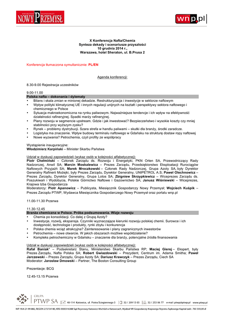 X Konferencja Nafta/Chemia Synteza dekady i scenariusze przyszłości 10 grudnia 2014 r., Warszawa, hotel Sheraton, ul. B.Prusa 2 Konferencja tłumaczona symultanicznie: PL/EN Agenda konferencji: 8.30-9.00 Rejestracja uczestników 9.00-11.00 Polska nafta – dokonania i dylematy • Bilans i skala zmian w minionej dekadzie. Restrukturyzacja i inwestycje w sektorze naftowym • Wpływ polityki klimatycznej UE i innych regulacji unijnych na kształt i perspektywy sektora naftowego i chemicznego w Polsce • Sytuacja makroekonomiczna na rynku paliwowym. Najważniejsze tendencje i ich wpływ na efektywność działalności rafineryjnej. Spadki marży rafineryjnej. • Plany rozwoju w segmencie upstream. Gdzie i jak inwestować? Bezpieczeństwo i wysokie koszty czy mniej stabilności przy wyższym zysku? • Rynek – problemy dystrybucji. Szara strefa w handlu paliwami – skutki dla branży, środki zaradcze. • Logistyka ma znaczenie. Wpływ budowy terminalu naftowego w Gdańsku na strukturę dostaw ropy naftowej • Nowe wyzwania? Petrochemia, czyli profity ze współpracy Wystąpienie inauguracyjne: Włodzimierz Karpiński – Minister Skarbu Państwa Udział w dyskusji zapowiedzieli (wykaz osób w kolejności alfabetycznej): Piotr Chełmiński – Członek Zarządu ds. Rozwoju i Energetyki, PKN Orlen SA, Przewodniczący Rady Nadzorczej, Anwil SA; Marcin Moskalewicz – Prezes Zarządu, Przedsiębiorstwo Eksploatacji Rurociągów Naftowych Przyjaźń SA; Marek Mroczkowski – Członek Rady Nadzorczej, Grupa Azoty SA, były Dyrektor Generalny Rafinerii Możejki, były Prezes Zarządu, Dyrektor Generalny, UNIPETROL A.S; Paweł Olechnowicz – Prezes Zarządu, Dyrektor Generalny, Grupa Lotos SA; Zbigniew Skrzypkiewicz – Wiceprezes Zarządu ds. Poszukiwań i Wydobycia, Polskie Górnictwo Naftowe i Gazownictwo SA; Janusz Wiśniewski – Wiceprezes, Krajowa Izba Gospodarcza Moderatorzy: Piotr Apanowicz – Publicysta, Miesięcznik Gospodarczy Nowy Przemysł; Wojciech Kuśpik – Prezes Zarządu PTWP, Wydawca Miesięcznika Gospodarczego Nowy Przemysł oraz portalu wnp.pl 11.00-11.30 Przerwa 11.30-12.45 Branża chemiczna w Polsce. Próba podsumowania. Wizje rozwoju • Chemia po konsolidacji. Co dalej z Grupą Azoty? • Inwestycje, rozwój, ekspansja. Czynniki wyznaczające kierunki rozwoju polskiej chemii. Surowce i ich dostępność, technologie i produkty, rynki zbytu i konkurencja • Polska chemia wciąż atrakcyjna? Zainteresowanie i plany zagranicznych inwestorów • Petrochemia – nowe otwarcie. W jakich obszarach możliwe współdziałanie? • Kompleks petrochemiczny w Gdańsku – znaczenie dla branży, potencjalne źródła finansowania Udział w dyskusji zapowiedzieli (wykaz osób w kolejności alfabetycznej): Rafał Baniak* – Podsekretarz Stanu, Ministerstwo Skarbu Państwa RP; Maciej Gierej – Ekspert, były Prezes Zarządu, Nafta Polska SA; Robert Gwiazdowski – Prezydent, Centrum im. Adama Smitha; Paweł Jarczewski – Prezes Zarządu, Grupa Azoty SA; Dariusz Krawczyk – Prezes Zarządu, Ciech SA Moderator: Jarosław Dmowski – Partner, The Boston Consulting Group Prezentacje: BCG 12.45-13.15 Przerwa 13.15-14.45 Produkty, koszty, marże. Na co stawia chemia? • Potęga nawozowa i co dalej? Specjalizacja jedyną drogą rozwoju? • Wydłużanie łańcuchów produktowych jako sposób na poprawę zyskowności firm. Inwestycje i ich finansowanie • W poszukiwaniu wyższej marży. Nowe produkty i atrakcyjne nisze rynkowe w Polsce, w Europie i na rynkach światowych. RSM. Środki ochrony roślin. • Efektywność produkcyjna i sprzedażowa. Współpraca z odbiorcami, nowa polityka sprzedaży, komplementarność oferty • Konsolidacja światowego biznesu nawozowego (fuzja Yary i CF), a nasze szanse eksportowe • Czynniki zewnętrzne wpływające na efektywność produkcji chemicznej – konsekwencje wejścia w życie umowy TTIP, trendy na rynku gazu, dostęp do surowców • Rola aktywności badawczo-rozwojowej. B&R – potencjalny obszar współdziałania branży chemicznej i petrochemicznej Udział w dyskusji zapowiedzieli (wykaz osób w kolejności alfabetycznej): Robert Jaworski – Członek Zarządu, Przedsiębiorstwo Spedycyjne Trade Trans Sp. z o.o.; Liliana Kania – Customer Service Team Leader Eastern Europe and Dow Construction Chemicals CS Leader Europe, Middle East and Africa (EMEA); Adam Leszkiewicz – Prezes Zarządu, Grupa Azoty Zakłady Azotowe Kędzierzyn SA; Cezary Możeński – Dyrektor, Instytut Nowych Syntez Chemicznych; Jacek Podgórski – Prezes Zarządu, Anwil SA; Zenon Pokojski – Wiceprezes Zarządu, Grupa Azoty Zakłady Azotowe Puławy SA; Witold Szczypiński – Wiceprezes Zarządu, Grupa Azoty SA; Tomasz Zieliński – Prezes Zarządu, Polska Izba Przemysłu Chemicznego Moderator: Jerzy Majchrzak – Dyrektor, Departament Innowacji i Przemysłu, Ministerstwo Gospodarki RP Prezentacja: Optymalizacja procesów technologicznych w oparciu o dedykowane rozwiązania Autodesk dla branż Nafta / Chemia. Sławomir Gabryjeluk – Territory Sales Manager Poland – Plant & Utility Solutions, Autodesk Polska 14.45-15.00 Przerwa 15.00-16.00 Chemia i petrochemia – droga do niezależności • Niestabilna sytuacja międzynarodowa a dostępność surowców. Jak przygotować się na ewentualne problemy z dostawami? • Jak firmy chemiczne i rafinerie w Polsce są przygotowane do działania w sytuacji ograniczeń czy nierytmiczności dostaw? Wykorzystanie doświadczeń z sytuacji kryzysowych • Możliwe działania zmniejszające ryzyko (własne złoża zagraniczne, udziały w gazociągach i współpraca z dostawcą, budowa własnej infrastruktury, wzajemna asekuracja wewnątrz branży) Udział w dyskusji zapowiedzieli (wykaz osób w kolejności alfabetycznej): Dirk Elvermann – Prezes, BASF Polska; Maciej Gierej – Ekspert, były Prezes Zarządu, Nafta Polska SA; Krzysztof Jałosiński – Wiceprezes Zarządu, Grupa Azoty; Cezary Możeński – Dyr