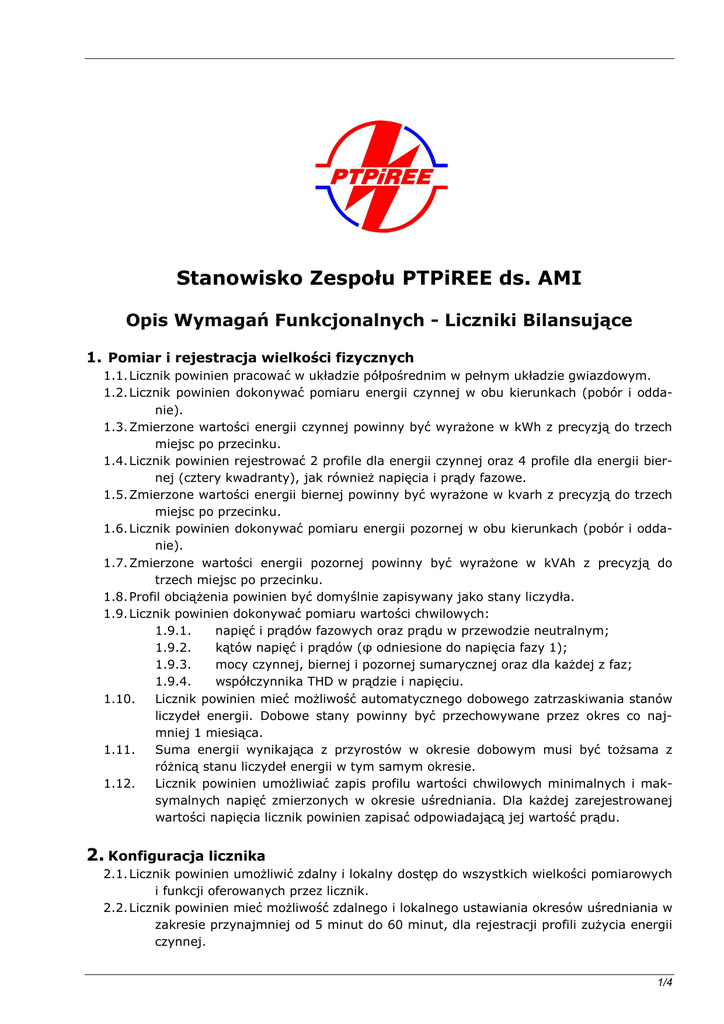 Stanowisko Zespołu PTPiREE ds. AMI Opis Wymagań Funkcjonalnych - Liczniki Bilansujące 1. Pomiar i rejestracja wielkości fizycznych 1.1. Licznik powinien pracować w układzie półpośrednim w pełnym układzie gwiazdowym. 1.2. Licznik powinien dokonywać pomiaru energii czynnej w obu kierunkach (pobór i oddanie). 1.3. Zmierzone wartości energii czynnej powinny być wyraŜone w kWh z precyzją do trzech miejsc po przecinku. 1.4. Licznik powinien rejestrować 2 profile dla energii czynnej oraz 4 profile dla energii biernej (cztery kwadranty), jak równieŜ napięcia i prądy fazowe. 1.5. Zmierzone wartości energii biernej powinny być wyraŜone w kvarh z precyzją do trzech miejsc po przecinku. 1.6. Licznik powinien dokonywać pomiaru energii pozornej w obu kierunkach (pobór i oddanie). 1.7. Zmierzone wartości energii pozornej powinny być wyraŜone w kVAh z precyzją do trzech miejsc po przecinku. 1.8. Profil obciąŜenia powinien być domyślnie zapisywany jako stany liczydła. 1.9. Licznik powinien dokonywać pomiaru wartości chwilowych: 1.9.1. napięć i prądów fazowych oraz prądu w przewodzie neutralnym; 1.9.2. kątów napięć i prądów (φ odniesione do napięcia fazy 1); 1.9.3. mocy czynnej, biernej i pozornej sumarycznej oraz dla kaŜdej z faz; 1.9.4. współczynnika THD w prądzie i napięciu. 1.10. Licznik powinien mieć moŜliwość automatycznego dobowego zatrzaskiwania stanów liczydeł energii. Dobowe stany powinny być przechowywane przez okres co najmniej 1 miesiąca. 1.11. Suma energii wynikająca z przyrostów w okresie dobowym musi być toŜsama z róŜnicą stanu liczydeł energii w tym samym okresie. 1.12. Licznik powinien umoŜliwiać zapis profilu wartości chwilowych minimalnych i maksymalnych napięć zmierzonych w okresie uśredniania. Dla kaŜdej zarejestrowanej wartości napięcia licznik powinien zapisać odpowiadającą jej wartość prądu. 2. Konfiguracja licznika 2.1. Licznik powinien umoŜliwić zdalny i lokalny dostęp do wszystkich wielkości pomiarowych i funkcji oferowanych przez licznik. 2.2. Licznik powinien mieć moŜliwość zdalnego i lokalnego ustawiania okresów uśredniania w zakresie przynajmniej od 5 minut do 60 minut, dla rejestracji profili zuŜycia energii czynnej. 1/4 2.3. W przypadku przerwania procesu parametryzacji (lokalnej lub zdalnej) licznik powinien kontynuować pracę zgodnie z dotychczasową parametryzacją. Do czasu potwierdzenia prawidłowości parametryzacji w sesji połączenia lokalnego lub zdalnego licznik powinien pozostać w ustawieniach sprzed przeprowadzanej zmiany. 2.4. Licznik powinien umoŜliwiać definiowanie co najmniej 1 progu przekroczenia i co najmniej 3 progów obniŜenia napięcia jako wartości procentowej odchylenia od napięcia znamionowego. Licznik powinien rozpocząć pomiar czasu trwania przekroczenia / obniŜenia napięcia, w okresie programowanym przez operatora (nie krótszym niŜ 1s), jeŜeli jego głębokość przekracza zadany próg. Licznik powinien zakończyć pomiar czasu trwania zdarzenia, jeŜeli wartość napięcia jest: • przy obniŜeniu wyŜsza od deklarowanego progu o [………………do uzupełnienia w postępowaniu przetargowym przez OSD………………….]%; • dla przekroczenia jeŜeli jest niŜsza o [………………do uzupełnienia w postępowaniu przetargowym przez OSD………………….]%. 3. Wykrywanie i rejestracja zdarzeń 3.1. Licznik powinien umoŜliwiać konfigurowanie trybu przesyłania komunikatów dla zdarzeń rejestrowanych przez licznik. Dla kaŜdego rodzaju zdarzenia moŜe zostać określony jeden z trybów: 3.1.1. tryb przesyłania automatycznego (natychmiastowego); 3.1.2. tryb odczytu sesyjnego (przy realizacji harmonogramu). 3.2. KaŜde zdarzenie zarejestrowanie przez licznik powinno być opisane następującymi atrybutami: 3.2.1. data i czas wystąpienia zdarzenia; 3.2.2. kod zdarzenia. 3.3. Dla zdarzeń wskazanych przez operatora, licznik powinien zapisywać stan liczydła energii czynnej skumulowanej w momencie ich wystąpienia. 4. Komunikacja 4.1. Licznik bilansujący moŜe stanowić samodzielne urządzenie lub urządzenie zintegrowane z koncentratorem danych. 4.2. Komunikacja lokalna z licznikiem stanowiącym samodzielne urządzenie powinna być moŜliwa przez optozłącze lub Ethernet/RJ45 lub USB, z wykorzystaniem IEC 6205621 lub DLMS. 4.3. Komunikacja lokalna z modułem licznikowym wchodzącym w skład urządzenia łączącego w sobie funkcje licznika i koncentratora danych powinna być moŜliwa w przynajmniej jeden z następujących sposobów: 4.3.1. przez optozłącze lub Ethernet/RJ45 lub USB, z wykorzystaniem IEC 6205621 lub DLMS; 4.3.2. przez Ethernet/RJ45 z wykorzystaniem interfejsu osiągalnego lokalnie przez przeglądarkę WWW, do którego dostęp jest autoryzowany. 4.4. Interfejsy licznika (lub urządzenia łączącego w sobie funkcje licznika i koncentratora danych) powinny umoŜliwiać przyłączenie modułu komunikacji 3GPP. 4.5. W przypadku licznika działającego jako samodzielne urządzenie, licznik powinien umoŜliwiać komunikację z koncentratorem przynajmniej za pomocą następujących rozwiązań: 4.5.1. moduł komunikacji z siecią rozległą w PLC zgodnie ze specyfikacją PRIME w wersji 1.3.6 lub nowszej (specyfikacja znajduje się w Załączniku XXX) oraz standardem komunikacji, opisanym w Załączniku YYY; 2/4 4.5.2. interfejs RS485. 4.6. Komunikacja z koncentratorem powinna spełniać dodatkowo następujące cechy: 4.6.1. licznik (lub urządzenie łączące w sobie funkcje licznika i koncentratora) powinno wspierać automatyczne wykrywanie i identyfikację licznika (modułu licznika) przez System Centralny i koncentrator (moduł koncentratora danych) w jego obszarze działania. Licznik (moduł licznika) powinien rozpocząć komunikację z urządzeniem nadrzędnym lub Systemem Centralnym bezpośrednio po podłączeniu zasilania. Status nawiązywania i nawiązania tej komunikacji powinien być sygnalizowany