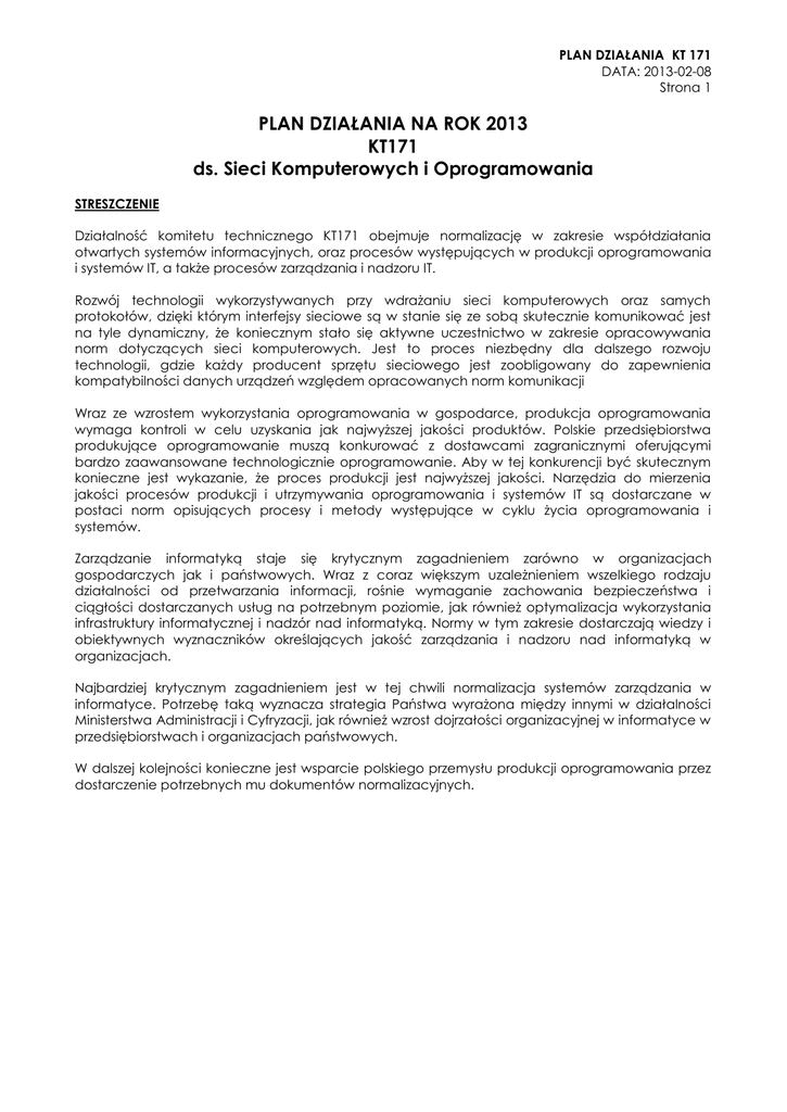PLAN DZIAŁANIA KT 171 DATA: 2013-02-08 Strona 1 PLAN DZIAŁANIA NA ROK 2013 KT171 ds. Sieci Komputerowych i Oprogramowania STRESZCZENIE Działalność komitetu technicznego KT171 obejmuje normalizację w zakresie współdziałania otwartych systemów informacyjnych, oraz procesów występujących w produkcji oprogramowania i systemów IT, a także procesów zarządzania i nadzoru IT. Rozwój technologii wykorzystywanych przy wdrażaniu sieci komputerowych oraz samych protokołów, dzięki którym interfejsy sieciowe są w stanie się ze sobą skutecznie komunikować jest na tyle dynamiczny, że koniecznym stało się aktywne uczestnictwo w zakresie opracowywania norm dotyczących sieci komputerowych. Jest to proces niezbędny dla dalszego rozwoju technologii, gdzie każdy producent sprzętu sieciowego jest zoobligowany do zapewnienia kompatybilności danych urządzeń względem opracowanych norm komunikacji Wraz ze wzrostem wykorzystania oprogramowania w gospodarce, produkcja oprogramowania wymaga kontroli w celu uzyskania jak najwyższej jakości produktów. Polskie przedsiębiorstwa produkujące oprogramowanie muszą konkurować z dostawcami zagranicznymi oferującymi bardzo zaawansowane technologicznie oprogramowanie. Aby w tej konkurencji być skutecznym konieczne jest wykazanie, że proces produkcji jest najwyższej jakości. Narzędzia do mierzenia jakości procesów produkcji i utrzymywania oprogramowania i systemów IT są dostarczane w postaci norm opisujących procesy i metody występujące w cyklu życia oprogramowania i systemów. Zarządzanie informatyką staje się krytycznym zagadnieniem zarówno w organizacjach gospodarczych jak i państwowych. Wraz z coraz większym uzależnieniem wszelkiego rodzaju działalności od przetwarzania informacji, rośnie wymaganie zachowania bezpieczeństwa i ciągłości dostarczanych usług na potrzebnym poziomie, jak również optymalizacja wykorzystania infrastruktury informatycznej i nadzór nad informatyką. Normy w tym zakresie dostarczają wiedzy i obiektywnych wyznaczników określających jakość zarządzania i nadzoru nad informatyką w organizacjach. Najbardziej krytycznym zagadnieniem jest w tej chwili normalizacja systemów zarządzania w informatyce. Potrzebę taką wyznacza strategia Państwa wyrażona między innymi w działalności Ministerstwa Administracji i Cyfryzacji, jak również wzrost dojrzałości organizacyjnej w informatyce w przedsiębiorstwach i organizacjach państwowych. W dalszej kolejności konieczne jest wsparcie polskiego przemysłu produkcji oprogramowania przez dostarczenie potrzebnych mu dokumentów normalizacyjnych. PLAN DZIAŁANIA KT 171 DATA: 2013-02-08 Strona 2 1 ŚRODOWISKO BIZNESOWE KT 1.1 Opis środowiska biznesowego Na działalność gospodarczą objętą zakresem KT znaczący wpływ mają następujące uwarunkowania polityczne, gospodarcze, techniczne, prawne, społeczne i/lub aspekty regionalne/międzynarodowe: Stan wiedzy w zakresie zarządzania informatyką, w tym produkcją oprogramowania jest w Polsce wysoki. Kadry w tej dziedzinie posiadają wysokie kwalifikacje. Problem stanowi niejednolitość podejść, brak wspólnego języka i brak metodycznego wdrażania najlepszych praktyk. Tymczasem wraz z coraz większą dostępnością do zaawansowanej technologii, a w szczególności coraz większej popularności rozwiązań typu „Cloud” spada zapotrzebowanie na wiedzę w zakresie technologii, a rośnie zapotrzebowanie na wiedzę w dziedzinie zarządzania technologią. Jednocześnie klienci technologii informacyjnej, zarówno w gospodarce jak i w instytucjach publicznych padają ofiarą niejasności w umowach na dostaczanie usług i zasobów informatycznych. Niejasności wynikają z niejednolitego języka i braku spójnych procesów zarządzania w informatyce. Normy w zakresie procesów i systemów zarządzania w informatyce mogą dostarczyć rozwiązania powyższego problemu przez umożliwienie niezależnego audytowania dostawców usług i zasobów informatycznych wyznaczając minimalne wymagania dla nich. Szczególnie ważne jest to w instytucjach państwowych, które nie mają możliwości swobodnego wyboru dostawcy i potrzebują obiektywnych wyznaczników jakości dostarczanych produktów i usług. W ostatnich latach na rynku pojawiły się nowe publikacje, które są źródłem wiedzy w zakresie zarządzania w informatyce, takie jak Cobit 5, ITIL 2011, czy TOGAF 9. Pozycje te, znajdując duże zainteresowanie w branży, zawierają wiele odniesień do norm międzynarodowych, które stanowią podstawę dla wspólnego rozumienia jak powinny wyglądać procesy i systemy zarządzania w informatyce. Interesariuszami zatem są: - regulatorzy, potrzebujący obiektywnych, uzgodnionych w branży wyznaczników, które mogą posłużyć w legislacji - organizacje państwowe, potrzebujące wsparcia w kształtowaniu umów i warunków przetargów - dostawcy usług i produktów, potrzebujący możliwości niezależnego udowodnienia wysokiej jakości oferowanych produktów i usług - przedsiębiorstwa prywatne, potrzebujące nabycia usług i zasobów informatycznych bez nabywania specjalistycznej wiedzy w tej dziedzinie - wszyscy obywatele, potrzebujący zapewnienia ich potrzeb pośredniego lub bezpośredniego dostępu do zasobów i usług informatycznych na odpowiednim poziomie 1.2 Wskaźniki ilościowe dotyczące środowiska biznesowego Poniższe wskaźniki ilościowe opisują środowisko biznesowe, w celu wsparcia działań KT poprzez zapewnienie niezbędnych danych: Organizacje oszczędzają średnio 30 % na zakupach oprogramowania po wdrożeniu procesów zarządzania zasobami w zakresie oprogramowania. Źródło: Gartner Dzięki sieci w 2009 r. wypracowano w Polsce 2,7 proc. PKB – podała dwa lata temu w głośnym raporcie „Polska internetowa” firma Boston Consulting Group. Już wtedy było to więcej, niż wynosił wkład górnictwa czy branży turystyczno-gastronomicznej. BCG prognozowa