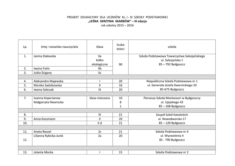 PROJEKT EDUKACYJNY DLA UCZNIÓW KL. I - III SZKOŁY PODSTAWOWEJ „LEŚNA SKRZYNIA SKARBÓW” – III edycja rok szkolny 2015 – 2016 Lp. 1. Imię i nazwisko nauczyciela Janina Dalewska klasa liczba dzieci szkoła IIa kółko ekologiczne IIb IIc 90 Szkoła Podstawowa Towarzystwa Salezjańskiego ul. Salezjańska 1 85 – 792 Bydgoszcz 2. 3. Iwona Fotin Julita Ścigany 4. 5. 6. Aleksandra Majewska Monika Sadzikowska Iwona Sobczak I II III 20 16 20 Niepubliczna Szkoła Podstawowa nr 1 ul. Generała Józefa Dwernickiego 10 85-675 Bydgoszcz 7. Joanna Koperianow Małgorzata Nawrocka klasa mieszana 10 8 1 Pierwsza Szkoła Montessori w Bydgoszczy ul. Ujejskiego 43 85 – 168 Bydgoszcz Anna Kossmann III II II d 21 20 21 Zespół Szkół Katolickich ul. Nowodworska 17 85 – 120 Bydgoszcz Aneta Reszel Lilianna Rybicka-Junik 2c 2a 21 20 Szkoła Podstawowa nr 4 ul. Wyzwolenia 4 85 - 790 Bydgoszcz I 15 Szkoła Podstawowa nr 2 8. 9. 10. 11. 12. 13. Jolanta Mocka ul. Hetmańska 34 85 - 039 Bydgoszcz Ewelina Perczyńska Elżbieta Nowaczyk III 16 II c 18 16. Violetta Furgol Katarzyna Kozłowska Izabela Plieth-Kalinowska Magdalena Wójcik Justyna Smolińska 17. 18. 14. 15. Szkoła Podstawowa 18 ul. Pijarów 4 85 - 360 Bydgoszcz Szkoła Podstawowa nr 25 Integracyjna ul. Grzymały Siedleckiego 11 85 – 868 Bydgoszcz III b 19 Bożena Sieracka Anna Bernacka III II 24 25 Szkoła Podstawowa nr 32 ul. Bałtycka 59 85 - 092 Bydgoszcz 19. 20. 21. Elżbieta Dymska Beata Szczutkowska Monika Najdek IIa IIb IIc 19 16 20 Szkoła Podstawowa nr 35 ul. Nakielska 273 85 - 391 Bydgoszcz 22. 23. 24. Ewa Hoffmann Danuta Gęsicka Karolina Kamińska II III IV V VI 20 16 11 12 11 Szkoła Podstawowa nr 43, ul. Kapliczna 85 - 776 Bydgoszcz 25. 26. 27. Elżbieta Zalewska Emilia Malińska Katarzyna Kowalczyk III II I 21 21 23 Szkoła Podstawowa nr 45, ul. Staroszkolna 12 85 - 209 Bydgoszcz 28. 29. Anna Cukras Maria Strabel II II 19 24 Szkoła Podstawowa nr 46, ul. Kombatantów 2 85 - 829 Bydgoszcz 30. 31. 32. 33. 34. 35. 36. Maria Tomaszek – Kosiak Beata Meisner - Kujawa Alicja Fafińska-Celińska Dagmara Wojciechowska Gabriela Kurek Kamila Ledzion Magda WIśniewska 37. 38. Barbara Starszak Bożena Głuszczyńska Hanna Osińska 39. 40. 41. 42. 43. 44. Teresa Raniszewska Maria Sadoch Mariola Kryszak Katarzyna Plewa Justyna Kantorska Alina Zienowicz 45. 46. 47. 48. 49. 50. 51. 52. 53. 54. Ewa Misko Marzena Murawska Ewelina Wardowska Ewa Jurasik Agnieszka Kocot-Wierska Maria Czarnecka Agata Hełminiak Elżbieta Wojnarowska Alina Karczyńska Renata Bukowska II IIb I III II II II 22 25 25 22 20 20 21 I 26 III 18 I I IIe II IIc II f 25 25 19 20 21 22 Szkoła Podstawowa nr 65 ul. Duracza 7 85 - 791 Bydgoszcz 1h 3d 1a 0a, 0b 1i 2c 1k 1g 2b 2f 22 24 22 42 21 20 21 23 25 21 Szkoła Podstawowa 66, ul. Berlinga 3 85 - 796 Bydgoszcz Szkoła Podstawowa nr 60 ul. Glinki 117 85 - 861 Bydgoszcz Szkoła Podstawowa nr 63 ul. Goszczyńskiego 3 85 - 134 Bydgoszcz