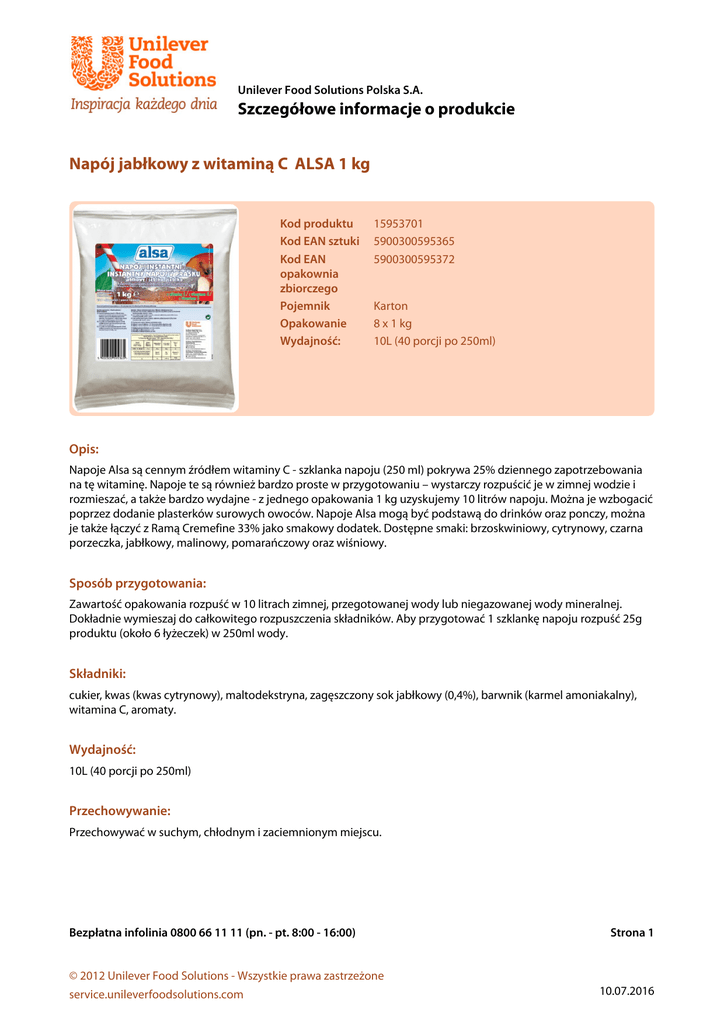 Unilever Food Solutions Polska S.A. Szczegółowe informacje o produkcie Napój jabłkowy z witaminą C ALSA 1 kg Kod produktu Kod EAN sztuki Kod EAN opakownia zbiorczego Pojemnik Opakowanie Wydajność: 15953701 5900300595365 5900300595372 Karton 8 x 1 kg 10L (40 porcji po 250ml) Opis: Napoje Alsa są cennym źródłem witaminy C - szklanka napoju (250 ml) pokrywa 25% dziennego zapotrzebowania na tę witaminę. Napoje te są również bardzo proste w przygotowaniu – wystarczy rozpuścić je w zimnej wodzie i rozmieszać, a także bardzo wydajne - z jednego opakowania 1 kg uzyskujemy 10 litrów napoju. Można je wzbogacić poprzez dodanie plasterków surowych owoców. Napoje Alsa mogą być podstawą do drinków oraz ponczy, można je także łączyć z Ramą Cremefine 33% jako smakowy dodatek. Dostępne smaki: brzoskwiniowy, cytrynowy, czarna porzeczka, jabłkowy, malinowy, pomarańczowy oraz wiśniowy. Sposób przygotowania: Zawartość opakowania rozpuść w 10 litrach zimnej, przegotowanej wody lub niegazowanej wody mineralnej. Dokładnie wymieszaj do całkowitego rozpuszczenia składników. Aby przygotować 1 szklankę napoju rozpuść 25g produktu (około 6 łyżeczek) w 250ml wody. Składniki: cukier, kwas (kwas cytrynowy), maltodekstryna, zagęszczony sok jabłkowy (0,4%), barwnik (karmel amoniakalny), witamina C, aromaty. Wydajność: 10L (40 porcji po 250ml) Przechowywanie: Przechowywać w suchym, chłodnym i zaciemnionym miejscu. Bezpłatna infolinia 0800 66 11 11 (pn. - pt. 8:00 - 16:00) Strona 1 © 2012 Unilever Food Solutions - Wszystkie prawa zastrzeżone service.unileverfoodsolutions.com 10.07.2016 Unilever Food Solutions Polska S.A. Szczegółowe informacje o produkcie Okres przydatności do spożycia: 12 miesięcy od daty produkcji. Bezpłatna infolinia 0800 66 11 11 (pn. - pt. 8:00 - 16:00) Strona 2 © 2012 Unilever Food Solutions - Wszystkie prawa zastrzeżone service.unileverfoodsolutions.com 10.07.2016