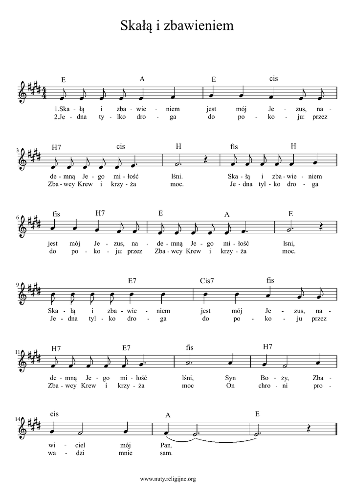 Skałą i zbawieniem 4 A E 1.Ska łą dna 2.Je 3 i ty zba lko wie dro cis H7 mój po Je ko H lśni. moc. H7 fis mój po Ska łą i zba wie Je dna tyl ko dro Ska Je 11 łą dna H7 E Je ko zus, na ju: przez de mną Je go mi łość Zba wcy Krew i krzy ża lsni, moc. fis i tyl zba ko Cis7 wie dro niem ga mi łość krzy ża cis wi wa mój mnie jest do mój po Je ko lśni, moc Syn On Bo chro A E Pan. sam. www.nuty.religijne.org zus, na ju przez H7 fis E7 ciel dzi niem ga E A E7 de mną Je go Zba wcy Krew i 14 zus, na ju: przez fis jest do 9 jest do H de mną Je go mi łość Zba wcy Krew i krzy ża 6 niem ga cis E ży, ni Zba pro