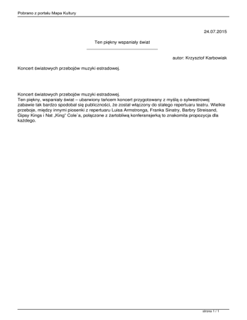Pobrano z portalu Mapa Kultury 24.07.2015 Ten piękny wspaniały świat ____________________________ autor: Krzysztof Karbowiak Koncert światowych przebojów muzyki estradowej. Koncert światowych przebojów muzyki estradowej. Ten piękny, wspaniały świat – ubarwiony tańcem koncert przygotowany z myślą o sylwestrowej zabawie tak bardzo spodobał się publiczności, że został włączony do stałego repertuaru teatru. Wielkie przeboje, między innymi piosenki z repertuaru Luisa Armstronga, Franka Sinatry, Barbry Streisand, Gipsy Kings i Nat „King” Cole`a, połączone z żartobliwą konferansjerką to znakomita propozycja dla każdego. strona 1 / 1