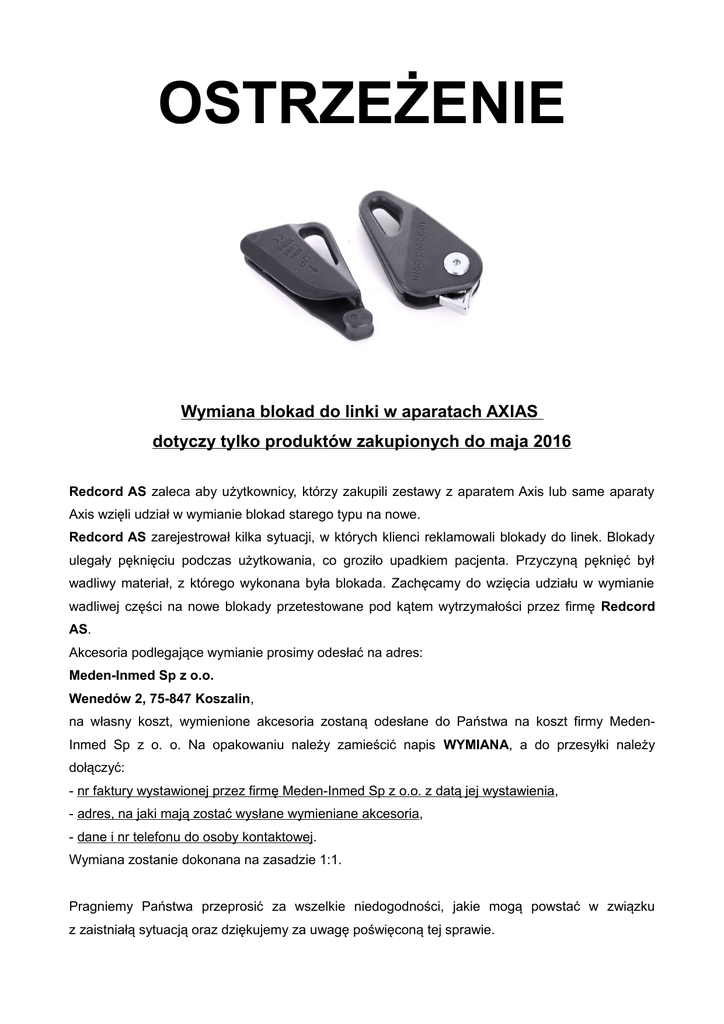 OSTRZEŻENIE Wymiana blokad do linki w aparatach AXIAS dotyczy tylko produktów zakupionych do maja 2016 Redcord AS zaleca aby użytkownicy, którzy zakupili zestawy z aparatem Axis lub same aparaty Axis wzięli udział w wymianie blokad starego typu na nowe. Redcord AS zarejestrował kilka sytuacji, w których klienci reklamowali blokady do linek. Blokady ulegały pęknięciu podczas użytkowania, co groziło upadkiem pacjenta. Przyczyną pęknięć był wadliwy materiał, z którego wykonana była blokada. Zachęcamy do wzięcia udziału w wymianie wadliwej części na nowe blokady przetestowane pod kątem wytrzymałości przez firmę Redcord AS. Akcesoria podlegające wymianie prosimy odesłać na adres: Meden-Inmed Sp z o.o. Wenedów 2, 75-847 Koszalin, na własny koszt, wymienione akcesoria zostaną odesłane do Państwa na koszt firmy MedenInmed Sp z o. o. Na opakowaniu należy zamieścić napis WYMIANA, a do przesyłki należy dołączyć: - nr faktury wystawionej przez firmę Meden-Inmed Sp z o.o. z datą jej wystawienia, - adres, na jaki mają zostać wysłane wymieniane akcesoria, - dane i nr telefonu do osoby kontaktowej. Wymiana zostanie dokonana na zasadzie 1:1. Pragniemy Państwa przeprosić za wszelkie niedogodności, jakie mogą powstać w związku z zaistniałą sytuacją oraz dziękujemy za uwagę poświęconą tej sprawie.