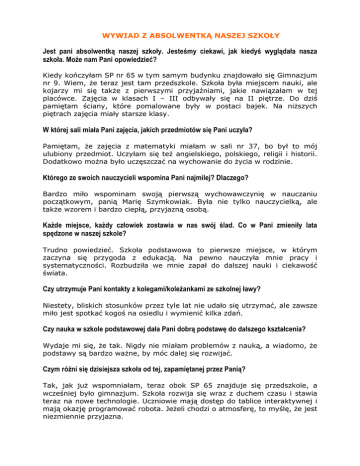 WYWIAD Z ABSOLWENTKĄ NASZEJ SZKOŁY Jest pani absolwentką naszej szkoły. Jesteśmy ciekawi, jak kiedyś wyglądała nasza szkoła. Może nam Pani opowiedzieć? Kiedy kończyłam SP nr 65 w tym samym budynku znajdowało się Gimnazjum nr 9. Wiem, że teraz jest tam przedszkole. Szkoła była miejscem nauki, ale kojarzy mi się także z pierwszymi przyjaźniami, jakie nawiązałam w tej placówce. Zajęcia w klasach I – III odbywały się na II piętrze. Do dziś pamiętam ściany, które pomalowane były w postaci bajek. Na niższych piętrach zajęcia miały starsze klasy. W której sali miała Pani zajęcia, jakich przedmiotów się Pani uczyła? Pamiętam, że zajęcia z matematyki miałam w sali nr 37, bo był to mój ulubiony przedmiot. Uczyłam się też angielskiego, polskiego, religii i historii. Dodatkowo można było uczęszczać na wychowanie do życia w rodzinie. Którego ze swoich nauczycieli wspomina Pani najmilej? Dlaczego? Bardzo miło wspominam swoją pierwszą wychowawczynię w nauczaniu początkowym, panią Marię Szymkowiak. Była nie tylko nauczycielką, ale także wzorem i bardzo ciepłą, przyjazną osobą. Każde miejsce, każdy człowiek zostawia w nas swój ślad. Co w Pani zmieniły lata spędzone w naszej szkole? Trudno powiedzieć. Szkoła podstawowa to pierwsze miejsce, w którym zaczyna się przygoda z edukacją. Na pewno nauczyła mnie pracy i systematyczności. Rozbudziła we mnie zapał do dalszej nauki i ciekawość świata. Czy utrzymuje Pani kontakty z kolegami/koleżankami ze szkolnej ławy? Niestety, bliskich stosunków przez tyle lat nie udało się utrzymać, ale zawsze miło jest spotkać kogoś na osiedlu i wymienić kilka zdań. Czy nauka w szkole podstawowej dała Pani dobrą podstawę do dalszego kształcenia? Wydaje mi się, że tak. Nigdy nie miałam problemów z nauką, a wiadomo, że podstawy są bardzo ważne, by móc dalej się rozwijać. Czym różni się dzisiejsza szkoła od tej, zapamiętanej przez Panią? Tak, jak już wspomniałam, teraz obok SP 65 znajduje się przedszkole, a wcześniej było gimnazjum. Szkoła rozwija się wraz z duchem czasu i stawia teraz na nowe technologie. Uczniowie mają dostęp do tablice interaktywnej i mają okazję programować robota. Jeżeli chodzi o atmosferę, to myślę, że jest niezmiennie przyjazna.