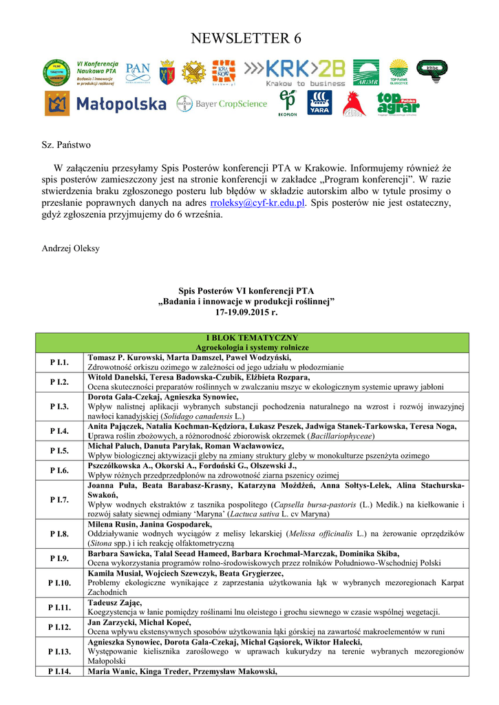 Newsletter 6 - VI Konferencja naukowa PTA