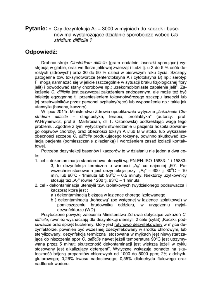 Pytanie: - Czy dezynfekcja A0 = 3000 w myjniach do kaczek i basenów ma wystarczające działanie sporobójcze wobec Clostridium difficile ? Odpowiedź: Drobnoustroje Clostridium difficile (gram dodatnie laseczki sporujące) występują w glebie, oraz we florze jelitowej zwierząt i ludzi tj. u 3 do 5 % osób dorosłych (zdrowych) oraz 30 do 50 % dzieci w pierwszym roku życia. Szczepy patogenne tzw. toksynotwórcze (enterotoksyna A i cytotoksyna B) np.: serotyp F, mogą namnażać się w jelicie (szczególnie w sytuacji braku fizjologicznej flory jelit) i powodować stany chorobowe np.: „rzekomobłoniaste zapalenie jelit”. Zakażenie C. difficile jest zazwyczaj zakażeniem endogennym, ale może też być infekcją egzogenną tj. przeniesieniem toksynotwórczego szczepu laseczki lub jej przetrwalników przez personel szpitalny(ręce) lub wyposażenie np.: takie jak utensylia (baseny, kaczory). W lipcu 2011r. Ministerstwo Zdrowia opublikowało wytyczne „Zakażenia Clostridium difficile – diagnostyka, terapia, profilaktyka” (autorzy: prof. W.Hryniewicz, prof.S. Martirosian, dr T. Ozonowski) podkreślając wagę tego problemu. Zgodnie z tymi wytycznymi stwierdzenie u pacjenta hospitalizowanego objawów choroby, oraz obecności toksyn A i/lub B w stolcu lub wykazanie obecności szczepu C. difficile produkującego toksynę, powinno skutkować izolacją pacjenta (pomieszczenie z łazienką) i wdrożeniem zasad izolacji kontaktowej. Potrzeba dezynfekcji basenów i kaczorów to w działaniu nie jeden a dwa cele: 1. cel – dekontaminacja standardowa utensylii wg PN-EN-ISO 15883- 1 i 158833, to dezynfekcja termiczna o wartości „A0” co najmniej „60”. Powszechnie stosowana jest dezynfekcja przy „A0” = 600 tj. 800C – 10 min, lub 900C - 1minuta lub 930C – 0,5 minuty. Niektórzy użytkownicy stosują też „A0” równe 1200 tj. 930C – 1 minuta. 2. cel - dekontaminacja utensylii tzw. izolatkowych (wydzielonego podsuwacza i kaczora) która jest : a ) dekontaminacją bieżącą w łazience chorego izolowanego b ) dekontaminacją „końcową” (po wstępnej w łazience izolatkowej) w pomieszczeniu brudownika oddziału, w urządzeniu myjnidezynfektorze (WD) Przytoczone powyżej zalecenia Ministerstwa Zdrowia dotyczące zakażeń C. difficile, również wyznaczają dla dezynfekcji utensylii 2 cele (cytat) „Kaczki, podsuwacze oraz sprzęt kuchenny, który jest rutynowo dezynfekowany w myjce dezynfektorze, powinien być wcześniej zdezynfekowany w środku chlorowym, lub sterylizowany, dezynfekcja termiczna stosowana w myjkach jest niewystarczająca do niszczenia spor C. difficile nawet jeżeli temperatura 900C jest utrzymywana przez 5 minut; skuteczność dekontaminacji jest większa jeżeli w cyklu stosowany jest alkalizujący detergent”. Wytyczne wskazują ponadto na skuteczność bójczą preparatów chlorowych od 1000 do 5000 ppm; 2% aldehydu glutarowego; 0,26% kwasu nadoctowego; 0,55% dialdehydu ftalowego oraz nadtlenek wodoru. Osiągnięcie dużego stopnia redukcji C. difficile w jednym procesie przy użyciu mgły lub gazu nadtlenku wodoru opisuje też dr P.Tarka (Zakażenia Nr 5 z 2015r) np.:  Szpital Francja /aHP/ redukcja z 18% do 2,2%  Szpital Wielka Brytania /aHP/ redukcja z 23,6% do 3,4%  Szpital USA /HPV/ redukcja z 25,6% do 0% Zalecenia normatywne dla WD opisane w normach PN-EN-ISO 15883-1 i 15883-3 wymagają , by temperatura na wszystkich powierzchniach wsadu podczas cyklu była w zakresie od -00C do +50C temperatury dezynfekcji. Norma PN-EN-ISO 15883-3 „Myjnie-dezynfektory cz. 3: Wymagania i badania dotyczące myjni-dezynfektorów przeznaczonych do dezynfekcji termicznej pojemników na odpady pochodzenia ludzkiego” wymaga by w myjniach istniała możliwość wstępnego ustawienia temperatury dezynfekcji i czasu w następujących dwóch zakresach:  zakres 1 – między 650C a 950C dla czasu od 1 s do 1godz. lub  zakres 2 – między 750C a 950C dla czasu od 1 s do 5 minut Możliwość ustawienia „A0” powinna być realizowana za pomocą kodu, „klucza” lub narzędzia. Użytkownik może więc, zależnie od charakteru ustawienia i celu działania myjni-dezynfektora, zaplanować „A0” – niezbędny i potrzebny stopień redukcji w jednym cyklu dezynfekcji termicznej. Dezynfekcja „wysokiego stopnia” - „A0” 3000 (800C – 5 min. lub 900C – 5 min. lub 930C 2,5 min.) dla utensylii nie jest standardowo wymagana jako „dezynfekcja końcowa” (utensylia to obszar niskiego lub średniego ryzyka wg Spauldinga). Nie mniej z uwagi na możliwy wysoki potencjał infekcyjny niektórych patogenów np.: takich jak toksynotwórcze szczepy Clostridium difficile, Szpitalne Zespoły Kontroli Zakażeń w przypadkach podobnych kontaminacji zalecają często dwa procesy dekontaminacji tj. jeden po drugim np: - dekontaminacja wstępna w preparacie chemicznym + proces w „WD” - dekontaminacja w „WD” jako dwa procesy jeden po drugim z równym lub różnym „IR” współczynnikiem redukcji drobnoustrojów (równym, lub różnym A0). Reasumując: - w każdej myjni część drobnoustrojów jest usuwana podczas mycia (mechaniczne usuwanie), ale część zostaje na powierzchni basenów i wymaga zabicia w procesie dezynfekcji. Na skuteczność działania myjni wobec spor wpływa długość procesu mycia przed dezynfekcją termiczną. W przypadku naczyń sanitarnych skażonych sporami toksynotwórczych szczepów Clostridium difficile nie wolno stosować tzw. krótkich cykli, ponieważ przy dużym obciążeniu biologicznym redukcja zanieczyszczenia jest niewystarczająca dla uzyskania skutecznej dezynfekcji. Dezynfekcja jako proces powinna być wówczas wykonana dwukrotnie z A0 w drugim cyklu nie niższym niż 3000. W działaniach praktycznych (w zależności od posiadanych lub nie urządzeń) finalną dezynfekcję termiczną można zastąpić dezynfekcją chemiczną „wysokiego stopnia” (B – 5log, F, V, Tbc, S – 4log). Zespół konsultantów PSSM Elżbi