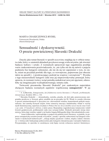 WIELKIE TEMATY KULTURY W LITERATURACH SŁOWIAŃSKICH Slavica Wratislaviensia CLXI • Wrocław 2015 • AUWr No 3632 MARTA CHASZCZEWICZ-RYDEL Uniwersytet Wrocławski, Polska [email protected] Sensualność i dyskursywność. O prozie powieściowej Slavenki Drakulić Zmysły jako temat literacki w sposób oczywisty znajdują się w orbicie tematu ciała, który w ostatnich dekadach przykuwa uwagę wielu artystów, jak również badaczy kultury i sztuki. Z rozmaitych opracowań tego zagadnienia przebija warte zaakcentowania przeświadczenie, że „nie tylko nie da się mówić o pojęciu podmiotu bez kategorii cielesności, ale nie da się też zapomnieć o tym, że ciało, miast na przykład powłoki dla tego, co wewnętrzne, pojmowane jest obecnie także na sposób […] przekraczający podział na wnętrze i zewnętrzne”1. Wynika z tego nieusuwalność kategorii ciała oraz jej nieprzewidywalny potencjał, który sprawia, że rozmaici twórcy wciąż potrafią zaskakiwać nowymi ujęciami, zdawałoby się imaginacyjnie wyeksploatowanego, tematu ciała. Twórczość prozatorska Slavenki Drakulić2 jest znakomitym materiałem służącym badaniu rozmaitych aspektów współczesnej somapoetyki3. W jej 1 A. Łebkowska, Somapoetyka, [w:] Kulturowa teoria literatury 2. Poetyki, problematyki, interpretacje, Kraków 2012, s. 114. 2 Slavenka Drakulić — dziennikarka, eseistka, pisarka, do dziś jako ponowoczesna emigrantka przebywa w Szwecji, gdzie osiedliła się na początku lat 90. Wtedy to została wliczona w poczet znienawidzonych w ojczyźnie tzw. chorwackich wiedźm, kontestatorek polityki nacjonalizmu. Jest autorką licznych esejów, które stanowią znaczący intelektualny wkład w rozwój myśli feministycznej, reportaży (wydane w Polsce Oni nie skrzywdziliby nawet muchy oraz Ciało z jej ciała. O banalności dobra), a także prozy fikcjonalnej zogniskowanej tematycznie wokół kwestii genderowych, problematyki ciała oraz sytuacji kobiet. Drakulić prowadzi stronę internetową, która daje rzetelny wgląd w jej bardzo bogatą bibliografię (http://slavenkadrakulic.com). 3 Anna Łebkowska, wprowadzając to pojęcie do polskiej teorii literatury, wyjaśniła, że poprzez somapoetykę rozumie przede wszystkim „zasady i sposoby uobecniania się kategorii cielesności w dyskursach kulturowych”, „relację między językiem i ciałem, między ciałem i literaturą”, w której ciało funkcjonuje jednocześnie jako kategoria interpretacyjna i narzędzie badawcze. Przypomnijmy, że zjawisko to zawdzięcza swój bujny rozwój zwłaszcza nurtowi feministycz- Slavica Wratislaviensia CLXI, 2015 © for this edition by CNS Zmysły 2.indb 357 2015-09-10 13:16:43 358 • Marta Chaszczewicz-Rydel utworach mamy do czynienia z egzemplifikacją procesu utekstowienia ciała4, uczynienia zeń nośnika treści kulturowych, egzystencjalnych, paradoksalnie też metafizycznych i ponadzmysłowych, nakierowujących na najważniejszą transgresję — przejście od życia do śmierci. Pisarka zwykle równolegle rozwija dyskursywnie przeprowadzoną myśl tożsamościową, realizowaną przez osadzenie głównej bohaterki w centrum intensywnej (emocjonalnej i zmysłowej) relacji interpersonalnej. Dzięki sąsiadowaniu refleksji tożsamościowej, tanatologicznej oraz odwołań do świata zmysłów na przykładzie prozy powieściowej Drakulić można śledzić literackie sposoby łączenia tego, co zmysłowo-cielesne, z tym, co myślowo-dyskursywne5. Takie ujęcie jest osiągnięciem końca XX wieku. Starożytni filozofowie prezentowali raczej nieufność względem rzeczywistości sensualnej, ponieważ jej obserwacja doprowadziła ich do sceptycyzmu oraz do stwierdzenia indywidualnego charakteru i niewspółmierności doświadczeń zmysłowych. Nie oznaczało to jednak zupełnego deprecjonowania zmysłów, łączyło się raczej z wytyczaniem wyraźnej granicy między percepcją — „ciemnym poznaniem” — a „korygującym świadectwo zmysłów”6 myśleniem, czyli „poznaniem jasnym”. Ujęcia nowoczesne przełamują opozycję między percepcją a rozumem, ukazując współzależność między tymi dwiema sferami i ich interakcje. W ślad za tym idą propozycje semantyzowania ciała za pomocą kategorii uwalniających od binarnych opozycji7. Chciałabym w tym miejscu zwrócić uwagę na ostatni fikcjonalny utwór Slavenki Drakulić, który tematykę ciała i zmysłów eksponuje przez nawiązania intersemiotyczne, synestezję, wreszcie przez wplecioną w tok narracji, pogłębioną analizę psychologiczną. Mowa o wydanej w 2007 roku w Chorwacji powieści Frida ili o boli (ang.: Frida’s bed). W utworze tym Drakulić beletryzuje postać Fridy Kahlo8, meksykańskiej malarki, która stała się ikoną kultury minionego stulecia. Gdy André Breton, przygotowując wystawę Kahlo w Paryżu, zaliczył nemu, przenosząc się również na prądy intelektualne, które z feminizmu wyewoluowały. Por. A. Łebkowska, op. cit. 4 Zagadnienie to opracowała m.in. Andrea Zlatar-Violić w książce: A. Zlatar, Tekst, tijelo, trauma: ogledi o suvremenoj ženskoj književnosti, Zagreb 2004. 5 Por. R. Nycz, Od teorii nowoczesnej do poetyki doświadczenia, [w:] Kulturowa teoria literatury 2…, s. 31–61. 6 R. Arnheim, Myślenie wzrokowe, przeł. M. Chojnacki, Gdańsk 2011. 7 Por. E. Grosz, Volatile Bodles. Toward Corporal Feminizm, przeł. M. Michalski, Biblioteka Online Think Tanku Feministycznego, kwiecień 2009. 8 Frida Kahlo (1907–1954) — autorka około dwustu obrazów, łączących osobistą, intymną tematykę (autoportrety) z elementami meksykańskiego folkloru oraz surrealizmu. O Kahlo jako artystce pozytywnie wyrażali się m.in. Pablo Picasso i Marcel Duchamp, choć pierwszą wystawę w rodzinnym kraju zorganizowano jej niespełna rok przed śmiercią, a prawdziwego uznania doczekała się dopiero w latach 80. Była dwukrotnie żoną Diega Rivery — słynnego muralisty i działacza komunistycznego 