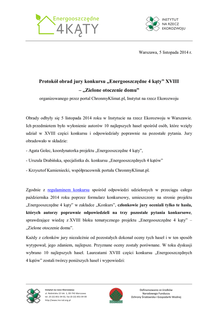 Warszawa, 5 listopada 2014 r. Protokół obrad jury konkursu „Energooszczędne 4 kąty” XVIII – „Zielone otoczenie domu” organizowanego przez portal ChronmyKlimat.pl, Instytut na rzecz Ekorozwoju Obrady odbyły się 5 listopada 2014 roku w Instytucie na rzecz Ekorozwoju w Warszawie. Ich przedmiotem było wyłonienie autorów 10 najlepszych haseł spośród osób, które wzięły udział w XVIII części konkursu i odpowiedziały poprawnie na pozostałe pytania. Jury obradowało w składzie: - Agata Golec, koordynatorka projektu „Energooszczędne 4 kąty”, - Urszula Drabińska, specjalistka ds. konkursu „Energooszczędnych 4 kątów” - Krzysztof Kamieniecki, współpracownik portalu ChronmyKlimat.pl. Zgodnie z regulaminem konkursu spośród odpowiedzi udzielonych w przeciągu całego października 2014 roku poprzez formularz konkursowy, umieszczony na stronie projektu „Energooszczędne 4 kąty” w zakładce „Konkurs”, członkowie jury oceniali tylko te hasła, których autorzy poprawnie odpowiedzieli na trzy pozostałe pytania konkursowe, sprawdzające wiedzę z XVIII bloku tematycznego projektu „Energooszczędne 4 kąty” – „Zielone otoczenie domu”. Każdy z członków jury niezależnie od pozostałych dokonał oceny tych haseł i w ten sposób wytypował, jego zdaniem, najlepsze. Przyznane oceny zostały porównane. W toku dyskusji wybrano 10 najlepszych haseł. Laureatami XVIII części konkursu „Energooszczędnych 4 kątów” zostali twórcy poniższych haseł i wypowiedzi: Instytut na rzecz Ekorozwoju ul. Nabielaka 15 lok. 1, 00-743 Warszawa tel. (0-22) 851 04 02, fax (0-22) 851 04 00 http://www.ine-isd.org.pl Dofinansowano ze środków Narodowego Funduszu Ochrony Środowiska i Gospodarki Wodnej Zamiast wznosić szare mury i ponure, smutne gmachy postaw krok w stronę natury i zielone promuj dachy. Jeśli w zielone otoczenie wokół domu zainwestujesz – nie pożałujesz! Bo zielone otoczenie poprawia energooszczędność, komfort mieszkania i nastawienie, a także... ma zbawienny wpływ na nasze zdrowie i usposobienie! Wiatr, przegrzanie Ci nie straszne – sadź iglaste, sadź liściaste :) Dom ci w lecie się nagrzewa – nasadź drzewa! One w lecie przyniosą w cieniu ukojenie, a w jesieni od wiatrów schronienie! Drzewa wkoło domu posadzone, rachunki mamy obniżone. Latem chłodzą nas listkami, w zimie grzeją słonecznymi promykami. 1. Oszczędność energii, ochrona przed wiatrami, poprawa jakości powietrza, buforowanie hałasu miejskiego, efektywny wygląd Twojego otoczenia - tle korzyści możesz uzyskać z odpowiedniego zagospodarowania roślinności wokół Twojego Domu! 2. By Ci nie wiało – posadź drzewo, by cieplej było – posadź drzewo, powietrze zdrowe - posadź drzewo by ładnie było – posadź drzewo! Nic tak nie służy miejskiej przestrzeni jak wśród budynków mnóstwo zieleni – zmniejsza to ilość węgla dwutlenku, chwilę wytchnienia daje wśród zgiełku. Rośliny zielone – dobro często niedocenione, chronią klimat, dbają o zdrowie i sprzyjają dobremu samopoczuciu wokół domu, Panie i Panowie! Roślinna zieleń zaułki i place porasta – nowy trend w przestrzeni miasta. Mój zielony dom w zielonym otoczeniu – przyczynia się do redukcji emisji na świecie. Wyniki XVIII konkursu „Energooszczędnych 4 kątów” opublikowane zostaną na stronie www projektu w zakładce „Laureaci” (wraz z protokołem obrad jury konkursu), a w późniejszym czasie mogą być wykorzystywane w celach promocyjnych projektu, m.in. na stronie na Facebooku. Instytut na rzecz Ekorozwoju ul. Nabielaka 15 lok. 1, 00-743 Warszawa tel. (0-22) 851 04 02, fax (0-22) 851 04 00 http://www.ine-isd.org.pl Dofinansowano ze środków Narodowego Funduszu Ochrony Środowiska i Gospodarki Wodnej Autorzy powyższych haseł o wygranej poinformowani zostaną drogą e-mailową. Po przekazaniu w określonym w regulaminie czasie imienia i nazwiska oraz adresu wysyłki otrzymają jeden z dziesięciu upominków. W tym miesiącu są nimi energooszczędne żarówki LED. Podpisano: Agata Golec Urszula Drabińska Krzysztof Kamieniecki Instytut na rzecz Ekorozwoju ul. Nabielaka 15 lok. 1, 00-743 Warszawa tel. (0-22) 851 04 02, fax (0-22) 851 04 00 http://www.ine-isd.org.pl Dofinansowano ze środków Narodowego Funduszu Ochrony Środowiska i Gospodarki Wodnej