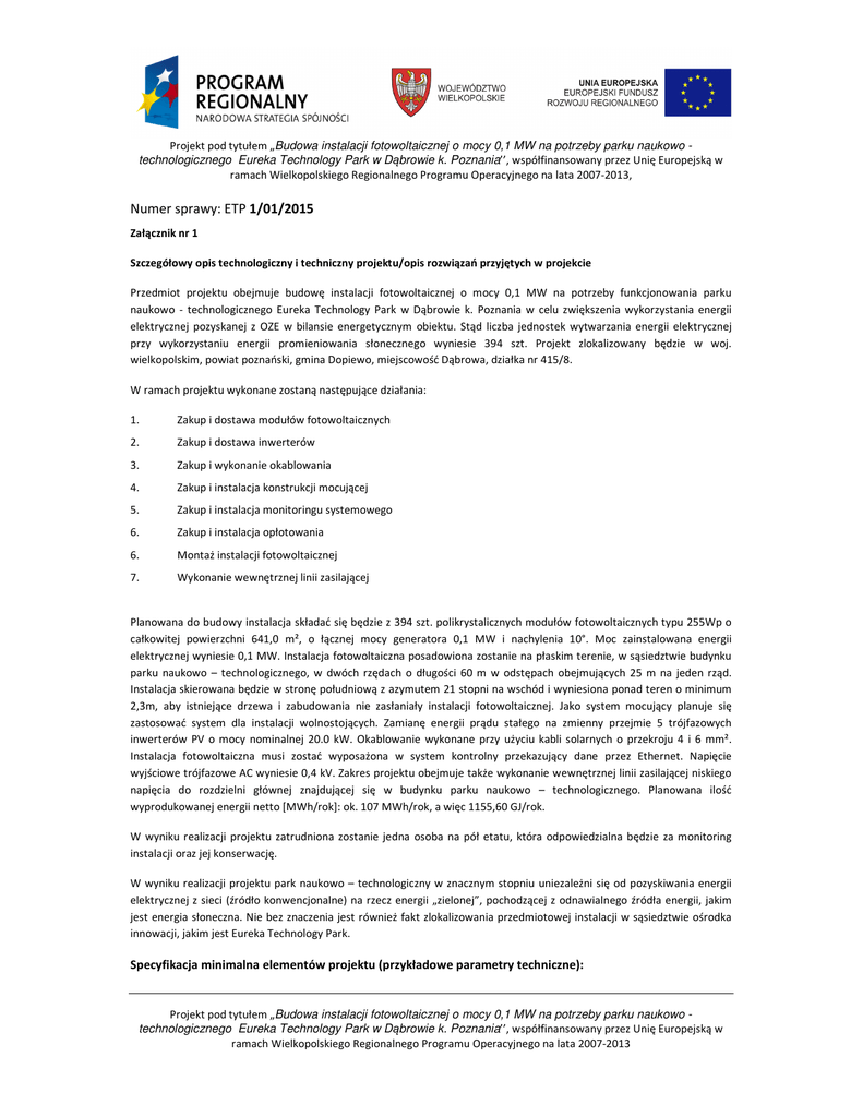 Projekt pod tytułem „Budowa instalacji fotowoltaicznej o mocy 0,1 MW na potrzeby parku naukowo technologicznego Eureka Technology Park w Dąbrowie k. Poznania’’, współfinansowany przez Unię Europejską w ramach Wielkopolskiego Regionalnego Programu Operacyjnego na lata 2007-2013, Numer sprawy: ETP 1/01/2015 Załącznik nr 1 Szczegółowy opis technologiczny i techniczny projektu/opis rozwiązań przyjętych w projekcie Przedmiot projektu obejmuje budowę instalacji fotowoltaicznej o mocy 0,1 MW na potrzeby funkcjonowania parku naukowo - technologicznego Eureka Technology Park w Dąbrowie k. Poznania w celu zwiększenia wykorzystania energii elektrycznej pozyskanej z OZE w bilansie energetycznym obiektu. Stąd liczba jednostek wytwarzania energii elektrycznej przy wykorzystaniu energii promieniowania słonecznego wyniesie 394 szt. Projekt zlokalizowany będzie w woj. wielkopolskim, powiat poznański, gmina Dopiewo, miejscowość Dąbrowa, działka nr 415/8. W ramach projektu wykonane zostaną następujące działania: 1. Zakup i dostawa modułów fotowoltaicznych 2. Zakup i dostawa inwerterów 3. Zakup i wykonanie okablowania 4. Zakup i instalacja konstrukcji mocującej 5. Zakup i instalacja monitoringu systemowego 6. Zakup i instalacja opłotowania 6. Montaż instalacji fotowoltaicznej 7. Wykonanie wewnętrznej linii zasilającej Planowana do budowy instalacja składać się będzie z 394 szt. polikrystalicznych modułów fotowoltaicznych typu 255Wp o całkowitej powierzchni 641,0 m², o łącznej mocy generatora 0,1 MW i nachylenia 10°. Moc zainstalowana energii elektrycznej wyniesie 0,1 MW. Instalacja fotowoltaiczna posadowiona zostanie na płaskim terenie, w sąsiedztwie budynku parku naukowo – technologicznego, w dwóch rzędach o długości 60 m w odstępach obejmujących 25 m na jeden rząd. Instalacja skierowana będzie w stronę południową z azymutem 21 stopni na wschód i wyniesiona ponad teren o minimum 2,3m, aby istniejące drzewa i zabudowania nie zasłaniały instalacji fotowoltaicznej. Jako system mocujący planuje się zastosować system dla instalacji wolnostojących. Zamianę energii prądu stałego na zmienny przejmie 5 trójfazowych inwerterów PV o mocy nominalnej 20.0 kW. Okablowanie wykonane przy użyciu kabli solarnych o przekroju 4 i 6 mm². Instalacja fotowoltaiczna musi zostać wyposażona w system kontrolny przekazujący dane przez Ethernet. Napięcie wyjściowe trójfazowe AC wyniesie 0,4 kV. Zakres projektu obejmuje także wykonanie wewnętrznej linii zasilającej niskiego napięcia do rozdzielni głównej znajdującej się w budynku parku naukowo – technologicznego. Planowana ilość wyprodukowanej energii netto [MWh/rok]: ok. 107 MWh/rok, a więc 1155,60 GJ/rok. W wyniku realizacji projektu zatrudniona zostanie jedna osoba na pół etatu, która odpowiedzialna będzie za monitoring instalacji oraz jej konserwację. W wyniku realizacji projektu park naukowo – technologiczny w znacznym stopniu uniezależni się od pozyskiwania energii elektrycznej z sieci (źródło konwencjonalne) na rzecz energii „zielonej”, pochodzącej z odnawialnego źródła energii, jakim jest energia słoneczna. Nie bez znaczenia jest również fakt zlokalizowania przedmiotowej instalacji w sąsiedztwie ośrodka innowacji, jakim jest Eureka Technology Park. Specyfikacja minimalna elementów projektu (przykładowe parametry techniczne): Projekt pod tytułem „Budowa instalacji fotowoltaicznej o mocy 0,1 MW na potrzeby parku naukowo technologicznego Eureka Technology Park w Dąbrowie k. Poznania’’, współfinansowany przez Unię Europejską w ramach Wielkopolskiego Regionalnego Programu Operacyjnego na lata 2007-2013 Powierzchnia generatora: Ilość modułów: Ilość inwerterów: Planowana ilość wyprodukowanej energii: Współczynnik mocy: 1. 2. 3. 641,0 m2 394 szt. 5 97 670,00 kWh/rok 972,14 kWh/kWp MODUŁY Zastosowane moduły: Ilość komórek: Ilość diod bocznikujących: Wymiary: Ciężar: Maksymalne napięcie: Maksymalne natężenia: Maksymalna moc: Maksymalne napięcie instalacji DC: 255 Wp 60 3 1640 x 992 x 38 mm 18,0 kg 38,3 V 8,85 A 255Wp -0Wp / +4,99Wp 1000V INWERTERY Zastosowane inwertery: Cos fi: Maksymalna moc DC: Maksymalna moc AC: Napięcie wyjściowe: Przyłącze: 1 20 000 W 3 x 230/400V, 50Hz 3-fazowe OKABLOWANIE Rodzaj okablowania: Straty mocy na okablowaniu: kabel solarny 4 i 6 mm2 <1% 4. ZAMOCOWANIA System mocujący: Konstrukcja stalowa ocynkowana wynosząca instalację fotowoltaiczną nad poziom terenu minimum 2,3m oraz aluminiowa z systemem mocowań paneli do konstrukcji stalowej. 5. OPŁOTOWANIE Płot z siatki stalowej ocynkowanej, malowanej. Wysokość: 2m Brama wjazdowa: Stalowa szer. 5 m. , dwuskrzydłowa 6. MONITORING Video: Systemowy: wchodzi w zakres ochrony instalacji - firma ochroniarska wbudowany w Inwerter, pełne dane do bieżącego monitoringu plus statystyki produkcji energii 7. Panele fotowoltaiczne muszą posiadać certyfikaty jakości uznanych europejskich instytutów badających jakość produktów na bieżąco podczas procesu produkcyjnego - czyli wdrożony wysokiej jakości system kontroli jakości np. niemiecki TUV Rheinland lub TUV Nord. 8. Panele fotowoltaiczne muszą posiadać wysoką odporność na utratę mocy z powodu warunków atmosferycznych nie mniejszą niż 80% po 25 latach eksploatacji. 9. Panele fotowoltaiczne muszą posiadać co najmniej 25-letnią liniową gwarancje wydajności. 10. Wykonawca musi dołączyć do oferty ważne certyfikaty potwierdzające zgodność modułów fotowoltaicznych z normami: IEC 61215:2005; IEC 61730-1:2004+A1:2011+A2:2013; IEC 61730-2:2004+A1:2011; Projekt pod tytułem „Budowa instalacji fotowoltaicznej o mocy 0,1 MW na potrzeby parku naukowo technologicznego Eureka Technology Park w Dąbrowie k. Poznania’’, współfinansowany przez Unię Europejską w ramach Wielkopolskiego Regionalnego Programu Operacyjnego na lata 2007-2013 - PV Cycle 11. Instalacja musi być w 
