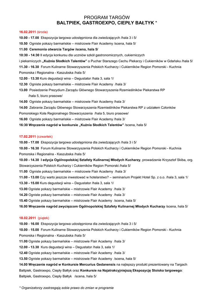PROGRAM TARGÓW BALTPIEK, GASTROEXPO, CIEPŁY BAŁTYK * 16.02.2011 (środa) 10.00 - 17.00 Ekspozycja targowa udostępniona dla zwiedzających /hala 3 i 5/ 10.50 Ogniste pokazy barmańskie – mistrzowie Flair Academy /scena, hala 5/ 11.00 Ceremonia otwarcia Targów /scena, hala 5/ 10:30 - 14:30 II edycja konkursu dla uczniów szkół gastronomicznych, cukierniczych i piekarniczych „Kuźnia Słodkich Talentów” o Puchar Starszego Cechu Piekarzy i Cukierników w Gdańsku /hala 5/ 11.30 - 16.30 Forum Kulinarne Stowarzyszenia Polskich Kucharzy i Cukierników Region Pomorski - Kuchnia Pomorska i Regionalna - Kaszubska /hala 5/ 12.00 - 13.30 Kurs degustacji wina – Degustator /hala 3, sala 1/ 12.30 Ogniste pokazy barmańskie – mistrzowie Flair Academy /hala 3/ 13.00 Posiedzenie Prezydium Zarządu Głównego Stowarzyszenia Rzemieślników Piekarstwa RP /hala 5, biuro prasowe/ 14.00 Ogniste pokazy barmańskie – mistrzowie Flair Academy /hala 3/ 14.00 Zebranie Zarządu Głównego Stowarzyszenia Rzemieślników Piekarstwa RP z udziałem Członków Pomorskiego Koła Regionalnego Stowarzyszenia /hala 5, biuro prasowe/ 16.00 Ogniste pokazy barmańskie – mistrzowie Flair Academy /hala 3/ 16:30 Wręczenie nagród w konkursie „Kuźnia Słodkich Talentów” /scena, hala 5/ 17.02.2011 (czwartek) 10.00 - 17.00 Ekspozycja targowa udostępniona dla zwiedzających /hala 3 i 5/ 10.00 - 16.30 Forum Kulinarne Stowarzyszenia Polskich Kucharzy i Cukierników Region Pomorski - Kuchnia Pomorska i Regionalna - Kaszubska /hala 5/ 10.00 - 14.30 I edycja Ogólnopolskiej Sztafety Kulinarnej Młodych Kucharzy, prowadzenie Krzysztof Skiba, org. Stowarzyszenia Polskich Kucharzy i Cukierników Region Pomorski /hala 5/ 11.00 Ogniste pokazy barmańskie – mistrzowie Flair Academy /hala 3/ 11.00 - 13.00 Czy warto jeszcze inwestować w hotelarstwo? – seminarium Projekt Hotel Sp. z o.o. /hala 3, sala 1/ 13.30 - 15.00 Kurs degustacji wina – Degustator /hala 3, sala 1/ 13.00 Ogniste pokazy barmańskie – mistrzowie Flair Academy /hala 3/ 14.20 Ogniste pokazy barmańskie – mistrzowie Flair Academy /hala 3/ 15.40 Ogniste pokazy barmańskie – mistrzowie Flair Academy /scena, hala 5/ 16.00 Wręczenie nagród zwycięzcom Ogólnopolskiej Sztafety Kulinarnej Młodych Kucharzy /scena, hala 5/ 18.02.2011 (piątek) 10.00 - 16.00 Ekspozycja targowa udostępniona dla zwiedzających /hala 3 i 5/ 10.00 - 15.00 Forum Kulinarne Stowarzyszenia Polskich Kucharzy i Cukierników Region Pomorski - Kuchnia Pomorska i Regionalna - Kaszubska /hala 5/ 11.00 Ogniste pokazy barmańskie – mistrzowie Flair Academy /hala 3/ 12.00 - 13.30 Kurs degustacji wina – Degustator /hala 3, sala 1/ 12.40 Ogniste pokazy barmańskie – mistrzowie Flair Academy /hala 3/ 13.50 Ogniste pokazy barmańskie – mistrzowie Flair Academy /scena, hala 5/ 14.00 Wręczenie nagród w Konkursie Mercurius Gedanensis na najlepszy produkt prezentowany na Targach Baltpiek, Gastroexpo, Ciepły Bałtyk oraz Konkursie na Najatrakcyjniejszą Ekspozycję Stoiska targowego: Baltpiek, Gastroexpo, Ciepły Bałtyk /scena, hala 5/ * Organizatorzy zastrzegają sobie prawo do zmian w programie