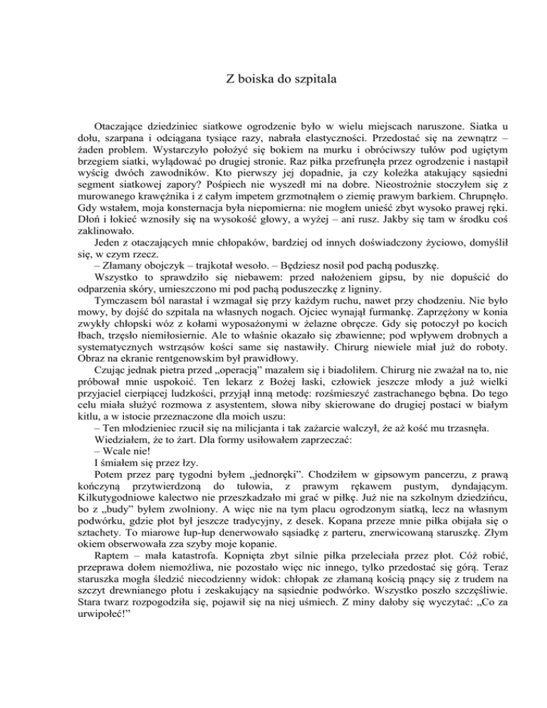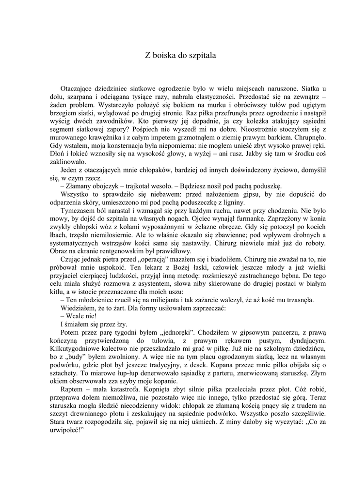 Z boiska do szpitala Otaczające dziedziniec siatkowe ogrodzenie było w wielu miejscach naruszone. Siatka u dołu, szarpana i odciągana tysiące razy, nabrała elastyczności. Przedostać się na zewnątrz – żaden problem. Wystarczyło położyć się bokiem na murku i obróciwszy tułów pod ugiętym brzegiem siatki, wylądować po drugiej stronie. Raz piłka przefrunęła przez ogrodzenie i nastąpił wyścig dwóch zawodników. Kto pierwszy jej dopadnie, ja czy koleżka atakujący sąsiedni segment siatkowej zapory? Pośpiech nie wyszedł mi na dobre. Nieostrożnie stoczyłem się z murowanego krawężnika i z całym impetem grzmotnąłem o ziemię prawym barkiem. Chrupnęło. Gdy wstałem, moja konsternacja była niepomierna: nie mogłem unieść zbyt wysoko prawej ręki. Dłoń i łokieć wznosiły się na wysokość głowy, a wyżej – ani rusz. Jakby się tam w środku coś zaklinowało. Jeden z otaczających mnie chłopaków, bardziej od innych doświadczony życiowo, domyślił się, w czym rzecz. – Złamany obojczyk – trajkotał wesoło. – Będziesz nosił pod pachą poduszkę. Wszystko to sprawdziło się niebawem: przed nałożeniem gipsu, by nie dopuścić do odparzenia skóry, umieszczono mi pod pachą poduszeczkę z ligniny. Tymczasem ból narastał i wzmagał się przy każdym ruchu, nawet przy chodzeniu. Nie było mowy, by dojść do szpitala na własnych nogach. Ojciec wynajął furmankę. Zaprzężony w konia zwykły chłopski wóz z kołami wyposażonymi w żelazne obręcze. Gdy się potoczył po kocich łbach, trzęsło niemiłosiernie. Ale to właśnie okazało się zbawienne; pod wpływem drobnych a systematycznych wstrząsów kości same się nastawiły. Chirurg niewiele miał już do roboty. Obraz na ekranie rentgenowskim był prawidłowy. Czując jednak pietra przed „operacją” mazałem się i biadoliłem. Chirurg nie zważał na to, nie próbował mnie uspokoić. Ten lekarz z Bożej łaski, człowiek jeszcze młody a już wielki przyjaciel cierpiącej ludzkości, przyjął inną metodę: rozśmieszyć zastrachanego bębna. Do tego celu miała służyć rozmowa z asystentem, słowa niby skierowane do drugiej postaci w białym kitlu, a w istocie przeznaczone dla moich uszu: – Ten młodzieniec rzucił się na milicjanta i tak zażarcie walczył, że aż kość mu trzasnęła. Wiedziałem, że to żart. Dla formy usiłowałem zaprzeczać: – Wcale nie! I śmiałem się przez łzy. Potem przez parę tygodni byłem „jednoręki”. Chodziłem w gipsowym pancerzu, z prawą kończyną przytwierdzoną do tułowia, z prawym rękawem pustym, dyndającym. Kilkutygodniowe kalectwo nie przeszkadzało mi grać w piłkę. Już nie na szkolnym dziedzińcu, bo z „budy” byłem zwolniony. A więc nie na tym placu ogrodzonym siatką, lecz na własnym podwórku, gdzie płot był jeszcze tradycyjny, z desek. Kopana przeze mnie piłka obijała się o sztachety. To miarowe łup-łup denerwowało sąsiadkę z parteru, znerwicowaną staruszkę. Złym okiem obserwowała zza szyby moje kopanie. Raptem – mała katastrofa. Kopnięta zbyt silnie piłka przeleciała przez płot. Cóż robić, przeprawa dołem niemożliwa, nie pozostało więc nic innego, tylko przedostać się górą. Teraz staruszka mogła śledzić niecodzienny widok: chłopak ze złamaną kością pnący się z trudem na szczyt drewnianego płotu i zeskakujący na sąsiednie podwórko. Wszystko poszło szczęśliwie. Stara twarz rozpogodziła się, pojawił się na niej uśmiech. Z miny dałoby się wyczytać: „Co za urwipołeć!”