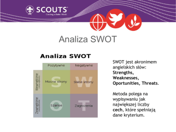 Analiza SWOT SWOT jest akronimem angielskich słów: Strengths, Weaknesses, Oportunities, Threats. Metoda polega na wypisywaniu jak największej liczby cech, które spełniają dane kryterium. Pogłębiona analiza SWOT • • • • • • • • Aby do tego dojść, musimy się zastanowić, jakie są zależności między mocnymi/ słabymi stronami a szansami/ zagrożeniami: Czy dana mocna strona pozwoli nam wykorzystać daną szansę? Czy dana mocna strona pozwoli nam zniwelować dane zagrożenie? Czy dana słaba strona ogranicza możliwość wykorzystania danej szansy? Czy dana słaba strona potęguje ryzyko związane z danym zagrożeniem? Jak łatwo wywnioskować analizę można też przeprowadzić w odwrotnym kierunku, tzn. od zewnątrz do wewnątrz: Czy dana szansa wzmacnia daną silną stronę? Czy dana szansa pozwala zniwelować daną słabość? Czy dane zagrożenie niweluje daną silną stronę? Czy dane zagrożenie uwypukla daną słabość? Pogłębiona analiza SWOT • Teraz każdemu powiązaniu przyznamy określoną liczbę punktów. Jeżeli np. dana mocna strona pozwoli nam wykorzystać daną szansę w silny sposób, dajemy takiemu powiązaniu 2 pkt. Jeżeli pozwoli nam wykorzystać daną szansę słabiej, tylko częściowo – dajemy 1. Jeżeli w ogóle nie ma oddziaływania – dajemy 0. Tabela będzie wyglądać np. tak, jak tak przedstawiona obok. Jeżeli mocna strona (S1) silnie oddziałuje z szansą (O1), na przecięciu wpisujemy 2. Przy mocno rozbudowanej analizie, z wieloma czynnikami (powyżej zaproponowaliśmy ich bardzo dużo), najlepiej tabelę stworzyć w arkuszu kalkulacyjnym np. w Ms Excel. O1 O2 O3 O4 T1 T2 T3 T4 S1 2 1 0 2 0 0 1 0 S2 0 2 2 0 2 0 1 0 S3 0 2 0 2 0 0 0 2 S4 0 2 2 1 0 1 0 1 W1 0 1 0 1 0 2 0 1 W2 0 1 0 0 0 0 0 0 W3 0 0 1 0 0 0 2 0 W4 0 1 0 0 2 0 0 0 Pogłębiona analiza SWOT Jak widzimy, powyższa tabela została podzielona na cztery ćwiartki. Sumujemy punkty w każdej z nich. W zależności od tego, w której uzyskaliśmy najwięcej punktów, możemy dowiedzieć się, jaka jest najwłaściwsza strategia działania. Pozwoli nam to na dobór odpowiednich celów. Szanse (O) Zagrożenia (T) Siły (S) Strategia agresywna Strategia konserwatywna Słabości (W) Strategia konkurencyjna Strategia defensywna Strategie Strategia agresywna: Przeważają mocne strony, a w otoczeniu grupy silnie powiązane z nimi szanse. Strategia agresywna to taka, która pozwala na silny rozwój, wykorzystujący obydwa czynniki. Możesz stawiać ambitne cele, wykorzystując zarówno silne strony, jak i szanse. Strategia konserwatywna: Grupa działa w niekorzystnym dla siebie otoczeniu zewnętrznym, ale posiada silnie powiązany z zagrożeniami zewnętrznymi zespół mocnych stron wewnętrznych, jest więc w stanie zdecydowanie odpowiedzieć na zagrożenia. W istniejącym otoczeniu grupa nie jest w stanie intensywnie się rozwijać, gdyż zespół mocnych stron nie koresponduje z szansami otoczenia, niemniej jednak jest w stanie skutecznie przezwyciężać zagrożenia w oczekiwaniu na poprawę warunków zewnętrznych. Zastanów się, jak zapobiec zagrożeniom, wykorzystując silne strony grupy. Strategie Strategia konkurencyjna: Grupa posiada przewagę słabych stron nad mocnymi, ale funkcjonuje w przyjaznym dla siebie otoczeniu, co pozwala jej utrzymywać swoją pozycję. Niemniej jednak słabość wewnętrzna uniemożliwia skuteczne wykorzystanie szans, które daje otoczenie zewnętrzne, strategia konkurencyjna powinna więc koncentrować się na takim eliminowaniu wewnętrznych słabości, aby w przyszłości lepiej wykorzystać szanse otoczenia. Strategia defensywna: Słabe strony grupy są silnie powiązane z zewnętrznymi zagrożeniami, istnieje duże ryzyko upadku. Strategia defensywna jest strategią nastawioną na przetrwanie w środowisku.