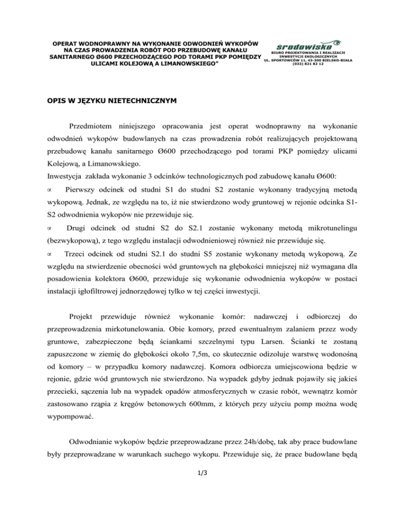 OPERAT WODNOPRAWNY NA WYKONANIE ODWODNIEŃ WYKOPÓW NA CZAS PROWADZENIA ROBÓT POD PRZEBUDOWĘ KANAŁU SANITARNEGO Ø600 PRZECHODZĄCEGO POD TORAMI PKP POMIĘDZY ULICAMI KOLEJOWĄ A LIMANOWSKIEGO” BIURO PROJEKTOWANIA I REALIZACJI INWESTYCJI EKOLOGICZNYCH UL. SPORTOWCÓW 11, 43-300 BIELSKO-BIAŁA (033) 821 82 12 OPIS W JĘZYKU NIETECHNICZNYM Przedmiotem niniejszego opracowania jest operat wodnoprawny na wykonanie odwodnień wykopów budowlanych na czas prowadzenia robót realizujących projektowaną przebudowę kanału sanitarnego Ø600 przechodzącego pod torami PKP pomiędzy ulicami Kolejową, a Limanowskiego. Inwestycja zakłada wykonanie 3 odcinków technologicznych pod zabudowę kanału Ø600: • Pierwszy odcinek od studni S1 do studni S2 zostanie wykonany tradycyjną metodą wykopową. Jednak, ze względu na to, iŜ nie stwierdzono wody gruntowej w rejonie odcinka S1S2 odwodnienia wykopów nie przewiduje się. • Drugi odcinek od studni S2 do S2.1 zostanie wykonany metodą mikrotunelingu (bezwykopową), z tego względu instalacji odwodnieniowej równieŜ nie przewiduje się. • Trzeci odcinek od studni S2.1 do studni S5 zostanie wykonany metodą wykopową. Ze względu na stwierdzenie obecności wód gruntowych na głębokości mniejszej niŜ wymagana dla posadowienia kolektora Ø600, przewiduje się wykonanie odwodnienia wykopów w postaci instalacji igłofiltrowej jednorzędowej tylko w tej części inwestycji. Projekt przewiduje równieŜ wykonanie komór: nadawczej i odbiorczej do przeprowadzenia mirkotunelowania. Obie komory, przed ewentualnym zalaniem przez wody gruntowe, zabezpieczone będą ściankami szczelnymi typu Larsen. Ścianki te zostaną zapuszczone w ziemię do głębokości około 7,5m, co skutecznie odizoluje warstwę wodonośną od komory – w przypadku komory nadawczej. Komora odbiorcza umiejscowiona będzie w rejonie, gdzie wód gruntowych nie stwierdzono. Na wypadek gdyby jednak pojawiły się jakieś przecieki, sączenia lub na wypadek opadów atmosferycznych w czasie robót, wewnątrz komór zastosowano rząpia z kręgów betonowych 600mm, z których przy uŜyciu pomp moŜna wodę wypompować. Odwodnianie wykopów będzie przeprowadzane przez 24h/dobę, tak aby prace budowlane były przeprowadzane w warunkach suchego wykopu. Przewiduje się, Ŝe prace budowlane będą 1/3 OPERAT WODNOPRAWNY NA WYKONANIE ODWODNIEŃ WYKOPÓW NA CZAS PROWADZENIA ROBÓT POD PRZEBUDOWĘ KANAŁU SANITARNEGO Ø600 PRZECHODZĄCEGO POD TORAMI PKP POMIĘDZY ULICAMI KOLEJOWĄ A LIMANOWSKIEGO” BIURO PROJEKTOWANIA I REALIZACJI INWESTYCJI EKOLOGICZNYCH UL. SPORTOWCÓW 11, 43-300 BIELSKO-BIAŁA (033) 821 82 12 odbywały się w 8 godzinnym trybie pracy, a całość robót wymagających odwodnianiu zostanie wykonana w przeciągu 3-4 dni roboczych. Do obliczeń, uśredniony współczynnik filtracji wielkości k=10-3 [m/s] przejęty został na podstawie tabel literatury ksiąŜkowej odpowiednio dla danego rodzaju gruntu. Celem obniŜenia zwierciadła wody w miejscu prowadzenia wykopów pod sieci kanalizacyjne w stopniu umoŜliwiającym ich wykonanie w warunkach osuszonego gruntu, planuje się wykonanie w bezpośrednim ich sąsiedztwie instalacji igłofiltrowej w konfiguracji i odległościach umoŜliwiających wykonanie obniŜenia zwierciadła wody na załoŜoną i Ŝądaną głębokość. Przyjęta w projekcie metoda odwodnienia polega na określeniu ilości wody dopływającej do wykopu dla załoŜonej głębokości obniŜenia zwierciadła wody poniŜej dna. PoniewaŜ wykop przecina warstwę wodonośną, a jego dno znajduje się w warstwie juŜ nie wodonośnej (nieprzepuszczalnej) jako wartość głębokości depresji została przyjęta miąŜszość warstwy wodonośnej tj: 1,1m. Roboty ziemne przy wykonywaniu wykopów pod zabudowę nowego kanału Ø600 na odcinku S2.1 – S5 oraz wiąŜące się z tym odwodnienia będą wykonywane wyłącznie na działce nr 8/2 naleŜącej do Skarbu Państwa oraz PKP S.A. Promień leja depresyjnego wynoszący 21,5m swoim zasięgiem przekroczy granice działki, na której wykonywane będą prace wykopowe i odwodnieniowe. Swoim zasięgiem częściowo obejmie równieŜ działki nr 1/17, 73, 53/2, 53/1. Podczas wykonywania wykopów oraz ich odwadniania na odcinku od studni S2.1 do studni S5, wodę z instalacji odwadniających naleŜy odprowadzić do studni istniejącej kanalizacji deszczowej przebiegającej obok terenu budowy, oznaczonej na rysunku nr 2 jako „SO” i leŜącej na działce nr 8/2. Ilość wód odprowadzanych do istniejącej kanalizacji deszczowej będzie wynosiła około 222m3/d tj około 2,5 l/sek. 2/3 OPERAT WODNOPRAWNY NA WYKONANIE ODWODNIEŃ WYKOPÓW NA CZAS PROWADZENIA ROBÓT POD PRZEBUDOWĘ KANAŁU SANITARNEGO Ø600 PRZECHODZĄCEGO POD TORAMI PKP POMIĘDZY ULICAMI KOLEJOWĄ A LIMANOWSKIEGO” BIURO PROJEKTOWANIA I REALIZACJI INWESTYCJI EKOLOGICZNYCH UL. SPORTOWCÓW 11, 43-300 BIELSKO-BIAŁA (033) 821 82 12 Dzięki tej inwestycji powstanie nowy szczelny kanał, co zapobiegnie przeciekaniu ścieków sanitarnych do gruntu. 3/3
