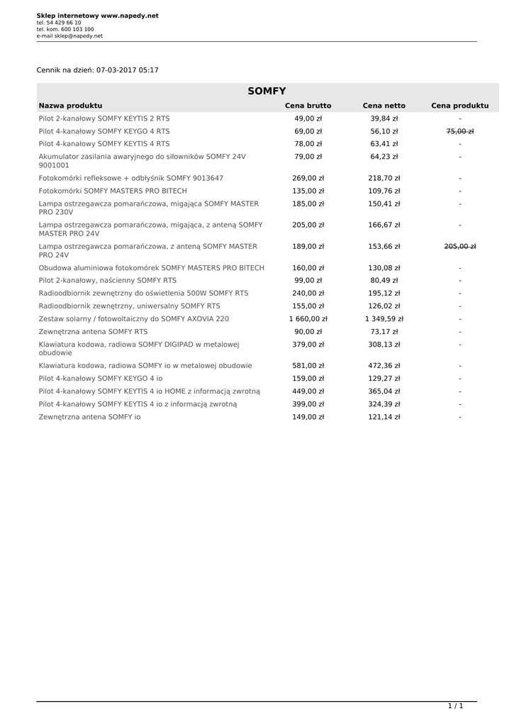 Sklep internetowy www.napedy.net tel. 54 429 66 10 tel. kom. 600 103 100 e-mail [email protected] Cennik na dzień: 07-03-2017 05:17 SOMFY Nazwa produktu Cena brutto Cena netto Pilot 2-kanałowy SOMFY KEYTIS 2 RTS 49,00 zł 39,84 zł - Pilot 4-kanałowy SOMFY KEYGO 4 RTS 69,00 zł 56,10 zł 75,00 zł Pilot 4-kanałowy SOMFY KEYTIS 4 RTS 78,00 zł 63,41 zł - Akumulator zasilania awaryjnego do siłowników SOMFY 24V 9001001 79,00 zł 64,23 zł - Fotokomórki refleksowe + odbłyśnik SOMFY 9013647 269,00 zł 218,70 zł - Fotokomórki SOMFY MASTERS PRO BITECH 135,00 zł 109,76 zł - Lampa ostrzegawcza pomarańczowa, migająca SOMFY MASTER PRO 230V 185,00 zł 150,41 zł - Lampa ostrzegawcza pomarańczowa, migająca, z anteną SOMFY MASTER PRO 24V 205,00 zł 166,67 zł - Lampa ostrzegawcza pomarańczowa, z anteną SOMFY MASTER PRO 24V 189,00 zł 153,66 zł 205,00 zł Obudowa aluminiowa fotokomórek SOMFY MASTERS PRO BITECH 160,00 zł 130,08 zł - Pilot 2-kanałowy, naścienny SOMFY RTS Cena produktu 99,00 zł 80,49 zł - Radioodbiornik zewnętrzny do oświetlenia 500W SOMFY RTS 240,00 zł 195,12 zł - Radioodbiornik zewnętrzny, uniwersalny SOMFY RTS 155,00 zł 126,02 zł - 1 660,00 zł 1 349,59 zł - 90,00 zł 73,17 zł - Klawiatura kodowa, radiowa SOMFY DIGIPAD w metalowej obudowie 379,00 zł 308,13 zł - Klawiatura kodowa, radiowa SOMFY io w metalowej obudowie 581,00 zł 472,36 zł - Pilot 4-kanałowy SOMFY KEYGO 4 io 159,00 zł 129,27 zł - Pilot 4-kanałowy SOMFY KEYTIS 4 io HOME z informacją zwrotną 449,00 zł 365,04 zł - Pilot 4-kanałowy SOMFY KEYTIS 4 io z informacją zwrotną 399,00 zł 324,39 zł - Zewnętrzna antena SOMFY io 149,00 zł 121,14 zł - Zestaw solarny / fotowoltaiczny do SOMFY AXOVIA 220 Zewnętrzna antena SOMFY RTS 1/1 Powered by TCPDF (www.tcpdf.org)