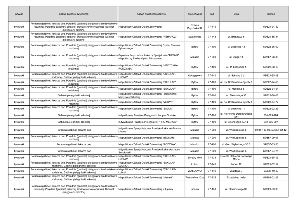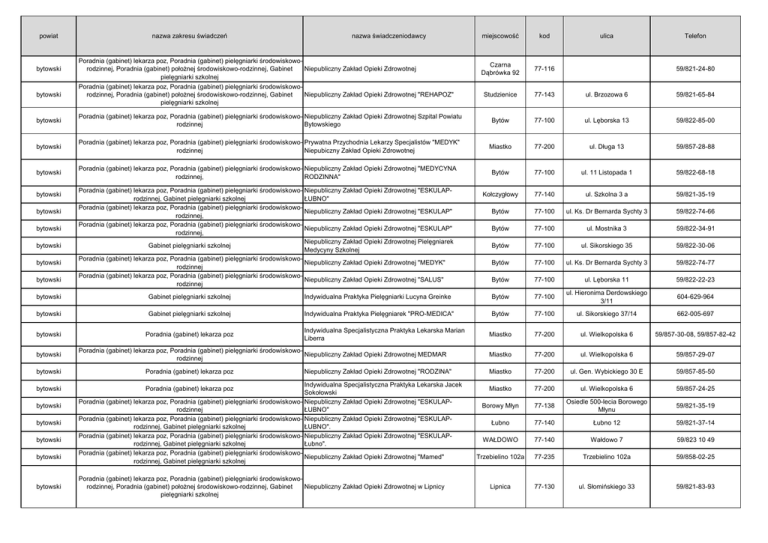 powiat nazwa zakresu świadczeń nazwa świadczeniodawcy miejscowość kod Czarna Dąbrówka 92 77-116 Studzienice 77-143 ul. Brzozowa 6 59/821-65-84 ulica Telefon bytowski Poradnia (gabinet) lekarza poz, Poradnia (gabinet) pielęgniarki środowiskoworodzinnej, Poradnia (gabinet) położnej środowiskowo-rodzinnej, Gabinet Niepubliczny Zakład Opieki Zdrowotnej pielęgniarki szkolnej bytowski Poradnia (gabinet) lekarza poz, Poradnia (gabinet) pielęgniarki środowiskoworodzinnej, Poradnia (gabinet) położnej środowiskowo-rodzinnej, Gabinet Niepubliczny Zakład Opieki Zdrowotnej "REHAPOZ" pielęgniarki szkolnej bytowski Poradnia (gabinet) lekarza poz, Poradnia (gabinet) pielęgniarki środowiskowo- Niepubliczny Zakład Opieki Zdrowotnej Szpital Powiatu rodzinnej Bytowskiego Bytów 77-100 ul. Lęborska 13 59/822-85-00 bytowski Poradnia (gabinet) lekarza poz, Poradnia (gabinet) pielęgniarki środowiskowo- Prywatna Przychodnia Lekarzy Specjalistów "MEDYK" rodzinnej Niepubiczny Zakład Opieki Zdrowotnej Miastko 77-200 ul. Długa 13 59/857-28-88 bytowski Poradnia (gabinet) lekarza poz, Poradnia (gabinet) pielęgniarki środowiskowo- Niepubliczny Zakład Opieki Zdrowotnej "MEDYCYNA rodzinnej, RODZINNA" Bytów 77-100 ul. 11 Listopada 1 59/822-68-18 Kołczygłowy 77-140 ul. Szkolna 3 a 59/821-35-19 Bytów 77-100 ul. Ks. Dr Bernarda Sychty 3 59/822-74-66 Bytów 77-100 ul. Mostnika 3 59/822-34-91 Bytów 77-100 ul. Sikorskiego 35 59/822-30-06 Bytów 77-100 ul. Ks. Dr Bernarda Sychty 3 59/822-74-77 Bytów 77-100 ul. Lęborska 11 59/822-22-23 604-629-964 bytowski bytowski bytowski bytowski bytowski bytowski Poradnia (gabinet) lekarza poz, Poradnia (gabinet) pielęgniarki środowiskowo- Niepubliczny Zakład Opieki Zdrowotnej "ESKULAProdzinnej, Gabinet pielęgniarki szkolnej ŁUBNO" Poradnia (gabinet) lekarza poz, Poradnia (gabinet) pielęgniarki środowiskowoNiepubliczny Zakład Opieki Zdrowotnej "ESKULAP" rodzinnej, Poradnia (gabinet) lekarza poz, Poradnia (gabinet) pielęgniarki środowiskowoNiepubliczny Zakład Opieki Zdrowotnej "ESKULAP" rodzinnej, Niepubliczny Zakład Opieki Zdrowotnej Pielęgniarek Gabinet pielęgniarki szkolnej Medycyny Szkolnej Poradnia (gabinet) lekarza poz, Poradnia (gabinet) pielęgniarki środowiskowoNiepubliczny Zakład Opieki Zdrowotnej "MEDYK" rodzinnej Poradnia (gabinet) lekarza poz, Poradnia (gabinet) pielęgniarki środowiskowoNiepubliczny Zakład Opieki Zdrowotnej "SALUS" rodzinnej 59/821-24-80 bytowski Gabinet pielęgniarki szkolnej Indywidualna Praktyka Pielęgniarki Lucyna Greinke Bytów 77-100 ul. Hieronima Derdowskiego 3/11 bytowski Gabinet pielęgniarki szkolnej Indywidualna Praktyka Pielęgniarek "PRO-MEDICA" Bytów 77-100 ul. Sikorskiego 37/14 662-005-697 bytowski Poradnia (gabinet) lekarza poz Miastko 77-200 ul. Wielkopolska 6 59/857-30-08, 59/857-82-42 Miastko 77-200 ul. Wielkopolska 6 59/857-29-07 Miastko 77-200 ul. Gen. Wybickiego 30 E 59/857-85-50 Miastko 77-200 ul. Wielkopolska 6 59/857-24-25 Borowy Młyn 77-138 Osiedle 500-lecia Borowego Młynu 59/821-35-19 Łubno 77-140 Łubno 12 59/821-37-14 WAŁDOWO 77-140 Wałdowo 7 59/823 10 49 Trzebielino 102a 77-235 Trzebielino 102a 59/858-02-25 Lipnica 77-130 ul. Słomińskiego 33 59/821-83-93 bytowski bytowski bytowski bytowski bytowski bytowski bytowski bytowski Indywidualna Specjalistyczna Praktyka Lekarska Marian Liberra Poradnia (gabinet) lekarza poz, Poradnia (gabinet) pielęgniarki środowiskowoNiepubliczny Zakład Opieki Zdrowotnej MEDMAR rodzinnej Poradnia (gabinet) lekarza poz Niepubliczny Zakład Opieki Zdrowotnej "RODZINA" Indywidualna Specjalistyczna Praktyka Lekarska Jacek Sokołowski Poradnia (gabinet) lekarza poz, Poradnia (gabinet) pielęgniarki środowiskowo- Niepubliczny Zakład Opieki Zdrowotnej "ESKULAProdzinnej ŁUBNO" Poradnia (gabinet) lekarza poz, Poradnia (gabinet) pielęgniarki środowiskowo- Niepubliczny Zakład Opieki Zdrowotnej "ESKULAProdzinnej, Gabinet pielęgniarki szkolnej ŁUBNO". Poradnia (gabinet) lekarza poz, Poradnia (gabinet) pielęgniarki środowiskowo- Niepubliczny Zakład Opieki Zdrowotnej "ESKULAProdzinnej, Gabinet pielęgniarki szkolnej Łubno". Poradnia (gabinet) lekarza poz, Poradnia (gabinet) pielęgniarki środowiskowoNiepubliczny Zakład Opieki Zdrowotnej "Mamed" rodzinnej, Gabinet pielęgniarki szkolnej Poradnia (gabinet) lekarza poz Poradnia (gabinet) lekarza poz, Poradnia (gabinet) pielęgniarki środowiskoworodzinnej, Poradnia (gabinet) położnej środowiskowo-rodzinnej, Gabinet Niepubliczny Zakład Opieki Zdrowotnej w Lipnicy pielęgniarki szkolnej powiat bytowski bytowski bytowski bytowski bytowski nazwa zakresu świadczeń nazwa świadczeniodawcy miejscowość kod ulica Telefon Tuchomie 77-133 ul. Jana III Sobieskiego 22 59/821 57 91 Miastko 77-200 ul. Długa 8 59/857-91-10 Miastko 77-200 ul. Wybickiego 30e 59/857-85-51 Miastko 77-200 ul. Konstytucji 3 Maja 4/12 661 130 222 Borzytuchom 77-141 ul. Zwycięstwa 52 59/821-13-14 Indywidualna Praktyka Pielęgniarska Krystyna Taraszkiewicz Miastko 77-200 Os. Niepodległości 6 698-763-635 Niepubliczny Zakład Opieki Zdrowotnej "LORMED" Miastko 77-200 ul. Wybickiego 30 59/857-09-38 Poradnia (gabinet) lekarza poz, Poradnia (gabinet) pielęgniarki środowiskoworodzinnej, Poradnia (gabinet) położnej środowiskowo-rodzinnej, Gabinet Niepubliczny Zakład Opieki Zdrowotnej w Lipnicy pielęgniarki szkolnej Poradnia (gabinet) położnej środowiskowo-rodzinnej Indywidualna Praktyka Położnej Gruba Izabela Poradnia (gabinet) lekarza poz, Poradnia (gabinet) pielęgniarki środowiskowo- Niepubliczny Zakład Opieki Zdrowotnej Wiesława Białasrodzinnej Gryń Gabinet pielęgniarki szkolnej Grupowa Praktyka Pielęgniarek "MED.-SZKOL" Spółka Cywilna Poradnia (gabinet) lekarza poz, Poradnia (gabinet) pielęgniarki środowiskowoNiepubliczny Zakład Opieki Zdrowotnej HT Nowiccy rodzinnej, Poradnia (gabinet) położnej środowiskowo-rodzinnej, Gabinet "ZDROWIE" pielęgniarki szkolnej bytowski Gabinet pielęgniarki szkolne