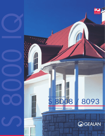 S 8000 IQ Kombinacja profili S 8008 / 8093 Ponadczasowa elegancja S 8000 IQ system profili z pełnym wyposażeniem jasny dąb (ciemny) dąb Okna z profili w systemie S 8000 IQ przekonują także dzięki wąskim profilom, ponadczasowej elegancji, estetyce, trwałej wartości i powierzchni o wysokim połysku. kremowy RAL 9001 szarość agatu RAL 7038 szarość RAL 7040 ciemny brąz 02 dąb bagienny mahoń System S 8000 IQ jest dostępny w 11 kolorach acrylcolor oraz 6 strukturach drewnopodobnych.* Partner firmy GEALAN chętnie Państwu doradzi: Automatycznie działający system wietrzenia GECCO 3 (GEALAN CLIMA CONTROL). Podwyższone właściwości statyczne okna dzięki zastosowaniu większych wzmocnień. brąz sepii RAL 8014 granatowy RAL 5011 złoty dąb Dobre właściwości cieplne dzięki czterokomorowej budowie i dużej głębokości - 74mm. szarość łupka RAL 7015 zieleń mchu RAL 6005 oregon Zalety profili w systemie S 8000 IQ Zwiększona ochrona przed włamaniem dzięki pogłębionemu profilowi – 74 mm – i bezpieczniejszemu mocowaniu okuć. ciemnoczerwony RAL 3011 Stylistyka zgodna z najnowocześniejszymi trendami ponadczasowej elegancji. jasnoczerwony RAL 3000 Wąskie profile. niebieski ultramaryna RAL 5002 GEALAN Polska Sp. z o. o. ul. Rudzka 31 · 95030 Rzgów telefon +48 (0) 42 / 2 25 21 30 fax +48 (0) 42 / 2 25 21 35 E-mail: [email protected] Internet: www.gealan.pl *Przedstawione kolory mogą odbiegać od rzeczywistych z powodu zniekształceń w druku. Nowy czterokomorowy system o głębokości 74 mm ma wszystko, czego potrzebują Państwa okna: znakomite parametry cieplne, wysoką dźwiękoszczelność i ochronę przeciwwłamaniową oraz wszystkie przesłanki służące długowieczności okien. Żeby w Państwa własnych czterech ścianach panowała odpowiednia wilgotność oraz temperatura, okna w systemie GEALAN mogą być opcjonalnie wyposażone w automatyczny system wietrzenia GECCO 3 (GEALAN CLIMA CONTROL). Mała klapka wietrzeniowa o dużym działaniu czyni z Państwa okien okno rozszczelnione, przez co zapobiega uciążliwym przeciągom oraz powstawaniu pleśni. Art.-nr 070398 PL G Cenią Państwo wyjątkowość i przykładają dużą wagę do jakości? Wobec tego wybierzcie dla swojego domu wyposażenie spełniające wysokie wymagania i zapewniające indywidualną atmosferę mieszkania. Wyraźcie swój własny styl przez okna w systemie S 8000 IQ firmy GEALAN.