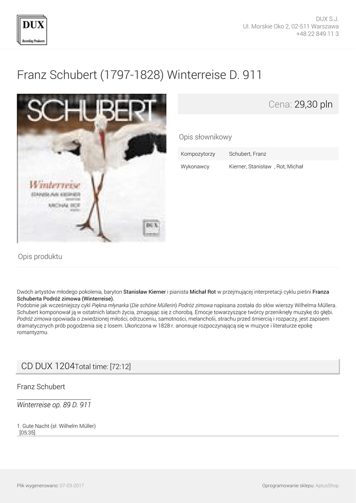 DUX S.J. Ul. Morskie Oko 2, 02-511 Warszawa +48 22 849 11 3 Franz Schubert (1797-1828) Winterreise D. 911 Cena: 29,30 pln Opis słownikowy Kompozytorzy Schubert, Franz ∎ Wykonawcy Kierner, Stanisław ∎, Rot, Michał ∎ Opis produktu Dwóch artystów młodego pokolenia, baryton Stanisław Kierner i pianista Michał Rot w przejmującej interpretacji cyklu pieśni Franza Schuberta Podróż zimowa (Winterreise). Podobnie jak wcześniejszy cykl Piękna młynarka (Die schöne Müllerin) Podróż zimowa napisana została do słów wierszy Wilhelma Müllera. Schubert komponował ją w ostatnich latach życia, zmagając się z chorobą. Emocje towarzyszące twórcy przeniknęły muzykę do głębi. Podróż zimowa opowiada o zwiedzionej miłości, odrzuceniu, samotności, melancholii, strachu przed śmiercią i rozpaczy, jest zapisem dramatycznych prób pogodzenia się z losem. Ukończona w 1828 r. anonsuje rozpoczynającą się w muzyce i literaturze epokę romantyzmu. CD DUX 1204Total time: [72:12] Franz Schubert Winterreise op. 89 D. 911 1. Gute Nacht (sł. Wilhelm Müller) [05:35] Plik wygenerowano: 07-03-2017 Oprogramowanie sklepu: AptusShop DUX S.J. Ul. Morskie Oko 2, 02-511 Warszawa +48 22 849 11 3 2. Die Wetterfahne (sł. Wilhelm Müller) [02:00] 3. Gefrorne Tränen (sł. Wilhelm Müller) [02:29] 4. Erstarrung (sł. Wilhelm Müller) [02:45] 5. Der Lindenbaum (sł. Wilhelm Müller) [04:38] 6. Wasserflut (sł. Wilhelm Müller) [04:33] 7. Auf dem Flusse (sł. Wilhelm Müller) [03:28] 8. Rückblick (sł. Wilhelm Müller) [02:09] 9. Irrlicht (sł. Wilhelm Müller) [03:02] 10. Rast (sł. Wilhelm Müller) [03:18] 11. Frühlingstraum (sł. Wilhelm Müller) [04:05] 12. Einsamkeit (sł. Wilhelm Müller) [02:53] 13. Die Post (sł. Wilhelm Müller) [02:20] 14. Der greise Kopf (sł. Wilhelm Müller) [02:54] 15. Die Krähe (sł. Wilhelm Müller) [01:40] 16. Letzte Hoffnung (sł. Wilhelm Müller) [01:58] Plik wygenerowano: 07-03-2017 Oprogramowanie sklepu: AptusShop DUX S.J. Ul. Morskie Oko 2, 02-511 Warszawa +48 22 849 11 3 17. Im Dorfe (sł. Wilhelm Müller) [02:56] 18. Der stürmische Morgen [00:55] 19. Täuschung (sł. Wilhelm Müller) [01:27] 20. Der Wegweiser (sł. Wilhelm Müller) [04:29] 21. Das Wirtshaus (sł. Wilhelm Müller) [04:24] 22. Mut! (sł. Wilhelm Müller) [01:29] 23. Die Nebensonnen (sł. Wilhelm Müller) [02:58] 24. Der Leiermann (sł. Wilhelm Müller) [03:46] Wykonawcy: Michał Rot /fortepian/ Stanisław Kierner /baryton/ Plik wygenerowano: 07-03-2017 Powered by TCPDF (www.tcpdf.org) Oprogramowanie sklepu: AptusShop