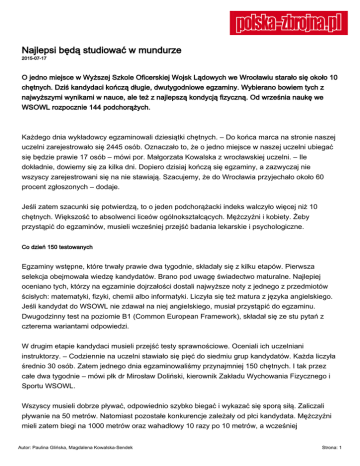Najlepsi będą studiować w mundurze 2015-07-17 O jedno miejsce w Wyższej Szkole Oficerskiej Wojsk Lądowych we Wrocławiu starało się około 10 chętnych. Dziś kandydaci kończą długie, dwutygodniowe egzaminy. Wybierano bowiem tych z najwyższymi wynikami w nauce, ale też z najlepszą kondycją fizyczną. Od września naukę we WSOWL rozpocznie 144 podchorążych. Każdego dnia wykładowcy egzaminowali dziesiątki chętnych. – Do końca marca na stronie naszej uczelni zarejestrowało się 2445 osób. Oznaczało to, że o jedno miejsce w naszej uczelni ubiegać się będzie prawie 17 osób – mówi por. Małgorzata Kowalska z wrocławskiej uczelni. – Ile dokładnie, dowiemy się za kilka dni. Dopiero dzisiaj kończą się egzaminy, a zazwyczaj nie wszyscy zarejestrowani się na nie stawiają. Szacujemy, że do Wrocławia przyjechało około 60 procent zgłoszonych – dodaje. Jeśli zatem szacunki się potwierdzą, to o jeden podchorążacki indeks walczyło więcej niż 10 chętnych. Większość to absolwenci liceów ogólnokształcących. Mężczyźni i kobiety. Żeby przystąpić do egzaminów, musieli wcześniej przejść badania lekarskie i psychologiczne. Co dzień 150 testowanych Egzaminy wstępne, które trwały prawie dwa tygodnie, składały się z kilku etapów. Pierwsza selekcja obejmowała wiedzę kandydatów. Brano pod uwagę świadectwo maturalne. Najlepiej oceniano tych, którzy na egzaminie dojrzałości dostali najwyższe noty z jednego z przedmiotów ścisłych: matematyki, fizyki, chemii albo informatyki. Liczyła się też matura z języka angielskiego. Jeśli kandydat do WSOWL nie zdawał na niej angielskiego, musiał przystąpić do egzaminu. Dwugodzinny test na poziomie B1 (Common European Framework), składał się ze stu pytań z czterema wariantami odpowiedzi. W drugim etapie kandydaci musieli przejść testy sprawnościowe. Oceniali ich uczelniani instruktorzy. – Codziennie na uczelni stawiało się pięć do siedmiu grup kandydatów. Każda liczyła średnio 30 osób. Zatem jednego dnia egzaminowaliśmy przynajmniej 150 chętnych. I tak przez całe dwa tygodnie – mówi płk dr Mirosław Doliński, kierownik Zakładu Wychowania Fizycznego i Sportu WSOWL. Wszyscy musieli dobrze pływać, odpowiednio szybko biegać i wykazać się sporą siłą. Zaliczali pływanie na 50 metrów. Natomiast pozostałe konkurencje zależały od płci kandydata. Mężczyźni mieli zatem biegi na 1000 metrów oraz wahadłowy 10 razy po 10 metrów, a wcześniej Autor: Paulina Glińska, Magdalena Kowalska-Sendek Strona: 1 podciąganie na drążku. Natomiast kobiety biegały na 800 metrów oraz po kopercie, do tego wykonywały zwis na drążku. – Test sprawności zaczyna się zawsze od sprawdzianu siły, w przypadku mężczyzn jest to podciąganie się. Wielu z kandydatów na tym właśnie etapie nie daje rady. Tak było i tym razem. Nie wszyscy przygotowali się odpowiednio i ci szybko zakończyli egzaminy. Tym samym musieli się pożegnać z marzeniami o studiach w naszej uczelni – mówi płk Doliński. Jedną z takich osób był m.in. Paweł z Poznania. Maturzysta zrezygnował już po 10 minutach trwania egzaminu. Ale nie rezygnuje z marzeń o mundurze. – Nie było łatwo i nie byłem zbyt dobrze przygotowany. Za rok spróbuję swoich sił ponownie. Tym razem odpowiednio wcześnie rozpocznę treningi – zapowiada. Pułkownik Doliński radzi kandydatom, by przygotowania zaczęli wcześniej niż dwa miesiące przed terminem testu sprawnościowego. – Nic na tym egzaminie nie jest zaskoczeniem, bo zasady rekrutacji są ogłaszane z wyprzedzeniem. Niektórzy potrafili się więc przygotować zaskakująco dobrze. Byli silnie zmotywowani i sprawni fizycznie. To nie był przypadek, widać, że wiedzą czego chcą – mówi pułkownik. Harcerze i zdobywcy certyfikatów Po sprawdzianie sprawności kandydatów czekała rozmowa kwalifikacyjna. Komisja oceniała predyspozycje ochotników do zawodowej służby oraz ich dodatkowe umiejętności. – Dziś nie wystarczy po prostu do nas przyjść i pozytywnie zdać egzaminy. Aby zwiększyć swoją szansę na dostatnie się na studia, kandydat musi coś dodatkowego sobą reprezentować – mówi mjr Piotr Szczepański, rzecznik prasowy WSOWL. Dlatego wielu prezentowało przed komisją certyfikaty ukończenia różnych kursów albo dyplomy potwierdzające dodatkowe kwalifikacje. Jak co roku, było sporo osób aktywnie działających w harcerstwie, organizacjach proobronnych i samorządach. Podczas rekrutacji kandydaci mogli zdobyć maksymalnie 350 punktów, w tym 100 za oceny z matury, 100 za angielski, 100 ze sprawności fizycznej oraz 50 podczas rozmowy kwalifikacyjnej. Studia na pierwszym roku rozpoczną 144 osoby, które zebrały najwyższą liczbę punktów. Już w sierpniu zostaną powołane do służby kandydackiej. Po przejściu podstawowego szkolenia wojskowego, złożeniu przysięgi i przyjęciu w poczet studentów staną się podchorążymi Wyższej Szkoły Oficerskiej Wojsk Lądowych. 126 z nich podejmie studia na wydziale zarządzania. Pozostałe 18 osób studiować będzie inżynierię bezpieczeństwa. Podchorążowie szkolić się będą w specjalnościach: pancernej i zmechanizowanej, aeromobilnej, rakietowej i artylerii, rozpoznawczej, przeciwlotniczej, logistycznej oraz saperskiej. Autor: Paulina Glińska, Magdalena Kowalska-Sendek Strona: 2 Przez całe studia będą mieli zagwarantowane zakwaterowanie, wyżywienie, umundurowanie, opiekę lekarską. A do tego miesięczny żołd – na początku 800 zł, z każdym rokiem będzie jednak rósł aż do ok. 2000 zł. Wszyscy kończący studia mają zapewniony etat w wojsku. Wyższa Szkoła Oficerska we Wrocławiu to nie jedyna uczelnia, która rekrutuje kandydatów na studia wojskowe. W przyszłym tygodniu rozpoczną się podobne egzaminy w Szkole Orląt w Dęblinie. Na 660 złożonych wniosków do egzaminów przystąpi ok. 230 kandydatów. Będą się ubiegali