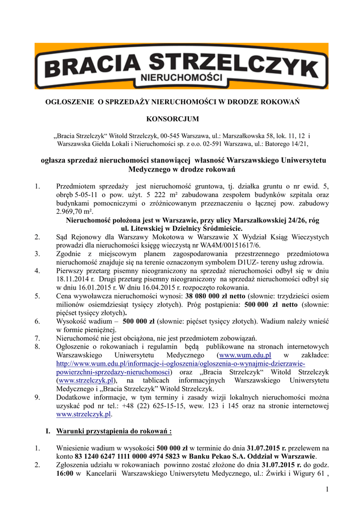 OGŁOSZENIE O SPRZEDAŻY NIERUCHOMOŚCI W DRODZE ROKOWAŃ KONSORCJUM „Bracia Strzelczyk“ Witold Strzelczyk, 00-545 Warszawa, ul.: Marszałkowska 58, lok. 11, 12 i Warszawska Giełda Lokali i Nieruchomości sp. z o.o. 02-591 Warszawa, ul.: Batorego 14/21, ogłasza sprzedaż nieruchomości stanowiącej własność Warszawskiego Uniwersytetu Medycznego w drodze rokowań 1. 2. 3. 4. 5. 6. 7. 8. 9. Przedmiotem sprzedaży jest nieruchomość gruntowa, tj. działka gruntu o nr ewid. 5, obręb 5-05-11 o pow. użyt. 5 222 m² zabudowana zespołem budynków szpitala oraz budynkami pomocniczymi o zróżnicowanym przeznaczeniu o łącznej pow. zabudowy 2.969,70 m². Nieruchomość położona jest w Warszawie, przy ulicy Marszałkowskiej 24/26, róg ul. Litewskiej w Dzielnicy Śródmieście. Sąd Rejonowy dla Warszawy Mokotowa w Warszawie X Wydział Ksiąg Wieczystych prowadzi dla nieruchomości księgę wieczystą nr WA4M/00151617/6. Zgodnie z miejscowym planem zagospodarowania przestrzennego przedmiotowa nieruchomość znajduje się na terenie oznaczonym symbolem D1UZ- tereny usług zdrowia. Pierwszy przetarg pisemny nieograniczony na sprzedaż nieruchomości odbył się w dniu 18.11.2014 r. Drugi przetarg pisemny nieograniczony na sprzedaż nieruchomości odbył się w dniu 16.01.2015 r. W dniu 16.04.2015 r. rozpoczęto rokowania. Cena wywoławcza nieruchomości wynosi: 38 080 000 zł netto (słownie: trzydzieści osiem milionów osiemdziesiąt tysięcy złotych). Próg postąpienia: 500 000 zł netto (słownie: pięćset tysięcy złotych). Wysokość wadium – 500 000 zł (słownie: pięćset tysięcy złotych). Wadium należy wnieść w formie pieniężnej. Nieruchomość nie jest obciążona, nie jest przedmiotem zobowiązań. Ogłoszenie o rokowaniach i regulamin będą publikowane na stronach internetowych Warszawskiego Uniwersytetu Medycznego (www.wum.edu.pl w zakładce: http://www.wum.edu.pl/informacje-i-ogloszenia/ogloszenia-o-wynajmie-dzierzawiepowierzchni-sprzedazy-nieruchomosci) oraz „Bracia Strzelczyk“ Witold Strzelczyk (www.strzelczyk.pl), na tablicach informacyjnych Warszawskiego Uniwersytetu Medycznego i „Bracia Strzelczyk” Witold Strzelczyk. Dodatkowe informacje, w tym terminy i zasady wizji lokalnych nieruchomości można uzyskać pod nr tel.: +48 (22) 625-15-15, wew. 123 i 145 oraz na stronie internetowej www.strzelczyk.pl. I. Warunki przystąpienia do rokowań : 1. 2. Wniesienie wadium w wysokości 500 000 zł w terminie do dnia 31.07.2015 r. przelewem na konto 83 1240 6247 1111 0000 4974 5823 w Banku Pekao S.A. Oddział w Warszawie. Zgłoszenia udziału w rokowaniach powinno zostać złożone do dnia 31.07.2015 r. do godz. 16:00 w Kancelarii Warszawskiego Uniwersytetu Medycznego, ul.: Żwirki i Wigury 61 , 1 02-091 Warszawa (pok. Nr 9). Pisemne zgłoszenie udziału w rokowaniach powinno być złożone w zamkniętej kopercie podpisane „Marszałkowska/Litewska”, które powinno zawierać: 1) imię, nazwisko i adres albo nazwę lub firmę oraz siedzibę, jeżeli zgłaszającym jest osoba prawna lub inny podmiot, 2) datę sporządzenia zgłoszenia, 3) oświadczenie, że zgłaszający zapoznał się z warunkami rokowań określonymi w ogłoszeniu o rokowaniach i regulaminie i przyjmuje te warunki bez zastrzeżeń, 4) oświadczenie, że zgłaszający zobowiązuje się ponieść wszelkie koszty i należności publicznoprawne związane z zawarciem umowy przedwstępnej sprzedaży nieruchomości oraz umowy przyrzeczonej, w przypadku wyboru jego oferty, 5) oświadczenie, że zgłaszający zapoznał się ze stanem faktycznym i stanem prawnym przedmiotu rokowań i nie wnosi do niego zastrzeżeń, 6) oferowaną cenę w walucie polskiej wyrażoną kwotowo i słownie nie niższą niż cena wywoławcza oraz sposób jej zapłaty, 7) podpis osoby upoważnionej do reprezentowania danego podmiotu według właściwego rejestru w przypadku osób prawnych i innych podmiotów, podpisy obojga małżonków w przypadku osób fizycznych, gdy małżonek/małżonkowie nabywają nieruchomość do majątku wspólnego, ewentualnie pełnomocnictwo podpisane przez ww. osoby, 8) wszelkie zezwolenia i zgody, jeżeli ze względu na osobę nabywcy są one prawem wymagane, 9) numer rachunku bankowego, na który należy zwrócić wadium, 10) kopia dowodu wniesienia wadium, 11) aktualny odpis z właściwego rejestru lub z centralnej ewidencji i informacji o działalności gospodarczej, jeżeli przepisy wymagają wpisu do rejestru lub ewidencji, wystawiony nie wcześniej niż 3 miesiące przed upływem terminu składania ofert lub kopię dokumentów stwierdzających tożsamość w przypadku osób fizycznych, 12) dokument potwierdzający umocowanie do podpisania zgłoszenia , o ile nie wynika ono z innych dokumentów dołączonych do oferty. Umocowanie składane jest w formie oryginału lub kserokopii poświadczonej za zgodność z oryginałem przez notariusza. 3. Jednocześnie Warszawski Uniwersytet Medyczny zastrzega, że 31.07.2015 r. jest ostatecznym terminem do złożenia zgłoszenia udziału w rokowaniach rozpoczętych w dniu 16.04.2015 r. II. Przebieg rokowań 1. 2. 3. 4. 5. Otwarcie zgłoszeń odbędzie się w dniu 04.08.2015 r. o godz. 11.00, w Sali konferencyjnej nr 316 w Rektoracie Warszawskiego Uniwersytetu Warszawskiego, ul. Żwirki i Wigury 61, 02-091 Warszawa. Wadium wniesione przez uczestników rokowań, których zgłoszenia nie zostały przyjęte zostanie zwrócone niezwłocznie po okresie związania ofertą. Natomiast w przypadku odwołania, unieważnienia rokowań lub zamknięcia rokowań bez wybrania nabywcy bez podania przyczyn, wadium zwrócone zostanie w terminie do 5 dni. Wadium wpłacone przez uczestnika rokowań , który został wybrany jako nabywca , zalicza się na poczet zadatku, o którym mowa w §2 ust. 5 pkt 5 regulaminu. W przypadku uchylenia się uczestnika rokowań , który został wybrany jako nabywca od zawarcia umowy sprzedaży we wskazanym miejscu i terminie wpłacon