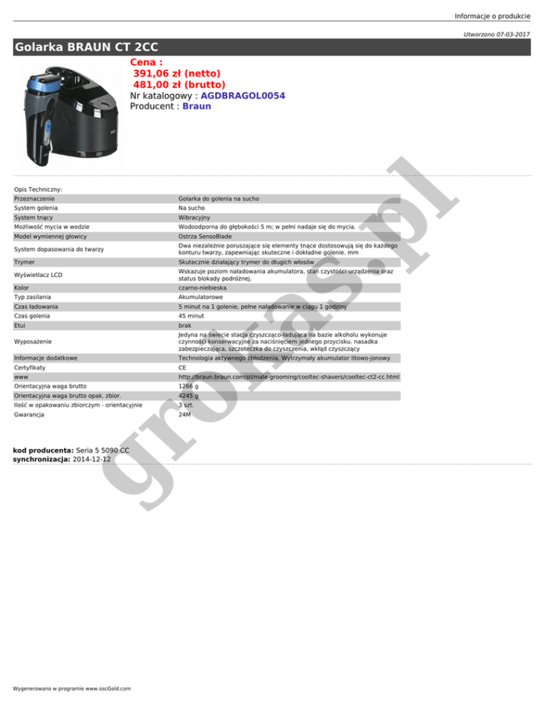 Informacje o produkcie Utworzono 07-03-2017 Golarka BRAUN CT 2CC Cena : 391,06 zł (netto) 481,00 zł (brutto) Nr katalogowy : AGDBRAGOL0054 Producent : Braun Opis Techniczny: Golarka do golenia na sucho System golenia Na sucho System tnący Wibracyjny Możliwość mycia w wodzie Wodoodporna do głębokości 5 m; w pełni nadaje się do mycia. Model wymiennej głowicy Ostrza SensoBlade System dopasowania do twarzy Dwa niezależnie poruszające się elementy tnące dostosowują się do każdego konturu twarzy, zapewniając skuteczne i dokładne golenie. mm Trymer Skutecznie działający trymer do długich włosów Wyświetlacz LCD Wskazuje poziom naładowania akumulatora, stan czystości urządzenia oraz status blokady podróżnej. Kolor czarno-niebieska Typ zasilania Akumulatorowe Czas ładowania 5 minut na 1 golenie, pełne naładowanie w ciągu 1 godziny Czas golenia 45 minut Etui brak Wyposażenie Jedyna na świecie stacja czyszcząco-ładująca na bazie alkoholu wykonuje czynności konserwacyjne za naciśnięciem jednego przycisku. nasadka zabezpieczająca, szczoteczka do czyszczenia, wkłąd czyszczący Certyfikaty www as ok Informacje dodatkowe .p l Przeznaczenie Technologia aktywnego chłodzenia, Wytrzymały akumulator litowo-jonowy CE http://braun.braun.com/pl/male-grooming/cooltec-shavers/cooltec-ct2-cc.html Orientacyjna waga brutto 1266 g 4245 g Ilość w opakowaniu zbiorczym - orientacyjnie 3 szt. Gwarancja 24M gr Orientacyjna waga brutto opak. zbior. kod producenta: Seria 5 5090 CC synchronizacja: 2014-12-12 Wygenerowano w programie www.oscGold.com
