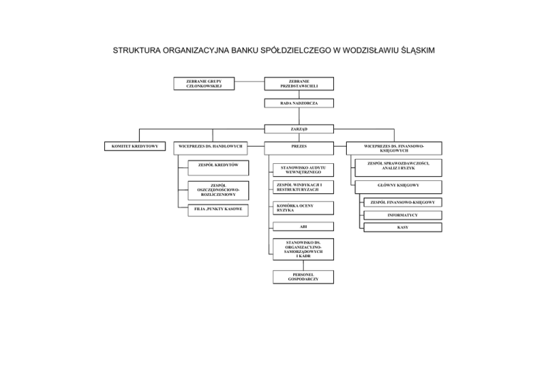 STRUKTURA ORGANIZACYJNA BANKU SPÓŁDZIELCZEGO W WODZISŁAWIU ŚLĄSKIM ZEBRANIE GRUPY CZŁONKOWSKIEJ ZEBRANIE PRZEDSTAWICIELI RADA NADZORCZA ZARZĄD KOMITET KREDYTOWY WICEPREZES DS. HANDLOWYCH ZESPÓŁ KREDYTÓW ZESPÓŁ OSZCZĘDNOŚCIOWOROZLICZENIOWY FILIA ,PUNKTY KASOWE PREZES STANOWISKO AUDYTU WEWNĘTRZNEGO ZESPÓŁ WINDYKACJI I RESTRUKTURYZACJI KOMÓRKA OCENY RYZYKA KREDYTOWEGO ABI STANOWISKO DS. ORGANIZACYJNOSAMORZĄDOWYCH I KADR PERSONEL GOSPODARCZY WICEPREZES DS. FINANSOWOKSIĘGOWYCH ZESPÓŁ SPRAWOZDAWCZOŚCI, ANALIZ I RYZYK GŁÓWNY KSIĘGOWY ZESPÓŁ FINANSOWO-KSIĘGOWY INFORMATYCY KASY