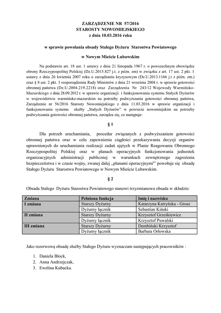 ZARZĄDZENIE NR 57/2016 STAROSTY NOWOMIEJSKIEGO z dnia 10.03.2016 roku w sprawie powołania obsady Stałego Dyżuru Starostwa Powiatowego w Nowym Mieście Lubawskim Na podstawie art. 18 ust. 1 ustawy z dnia 21 listopada 1967 r. o powszechnym obowiązku obrony Rzeczypospolitej Polskiej (Dz.U.2015.827 j.t. z późn. zm) w związku z art. 17 ust. 2 pkt. 1 ustawy z dnia 26 kwietnia 2007 roku o zarządzaniu kryzysowym (Dz.U.2013.1166 j.t z późn. zm.) oraz § 8 ust. 2 pkt. 3 rozporządzenia Rady Ministrów z dnia 21 września 2004 r. w sprawie gotowości obronnej państwa (Dz.U.2004.219.2218) oraz Zarządzenia Nr 243/12 Wojewody WarmińskoMazurskiego z dnia 28.09.2012 r. w sprawie organizacji i funkcjonowania systemu Stałych Dyżurów w województwie warmińsko-mazurskim na potrzeby podwyższania gotowości obronnej państwa, Zarządzenie nr 56/2016 Starosty Nowomiejskiego z dnia 11.03.2016 w sprawie organizacji i funkcjonowania systemu służby „Stałych Dyżurów” w powiecie nowomiejskim na potrzeby podwyższania gotowości obronnej państwa, zarządza się, co następuje: §1 Dla potrzeb uruchamiania, procedur związanych z podwyższaniem gotowości obronnej państwa oraz w celu zapewnienia ciągłości przekazywania decyzji organów uprawnionych do uruchamiania realizacji zadań ujętych w Planie Reagowania Obronnego Rzeczypospolitej Polskiej oraz w planach operacyjnych funkcjonowania jednostek organizacyjnych administracji publicznej w warunkach zewnętrznego zagrożenia bezpieczeństwa i w czasie wojny, zwanej dalej ,,planami operacyjnymi'” powołuje się obsadę Stałego Dyżuru Starostwa Powiatowego w Nowym Mieście Lubawskim. §2 Obsada Stałego Dyżuru Starostwa Powiatowego stanowi trzyzmianowa obsada w składzie: Zmiana I zmiana II zmiana III zmiana Pełniona funkcja Starszy Dyżurny Dyżurny łącznik Starszy Dyżurny Dyżurny łącznik Starszy Dyżurny Dyżurny łącznik Imię i nazwisko Katarzyna Katryńska - Grosz Sebastian Kiński Krzysztof Grześkiewicz Krzysztof Puwalski Dembiński Krzysztof Barbara Orłowska Jako rezerwową obsadę służby Stałego Dyżuru wyznaczam następujących pracowników : 1. Daniela Block, 2. Anna Andrzejczak, 3. Ewelina Kubacka. §3 Dla potrzeby służby Stałego Dyżuru Starostwa Powiatowego w Nowym Mieście Lubawskim przydzielam samochód służbowy marki Fiat Grande Punto nr rej. NNM-11FR eksploatowany przez Zarząd Dróg Powiatowych z/s w Kurzętniku. Zobowiązuję Dyrektora Zarządu Dróg Powiatowych do postawienia go w stan dyspozycji dla służby Stałego Dyżuru Starostwa Powiatowego w Nowym Mieście Lubawskim na wniosek Sekretarza Powiatu Nowomiejskiego, lub osoby go zastępującej. § 4. 1. „Stały Dyżur” Starostwa Powiatowego w Nowym Mieście Lubawskim organizuje Sekretarz Powiatu Nowomiejskiego przy współudziale Naczelnik Wydziału Zarządzania Kryzysowego Starostwa Powiatowego w Nowym Mieście Lubawskim w sekretariacie Starostwa Powiatowego przy wykorzystaniu bazy sprzętowej będącej na wyposażeniu sekretariatu. 2. Za prawidłowe przygotowanie i opracowanie dokumentacji „Stałego Dyżuru” Starostwa Powiatowego w Nowym Mieście Lubawskim odpowiedzialny jest Naczelnik Wydziału Zarządzania Kryzysowego Starostwa Powiatowego w Nowym Mieście Lubawskim. 3. Za prawidłową organizację oraz funkcjonowanie „Stałego Dyżuru” Starostwa Powiatowego w Nowym Mieście Lubawskim odpowiada Sekretarz Powiatu Nowomiejskiego. §5 Traci moc Zarządzenie Nr 146/2014 Starosty Nowomiejskiego z dnia 22.09.2014 roku w sprawie powołania obsady Stałego Dyżuru Starostwa Powiatowego w Nowym Mieście Lubawskim. §7 Zarządzenie wchodzi w życie z dniem podpisania.