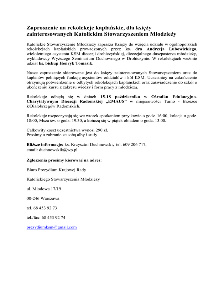 Zaproszenie na rekolekcje kapłańskie, dla księży zainteresowanych Katolickim Stowarzyszeniem Młodzieży Katolickie Stowarzyszenie Młodzieży zaprasza Księży do wzięcia udziału w ogólnopolskich rekolekcjach kapłańskich prowadzonych przez ks. dra Andrzeja Lubowickiego, wieloletniego asystenta KSM diecezji drohiczyńskiej, diecezjalnego duszpasterza młodzieży, wykładowcy Wyższego Seminarium Duchownego w Drohiczynie. W rekolekcjach weźmie udział ks. biskup Henryk Tomasik. Nasze zaproszenie skierowane jest do księży zainteresowanych Stowarzyszeniem oraz do kapłanów pełniących funkcję asystentów oddziałów i kół KSM. Uczestnicy na zakończenie otrzymują potwierdzenie o odbytych rekolekcjach kapłańskich oraz zaświadczenie do szkół o ukończeniu kursu z zakresu wiedzy i form pracy z młodzieżą. Rekolekcje odbędą się w dniach 15-18 października w Ośrodku EdukacyjnoCharytatywnym Diecezji Radomskiej „EMAUS” w miejscowości Turno - Brzeźce k/Białobrzegów Radomskich. Rekolekcje rozpoczynają się we wtorek spotkaniem przy kawie o godz. 16:00, kolacja o godz. 18:00, Msza św. o godz. 19.30, a kończą się w piątek obiadem o godz. 13.00. Całkowity koszt uczestnictwa wynosi 290 zł. Prosimy o zabranie ze sobą alby i stuły. Bliższe informacje: ks. Krzysztof Duchnowski, tel. 609 206 717, email: [email protected] Zgłoszenia prosimy kierować na adres: Biuro Prezydium Krajowej Rady Katolickiego Stowarzyszenia Młodzieży ul. Miodowa 17/19 00-246 Warszawa tel. 68 453 92 73 tel./fax: 68 453 92 74 [email protected]