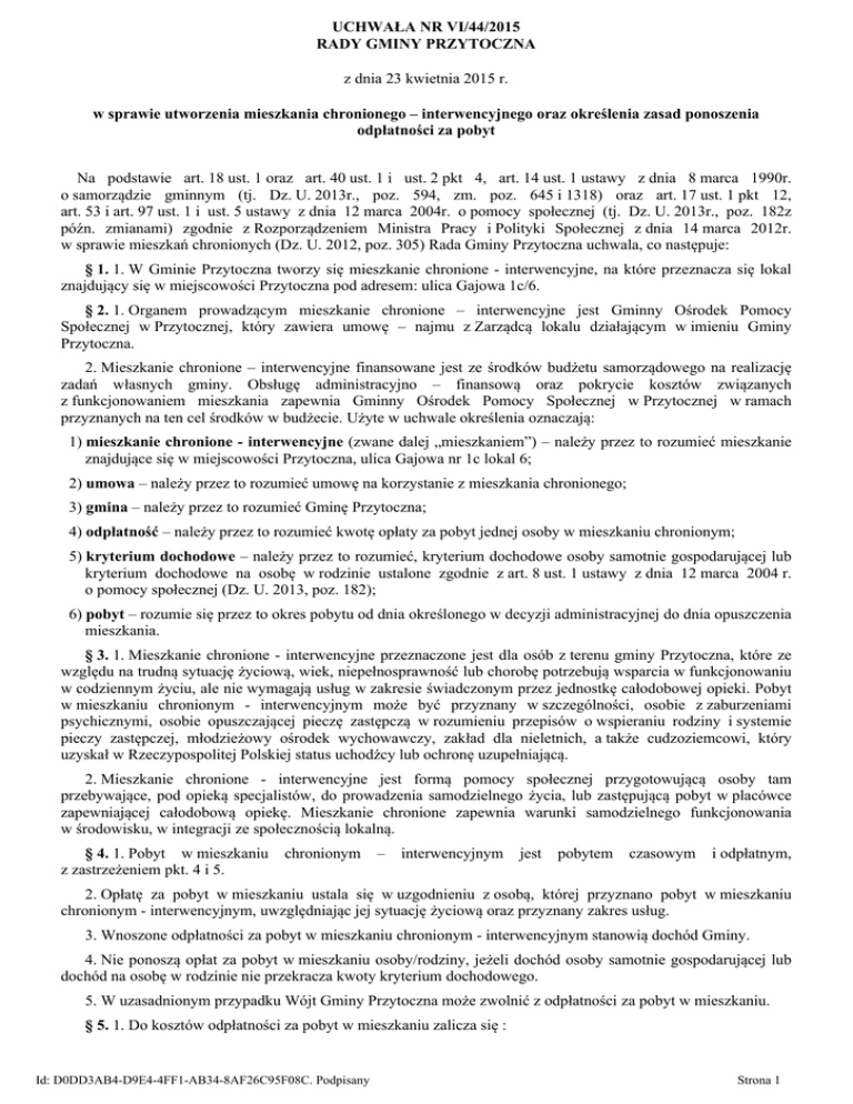 UCHWAŁA NR VI/44/2015 RADY GMINY PRZYTOCZNA z dnia 23 kwietnia 2015 r. w sprawie utworzenia mieszkania chronionego – interwencyjnego oraz określenia zasad ponoszenia odpłatności za pobyt Na podstawie art. 18 ust. 1 oraz art. 40 ust. 1 i ust. 2 pkt 4, art. 14 ust. 1 ustawy z dnia 8 marca 1990r. o samorządzie gminnym (tj. Dz. U. 2013r., poz. 594, zm. poz. 645 i 1318) oraz art. 17 ust. 1 pkt 12, art. 53 i art. 97 ust. 1 i ust. 5 ustawy z dnia 12 marca 2004r. o pomocy społecznej (tj. Dz. U. 2013r., poz. 182z późn. zmianami) zgodnie z Rozporządzeniem Ministra Pracy i Polityki Społecznej z dnia 14 marca 2012r. w sprawie mieszkań chronionych (Dz. U. 2012, poz. 305) Rada Gminy Przytoczna uchwala, co następuje: § 1. 1. W Gminie Przytoczna tworzy się mieszkanie chronione - interwencyjne, na które przeznacza się lokal znajdujący się w miejscowości Przytoczna pod adresem: ulica Gajowa 1c/6. § 2. 1. Organem prowadzącym mieszkanie chronione – interwencyjne jest Gminny Ośrodek Pomocy Społecznej w Przytocznej, który zawiera umowę – najmu z Zarządcą lokalu działającym w imieniu Gminy Przytoczna. 2. Mieszkanie chronione – interwencyjne finansowane jest ze środków budżetu samorządowego na realizację zadań własnych gminy. Obsługę administracyjno – finansową oraz pokrycie kosztów związanych z funkcjonowaniem mieszkania zapewnia Gminny Ośrodek Pomocy Społecznej w Przytocznej w ramach przyznanych na ten cel środków w budżecie. Użyte w uchwale określenia oznaczają: 1) mieszkanie chronione - interwencyjne (zwane dalej „mieszkaniem”) – należy przez to rozumieć mieszkanie znajdujące się w miejscowości Przytoczna, ulica Gajowa nr 1c lokal 6; 2) umowa – należy przez to rozumieć umowę na korzystanie z mieszkania chronionego; 3) gmina – należy przez to rozumieć Gminę Przytoczna; 4) odpłatność – należy przez to rozumieć kwotę opłaty za pobyt jednej osoby w mieszkaniu chronionym; 5) kryterium dochodowe – należy przez to rozumieć, kryterium dochodowe osoby samotnie gospodarującej lub kryterium dochodowe na osobę w rodzinie ustalone zgodnie z art. 8 ust. 1 ustawy z dnia 12 marca 2004 r. o pomocy społecznej (Dz. U. 2013, poz. 182); 6) pobyt – rozumie się przez to okres pobytu od dnia określonego w decyzji administracyjnej do dnia opuszczenia mieszkania. § 3. 1. Mieszkanie chronione - interwencyjne przeznaczone jest dla osób z terenu gminy Przytoczna, które ze względu na trudną sytuację życiową, wiek, niepełnosprawność lub chorobę potrzebują wsparcia w funkcjonowaniu w codziennym życiu, ale nie wymagają usług w zakresie świadczonym przez jednostkę całodobowej opieki. Pobyt w mieszkaniu chronionym - interwencyjnym może być przyznany w szczególności, osobie z zaburzeniami psychicznymi, osobie opuszczającej pieczę zastępczą w rozumieniu przepisów o wspieraniu rodziny i systemie pieczy zastępczej, młodzieżowy ośrodek wychowawczy, zakład dla nieletnich, a także cudzoziemcowi, który uzyskał w Rzeczypospolitej Polskiej status uchodźcy lub ochronę uzupełniającą. 2. Mieszkanie chronione - interwencyjne jest formą pomocy społecznej przygotowującą osoby tam przebywające, pod opieką specjalistów, do prowadzenia samodzielnego życia, lub zastępującą pobyt w placówce zapewniającej całodobową opiekę. Mieszkanie chronione zapewnia warunki samodzielnego funkcjonowania w środowisku, w integracji ze społecznością lokalną. § 4. 1. Pobyt w mieszkaniu z zastrzeżeniem pkt. 4 i 5. chronionym – interwencyjnym jest pobytem czasowym i odpłatnym, 2. Opłatę za pobyt w mieszkaniu ustala się w uzgodnieniu z osobą, której przyznano pobyt w mieszkaniu chronionym - interwencyjnym, uwzględniając jej sytuację życiową oraz przyznany zakres usług. 3. Wnoszone odpłatności za pobyt w mieszkaniu chronionym - interwencyjnym stanowią dochód Gminy. 4. Nie ponoszą opłat za pobyt w mieszkaniu osoby/rodziny, jeżeli dochód osoby samotnie gospodarującej lub dochód na osobę w rodzinie nie przekracza kwoty kryterium dochodowego. 5. W uzasadnionym przypadku Wójt Gminy Przytoczna może zwolnić z odpłatności za pobyt w mieszkaniu. § 5. 1. Do kosztów odpłatności za pobyt w mieszkaniu zalicza się : Id: D0DD3AB4-D9E4-4FF1-AB34-8AF26C95F08C. Podpisany Strona 1 1) koszty eksploatacji mieszkania, przez które rozumie się : a) opłaty czynszowe, w tym : czynsz w stawce podstawowej, podatek od nieruchomości, zgodnie z wyliczeniem Zarządcy – spółki WOKAMID w Przytocznej, b) koszty drobnych napraw i bieżącej konserwacji lokalu i jego wyposażenia, jak również innych opłat dotyczących lokalu, oprócz wydatków inwestycyjnych, c) ogrzewanie, gaz, wodę, odprowadzanie ścieków, usługi telekomunikacyjne (jeżeli mieszkanie posiada wyposażenie do świadczenia tych usług), d) koszty innych usług świadczonych na rzecz mieszkańca w mieszkaniu. 2. Niezależnie od dochodów osoby/rodziny przebywającej w mieszkaniu pokrywają koszty zużycia energii elektrycznej (wg odczytów urządzeń pomiarowych), odbioru nieczystości stałych (śmieci), abonament RTV. 3. Wysokość opłat za pobyt w mieszkaniu jest proporcjonalna do liczby mieszkańców w nim umieszczonych. 4. Opłaty za pobyt wnosi się do kasy Gminnego Ośrodka Pomocy Społecznej w Przytocznej w terminie określonym w decyzji. § 6. 1. Pobyt w mieszkaniu chronionym - interwencyjnym obejmuje w szczególności : a) korzystanie ze wskazanego miejsca w pokoju lub z samodzielnego pokoju oraz jego wyposażenia, b) korzystanie na prawach równego dostępu z pomieszczeń wspólnych, tj. korytarza, łazienki, kuchni, c) pomoc pracownika socjalnego GOPS w rozwiązywaniu zaistniałych problemów, d) pomoc w integracji ze środowiskiem, e) korzystanie z innych form wsparcia wynikających z zawartego kontraktu socjalnego. 2. W jednym mieszkaniu chronionym - interwencyjnym świadczone jest wsparcie skierowane do osób o zbliżonych potrzeba