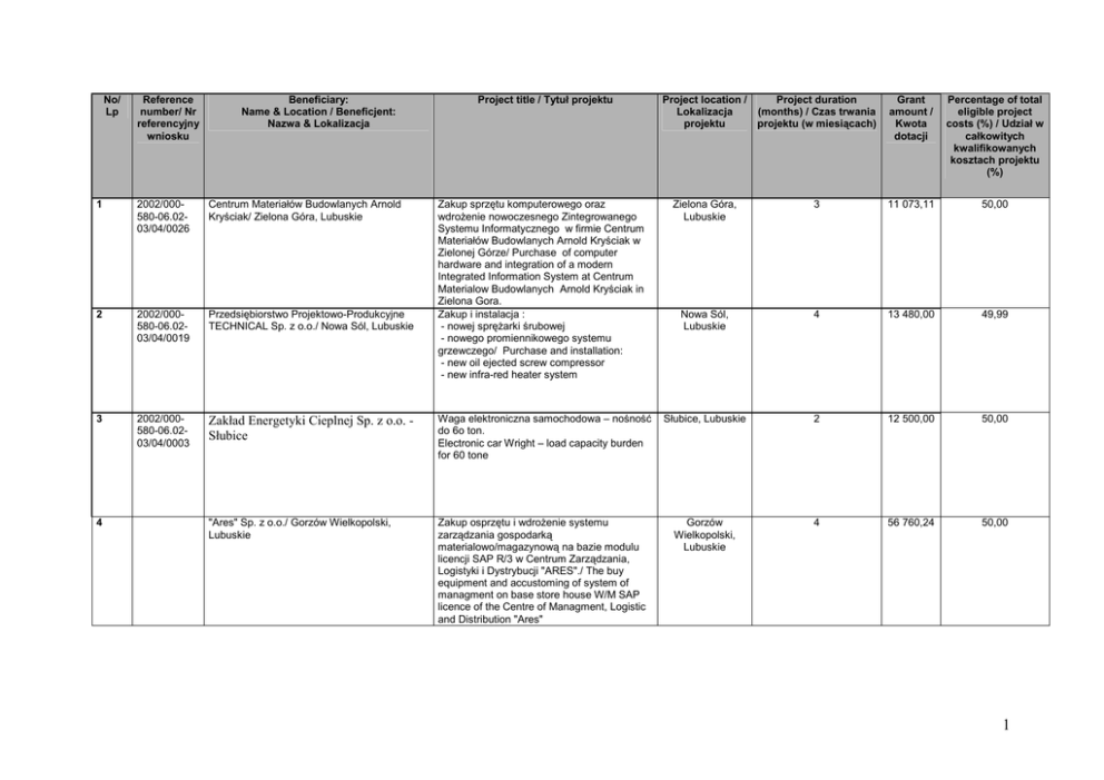 No/ Lp Reference number/ Nr referencyjny wniosku Beneficiary: Name & Location / Beneficjent: Nazwa & Lokalizacja 1 2002/000580-06.0203/04/0026 Centrum Materiałów Budowlanych Arnold Kryściak/ Zielona Góra, Lubuskie 2 2002/000580-06.0203/04/0019 Przedsiębiorstwo Projektowo-Produkcyjne TECHNICAL Sp. z o.o./ Nowa Sól, Lubuskie 3 2002/000580-06.0203/04/0003 Zakład Energetyki Cieplnej Sp. z o.o. Słubice "Ares" Sp. z o.o./ Gorzów Wielkopolski, Lubuskie 4 Project title / Tytuł projektu Zakup sprzętu komputerowego oraz wdroŜenie nowoczesnego Zintegrowanego Systemu Informatycznego w firmie Centrum Materiałów Budowlanych Arnold Kryściak w Zielonej Górze/ Purchase of computer hardware and integration of a modern Integrated Information System at Centrum Materialow Budowlanych Arnold Kryściak in Zielona Gora. Zakup i instalacja : - nowej spręŜarki śrubowej - nowego promiennikowego systemu grzewczego/ Purchase and installation: - new oil ejected screw compressor - new infra-red heater system Project location / Project duration Lokalizacja (months) / Czas trwania projektu projektu (w miesiącach) Grant amount / Kwota dotacji Percentage of total eligible project costs (%) / Udział w całkowitych kwalifikowanych kosztach projektu (%) Zielona Góra, Lubuskie 3 11 073,11 50,00 Nowa Sól, Lubuskie 4 13 480,00 49,99 Waga elektroniczna samochodowa – nośność do 6o ton. Electronic car Wright – load capacity burden for 60 tone Słubice, Lubuskie 2 12 500,00 50,00 Zakup osprzętu i wdroŜenie systemu zarządzania gospodarką materialowo/magazynową na bazie modulu licencji SAP R/3 w Centrum Zarządzania, Logistyki i Dystrybucji "ARES"./ The buy equipment and accustoming of system of managment on base store house W/M SAP licence of the Centre of Managment, Logistic and Distribution "Ares" Gorzów Wielkopolski, Lubuskie 4 56 760,24 50,00 1 5 2002/000580-06.0203/04/0034 GWM Sp. z o.o. - Gorzów Wlkp. Gorzów Wielkopolski, Lubuskie 2 15 800,00 48,23 6 2002/000580-06.0203/04/0007 Przedsiębiorstwo Handlowo Produkcyjne Zakup nowego sprzętu komputerowego wraz "PRO-MAT" Grzegorz Barszczak/ Międzyrzecz, z oprogramowaniem oraz sprzętu biurowego. Lubuskie / Purchase of new computer hardware and software. Międzyrzecz, Lubuskie 2 3 850,00 50,00 7 2002/000580-06.0203/04/0012 Przedsiębiorstwo Produkcyjno Handlowe EKO-3000 Sp. z o.o./ Zielona Góra, Lubuskie ZAKUP OPROGRAMOWANIA I SPRZĘTU KOMPUTEROWEGO/ PURCHASE OF NEW SOFTWARE AND HARDWARE Zielona Góra, Lubuskie 3 2 661,70 50,00 8 2002/000580-06.0203/04/0028 Przedsiębiorstwo WielobranŜowe "Delta" Sp. j. R.Kaliciński, L.Lech, M.Niewinowska/ Zielona Góra, lubuskie Zakup sprzętu komputerowego wraz z oprogramowaniem i licencjami. / Purchase of hardware and software with licences. Zielona Góra, lubuskie 6 21 287,00 50,00 9 2002/000580-06.0203/04/0004 Przedsiębiorstwo WielobranŜowe "INTERTANK" Sp. z o.o./ Iłowa, Lubuskie WSPARCIE SPRZEDAśY NOWYM SPRZĘTEM I TECHNOLOGIĄ/ SUPPORTING THE SALE WITH NEW EQUIPMENT AND TECHNOLOGY Iłowa, Lubuskie 9 51 450,50 49,95 Zakup nowego sprzętu komputerowego oraz specjalistycznego oprogramowania. The Purchase of New komputer appliances and special software. 2 10 Zakup mebli i sprzętu biurowego oraz wyposaŜenia stacji serwisowej pojazdów. The purchase of furniture and the Office equipment, and equipment of the Cars Service Station. 2002/000580-06.0203/04/0001 Gorzów Wlkp., Lubuskie 6 60 796,50 50,00 „Kurzawski –Podsiadło” Stanisław Kurzawski, Edward Podsiadlo sp.j. 3