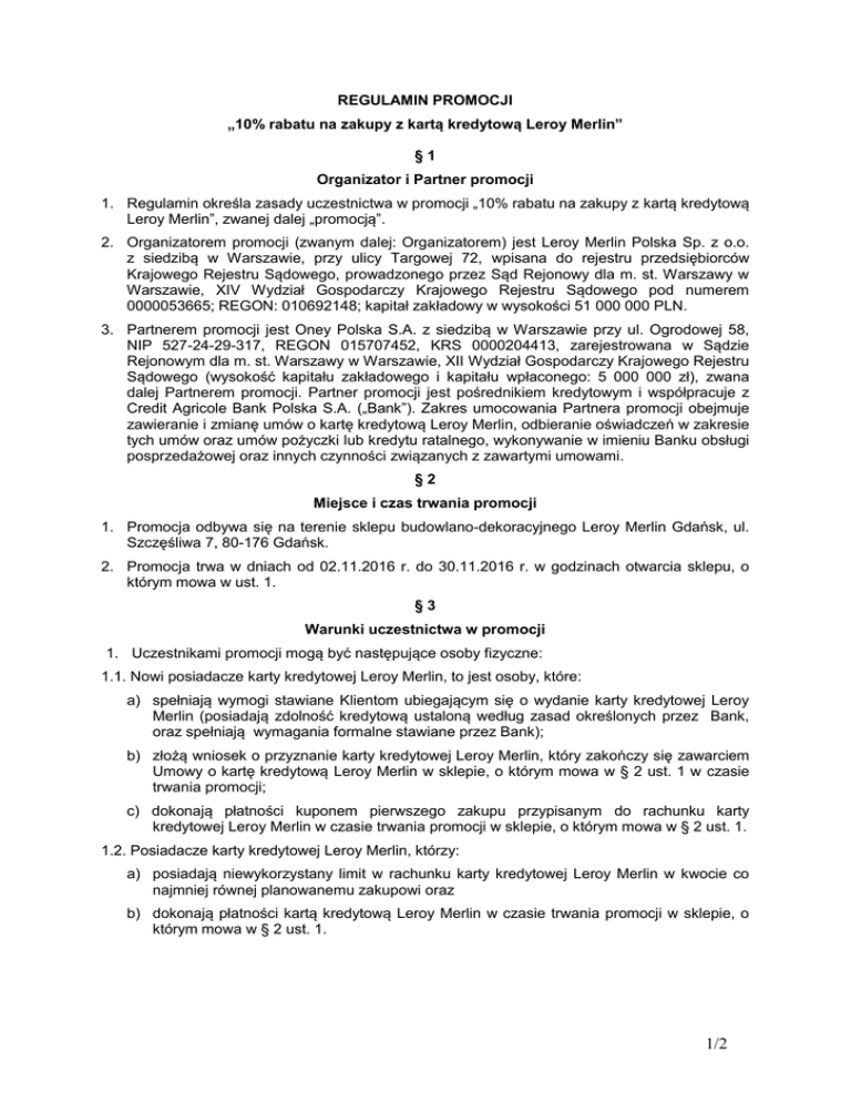 REGULAMIN PROMOCJI „10% rabatu na zakupy z kartą kredytową Leroy Merlin” §1 Organizator i Partner promocji 1. Regulamin określa zasady uczestnictwa w promocji „10% rabatu na zakupy z kartą kredytową Leroy Merlin”, zwanej dalej „promocją”. 2. Organizatorem promocji (zwanym dalej: Organizatorem) jest Leroy Merlin Polska Sp. z o.o. z siedzibą w Warszawie, przy ulicy Targowej 72, wpisana do rejestru przedsiębiorców Krajowego Rejestru Sądowego, prowadzonego przez Sąd Rejonowy dla m. st. Warszawy w Warszawie, XIV Wydział Gospodarczy Krajowego Rejestru Sądowego pod numerem 0000053665; REGON: 010692148; kapitał zakładowy w wysokości 51 000 000 PLN. 3. Partnerem promocji jest Oney Polska S.A. z siedzibą w Warszawie przy ul. Ogrodowej 58, NIP 527-24-29-317, REGON 015707452, KRS 0000204413, zarejestrowana w Sądzie Rejonowym dla m. st. Warszawy w Warszawie, XII Wydział Gospodarczy Krajowego Rejestru Sądowego (wysokość kapitału zakładowego i kapitału wpłaconego: 5 000 000 zł), zwana dalej Partnerem promocji. Partner promocji jest pośrednikiem kredytowym i współpracuje z Credit Agricole Bank Polska S.A. („Bank”). Zakres umocowania Partnera promocji obejmuje zawieranie i zmianę umów o kartę kredytową Leroy Merlin, odbieranie oświadczeń w zakresie tych umów oraz umów pożyczki lub kredytu ratalnego, wykonywanie w imieniu Banku obsługi posprzedażowej oraz innych czynności związanych z zawartymi umowami. §2 Miejsce i czas trwania promocji 1. Promocja odbywa się na terenie sklepu budowlano-dekoracyjnego Leroy Merlin Gdańsk, ul. Szczęśliwa 7, 80-176 Gdańsk. 2. Promocja trwa w dniach od 02.11.2016 r. do 30.11.2016 r. w godzinach otwarcia sklepu, o którym mowa w ust. 1. §3 Warunki uczestnictwa w promocji 1. Uczestnikami promocji mogą być następujące osoby fizyczne: 1.1. Nowi posiadacze karty kredytowej Leroy Merlin, to jest osoby, które: a) spełniają wymogi stawiane Klientom ubiegającym się o wydanie karty kredytowej Leroy Merlin (posiadają zdolność kredytową ustaloną według zasad określonych przez Bank, oraz spełniają wymagania formalne stawiane przez Bank); b) złożą wniosek o przyznanie karty kredytowej Leroy Merlin, który zakończy się zawarciem Umowy o kartę kredytową Leroy Merlin w sklepie, o którym mowa w § 2 ust. 1 w czasie trwania promocji; c) dokonają płatności kuponem pierwszego zakupu przypisanym do rachunku karty kredytowej Leroy Merlin w czasie trwania promocji w sklepie, o którym mowa w § 2 ust. 1. 1.2. Posiadacze karty kredytowej Leroy Merlin, którzy: a) posiadają niewykorzystany limit w rachunku karty kredytowej Leroy Merlin w kwocie co najmniej równej planowanemu zakupowi oraz b) dokonają płatności kartą kredytową Leroy Merlin w czasie trwania promocji w sklepie, o którym mowa w § 2 ust. 1. 1/2 §4 Zasady promocji 1. Promocja polega na przyznaniu przez Organizatora, 10% rabatu od wartości zakupów na zasadach określonych w niniejszym Regulaminie. 2. Rabat, o którym mowa w § 4 ust. 1 jest naliczany bezpośrednio przy kasie. 3. Promocja nie łączy się z innymi promocjami, w tym z rabatami z kartą DOM oraz innymi ofertami promocyjnymi obowiązującymi w sklepie, o którym mowa w § 2 ust. 1 w terminie trwania promocji. §5 Tryb składania i rozpatrywania reklamacji 1. Każdemu Uczestnikowi przysługuje prawo do wniesienia reklamacji w zakresie niezgodności przeprowadzenia promocji z niniejszym Regulaminem. 2. Reklamacja powinna mieć formę pisemną i powinna zostać: a. wysłana pocztą na adres sklepu, o którym mowa w § 2 ust. 1 lub b. złożona osobiście w Punkcie Obsługi Klienta Leroy Merlin lub Punkcie Kredytowym Partnera promocji w sklepie, o którym mowa w § 2 ust. 1. 3. Złożona reklamacja, wraz z opisem przyczyny reklamacji, powinna być opatrzona czytelnym podpisem Uczestnika promocji i zawierać dane umożliwiające jednoznaczną identyfikację Uczestnika promocji składającego reklamację. W treści reklamacji Uczestnik promocji winien podać swoje imię i nazwisko oraz adres do korespondencji . 4. Do reklamacji wymagających złożenia dokumentów, (lub jeśli taki wymóg wynika z powszechnie obowiązujących przepisów prawa) należy dołączyć kopie ewentualnych dokumentów potwierdzających zasadność złożonej reklamacji. 5. Reklamacje będą rozpatrywane w terminie 14 dni roboczych (liczonych od daty doręczenia reklamacji) przy uwzględnieniu zasad określonych w niniejszym Regulaminie oraz obowiązujących przepisów prawa. Organizator udziela odpowiedzi w formie pisemnej listownie na wskazany w reklamacji adres korespondencyjny. 6. W przypadku uzasadnionej niemożności udzielenia odpowiedzi w terminie wskazanym w ust. 5 Organizator: a. wyjaśnia przyczyny opóźnienia, b. wskazuje okoliczności, które muszą zostać ustalone, c. wskazuje przewidywany termin udzielenia odpowiedzi, który nie może przekroczyć 90 dni od dnia otrzymania reklamacji. 7. Reklamacje zawierające zastrzeżenia dotyczące usług świadczonych przez Bank (dotyczące karty kredytowej Leroy Merlin) rozpatrywane są zgodnie z Regulaminem karty kredytowej Leroy Merlin. §6 Postanowienia końcowe 1. Dane osobowe Uczestników przetwarzane będą zgodnie z Umową o kartę kredytową Leroy Merlin. 2. Udział Uczestnika w promocji oznacza akceptację zasad promocji zawartych w niniejszym Regulaminie. 3. Niniejszy Regulamin dostępny jest w Punkcie Kredytowym Partnera promocji oraz w Punkcie Obsługi Klienta Organizatora w sklepie, o którym mowa w § 2 ust. 1. 4. W sprawach nieuregulowanych w niniejszym Regulaminie mają zastosowanie przepisy powszechnie obowiązującego prawa. 2/2