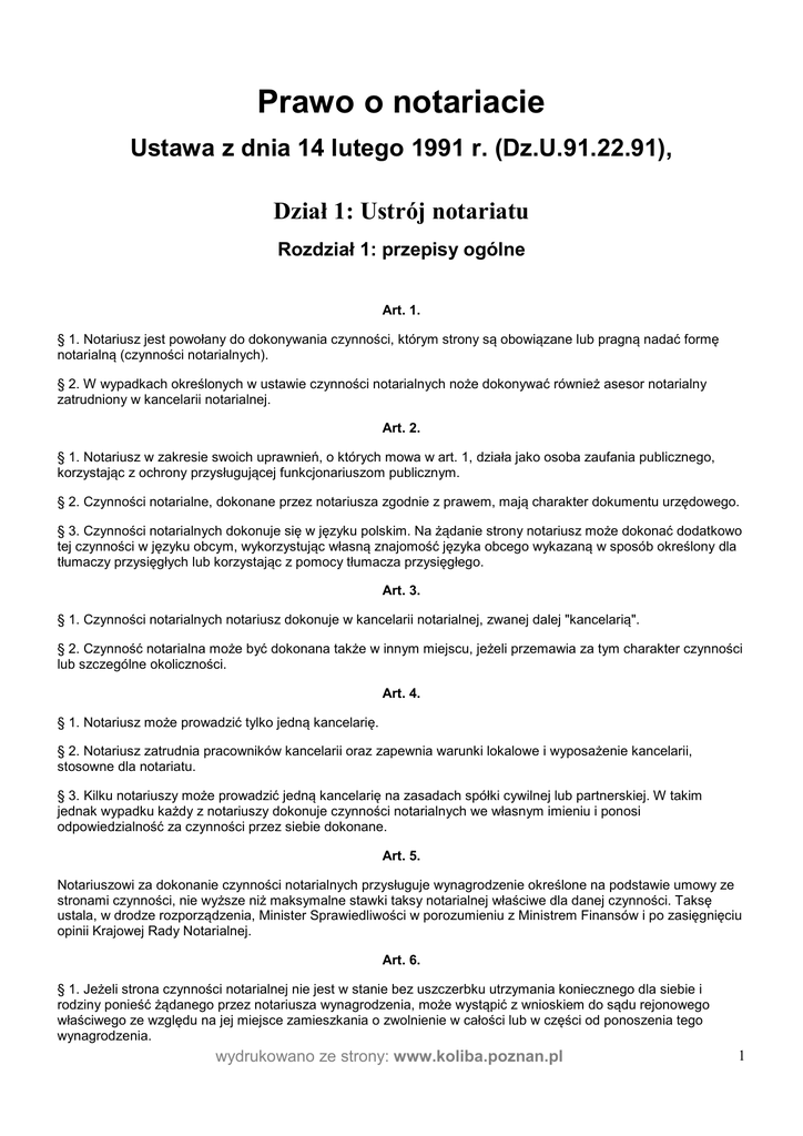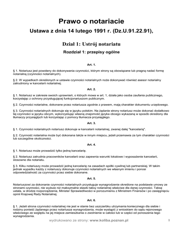 Prawo o notariacie Ustawa z dnia 14 lutego 1991 r. (Dz.U.91.22.91), Dział 1: Ustrój notariatu Rozdział 1: przepisy ogólne Art. 1. § 1. Notariusz jest powołany do dokonywania czynności, którym strony są obowiązane lub pragną nadać formę notarialną (czynności notarialnych). § 2. W wypadkach określonych w ustawie czynności notarialnych noże dokonywać również asesor notarialny zatrudniony w kancelarii notarialnej. Art. 2. § 1. Notariusz w zakresie swoich uprawnień, o których mowa w art. 1, działa jako osoba zaufania publicznego, korzystając z ochrony przysługującej funkcjonariuszom publicznym. § 2. Czynności notarialne, dokonane przez notariusza zgodnie z prawem, mają charakter dokumentu urzędowego. § 3. Czynności notarialnych dokonuje się w języku polskim. Na żądanie strony notariusz może dokonać dodatkowo tej czynności w języku obcym, wykorzystując własną znajomość języka obcego wykazaną w sposób określony dla tłumaczy przysięgłych lub korzystając z pomocy tłumacza przysięgłego. Art. 3. § 1. Czynności notarialnych notariusz dokonuje w kancelarii notarialnej, zwanej dalej "kancelarią". § 2. Czynność notarialna może być dokonana także w innym miejscu, jeżeli przemawia za tym charakter czynności lub szczególne okoliczności. Art. 4. § 1. Notariusz może prowadzić tylko jedną kancelarię. § 2. Notariusz zatrudnia pracowników kancelarii oraz zapewnia warunki lokalowe i wyposażenie kancelarii, stosowne dla notariatu. § 3. Kilku notariuszy może prowadzić jedną kancelarię na zasadach spółki cywilnej lub partnerskiej. W takim jednak wypadku każdy z notariuszy dokonuje czynności notarialnych we własnym imieniu i ponosi odpowiedzialność za czynności przez siebie dokonane. Art. 5. Notariuszowi za dokonanie czynności notarialnych przysługuje wynagrodzenie określone na podstawie umowy ze stronami czynności, nie wyższe niż maksymalne stawki taksy notarialnej właściwe dla danej czynności. Taksę ustala, w drodze rozporządzenia, Minister Sprawiedliwości w porozumieniu z Ministrem Finansów i po zasięgnięciu opinii Krajowej Rady Notarialnej. Art. 6. § 1. Jeżeli strona czynności notarialnej nie jest w stanie bez uszczerbku utrzymania koniecznego dla siebie i rodziny ponieść żądanego przez notariusza wynagrodzenia, może wystąpić z wnioskiem do sądu rejonowego właściwego ze względu na jej miejsce zamieszkania o zwolnienie w całości lub w części od ponoszenia tego wynagrodzenia. wydrukowano ze strony: www.koliba.poznan.pl 1 § 2. Przepis § 1 stosuje się odpowiednio do osoby prawnej, która wykaże, że nie ma dostatecznych środków na ponoszenie wynagrodzenia żądanego przez notariusza. § 3. Sąd po ustaleniu, że zachodzi potrzeba dokonania czynności notarialnej, uwzględnia wniosek i wyznacza notariusza do dokonania żądanej przez stronę czynności notarialnej. § 4. Za stronę zwolnioną od ponoszenia wynagrodzenia za dokonaną czynność notarialną wynagrodzenie ponosi Skarb Państwa. Wynagrodzenie przyznaje notariuszowi, na jego wniosek, sąd, który wyznaczył notariusza, na podstawie taksy, o której mowa w art. 5. § 5. Do rozpoznania wniosku, o którym mowa w § 1, oraz przyznania notariuszowi wynagrodzenia stosuje się przepisy Kodeksu postępowania cywilnego o postępowaniu nieprocesowym, z uwzględnieniem przepisów o zwolnieniu od kosztów sądowych. Art. 7. § 1. Notariusz jako płatnik na podstawie odrębnych przepisów pobiera podatki i opłaty skarbowe. § 2. Jeżeli wniosek o wpis do księgi wieczystej, o którym mowa w art. 92 § 4, podlega opłacie sądowej, notariusz pobiera od wnioskodawców tę opłatę i zaznacza w akcie notarialnym wysokość pobranej opłaty sądowej. Notariusz obowiązany jest uzależnić sporządzenie aktu notarialnego od uprzedniego uiszczenia przez strony należnej opłaty sądowej. Pobraną opłatę sądową notariusz przekazuje właściwemu sądowi rejonowemu. Art. 8. Notariusz używa pieczęci urzędowej z wizerunkiem orła. Art. 9. § 1. Minister Sprawiedliwości prowadzi rejestr kancelarii. § 2. Minister Sprawiedliwości do dnia 31 stycznia każdego roku ogłasza w formie obwieszczenia w Dzienniku Urzędowym Rzeczypospolitej Polskiej "Monitor Polski" wykaz zarejestrowanych kancelarii. Rozdział 2: Powoływanie i odwoływanie notariuszy Art. 10. Notariusza powołuje i wyznacza siedzibę jego kancelarii Minister Sprawiedliwości, na wniosek osoby zainteresowanej, po zasięgnięciu opinii rady właściwej izby notarialnej. Art. 11. Notariuszem może być powołany ten, kto: 1. posiada obywatelstwo polskie i korzysta w pełni z praw cywilnych i obywatelskich, 2. jest nieskazitelnego charakteru, 3. ukończył wyższe studia prawnicze w Polsce i uzyskał tytuł magistra lub zagraniczne uznane w Polsce, 4. odbył aplikację notarialną, 5. złożył egzamin notarialny, 6. pracował w charakterze asesora notarialnego co najmniej 3 lata, 7. ukończył 26 lat. Art. 12. Wymagania, o których mowa w art. 11 pkt 4-6, nie dotyczą: wydrukowano ze strony: www.koliba.poznan.pl 2 1. profesorów i doktorów habilitowanych nauk prawnych, 2. sędziów, prokuratorów, adwokatów i radców prawnych, którzy wykonywali ten zawód co najmniej 3 lata. Art. 13. Wniosek, o którym mowa w art. 10, powinien zawierać dane o kwalifikacjach osoby zainteresowanej, wymienione w art. 11 lub 12, oraz wskazywać lokal przewidywany do prowadzenia kancelarii i termin jej uruchomienia. Art. 14. § 1. Notariusz jest obowiązany w ciągu 2 miesięcy od zawiadomienia o powołaniu uruchomić kancelarię i zgłosić o tym Ministrowi Sprawiedliwości. § 2. W razie nieuruchomienia kancelarii w terminie, o którym mowa w § 1, powołanie traci moc; okoliczność tę stwierdza Minister Sprawiedliwości. Art. 15. § 1. Przy powołaniu notariusz składa wobec Ministra Sprawiedliwości ślubowanie według następującej roty: "Ślubuję uroczyście jako notariusz powierzone mi obo