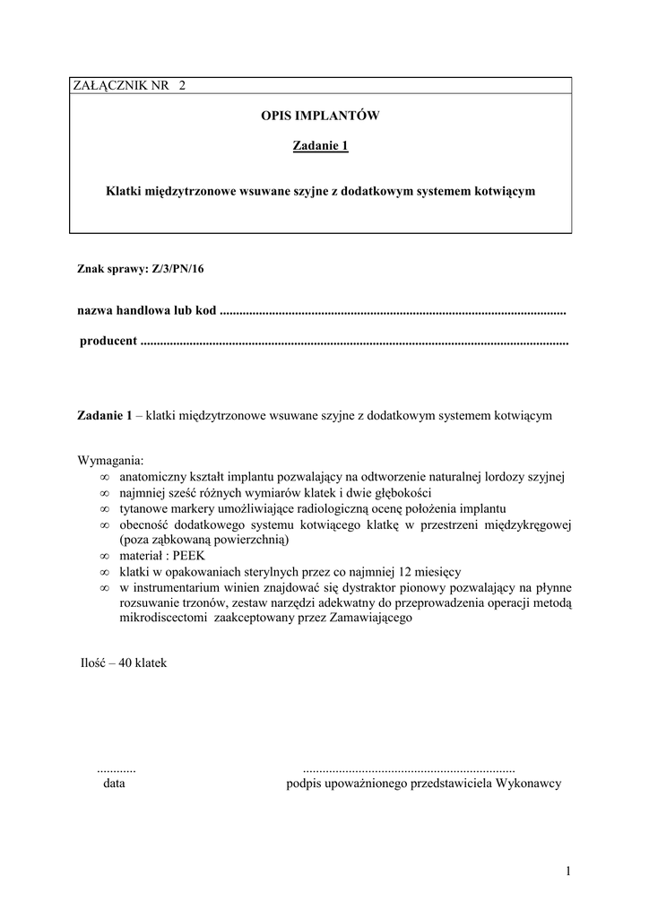 ZAŁĄCZNIK NR 2 OPIS IMPLANTÓW Zadanie 1 Klatki międzytrzonowe wsuwane szyjne z dodatkowym systemem kotwiącym Znak sprawy: Z/3/PN/16 nazwa handlowa lub kod .......................................................................................................... producent ................................................................................................................................... Zadanie 1 – klatki międzytrzonowe wsuwane szyjne z dodatkowym systemem kotwiącym Wymagania: • anatomiczny kształt implantu pozwalający na odtworzenie naturalnej lordozy szyjnej • najmniej sześć różnych wymiarów klatek i dwie głębokości • tytanowe markery umożliwiające radiologiczną ocenę położenia implantu • obecność dodatkowego systemu kotwiącego klatkę w przestrzeni międzykręgowej (poza ząbkowaną powierzchnią) • materiał : PEEK • klatki w opakowaniach sterylnych przez co najmniej 12 miesięcy • w instrumentarium winien znajdować się dystraktor pionowy pozwalający na płynne rozsuwanie trzonów, zestaw narzędzi adekwatny do przeprowadzenia operacji metodą mikrodiscectomi zaakceptowany przez Zamawiającego Ilość – 40 klatek ............ data ................................................................. podpis upoważnionego przedstawiciela Wykonawcy 1 ZAŁĄCZNIK NR 2 OPIS IMPLANTÓW Zadanie 2 Klatki międzytrzonowe wsuwane szyjne nie wymagające wypełnienia Znak sprawy: Z/3/PN/16 nazwa handlowa lub kod .......................................................................................................... producent ................................................................................................................................... Zadanie nr 2 - klatki międzytrzonowe wsuwane szyjne nie wymagające wypełnienia Wymagania: • dwukomorowe klatki z mostem poprzecznym wykonane z PEEK bez konieczności ich wypełnienia substytutem kości • nieanatomiczny kształt • markery tytanowe pozwalające ocenić osadzenie implantu • powierzchnia klatki ząbkowana w celu lepszego osadzenia implantu • wysokość klatki od 3 do 10 mm ze skokiem co 1 mm, długość od 12 do 16 mm • instrumentarium z dystraktorem pozwalającym na płynne rozsuwanie trzonów oraz dystraktom typu Caspar • klatki pakowane sterylnie Ilość – 30 sztuk ............ data ................................................................. podpis upoważnionego przedstawiciela Wykonawcy 2 ZAŁĄCZNIK NR 2 OPIS IMPLANTÓW Zadanie 3 Klatki międzytrzonowe szyjne z systemem kotwiącym pozwalającym na płynne odtwarzanie lordozy po zaimplantowaniu Znak sprawy: Z/3/PN/16 nazwa handlowa lub kod .......................................................................................................... producent ................................................................................................................................... Zadanie 3 – klatki międzytrzonowe szyjne z systemem kotwiącym pozwalającym na płynne odtwarzanie lordozy po zaimplantowaniu Wymagania: • • • • • • • materiał : PEEK+ tytanowe markery RTG anatomiczny kształt implantu z wypukłą powierzchnią górną dwa różne rozmiary podstawy implantu i kilka wysokości klatek w celu jak najkorzystniejszego doboru implantu do potrzeb operacji każdy wszczep dostarczany w sposób sterylny, trwale oznakowany marką, numerem seryjnym oraz parametrem wielkości obecność dodatkowego systemu kotwiącego w postaci tytanowych pinów na dolnej górnej powierzchni implantu każda klatka z precyzyjnym mechanizmem dystrakcyjnym pozwalającym na optymalne odtwarzanie lordozy w sposób płynny i kontrolowany przez operatora po wszczepieniu do przestrzeni międzykręgowej. W zestawie narzędzi dystraktor typu Caspar Ilość – 20 sztuk ............ data ................................................................. podpis upoważnionego przedstawiciela Wykonawcy 3 ZAŁĄCZNIK NR 2 OPIS IMPLANTÓW Zadanie 4 Klatki międzytrzonowe szyjne do stabilizacji dynamicznej Znak sprawy: Z/3/PN/16 nazwa handlowa lub kod .......................................................................................................... producent .................................................................................................................................... Zadanie 4 – klatki międzytrzonowe szyjne do stabilizacji dynamicznej Wymagania: • • • • • • • • implanty zapewniające dynamiczną mikroruchomość poprzez szczelinę na bocznej, pionowej ścianie klatki, stymulującą zrost kostny brak elementów metalowych poza znacznikami radiologicznymi materiał : PEEK implanty dostarczane z wypełnieniem w postaci żelu hydroksyapatytowego na powierzchniach dolnej i górnej płetwy stabilizujące implant w przestrzeni w zestawie dystraktor typu Caspar kompaktowy zestaw narzędzi w jednym kontenerze firma zapewni szkolenie w implantacji urządzenia Ilość – 10 sztuk ............ data ................................................................. podpis upoważnionego przedstawiciela Wykonawcy 4 ZAŁĄCZNIK NR 2 OPIS IMPLANTÓW Zadanie 5 Klatki międzytrzonowe szyjne do stabilizacji dynamicznej z zabezpieczeniem implantu śrubami mocującymi Znak sprawy: Z/3/PN/16 nazwa handlowa lub kod .......................................................................................................... producent .................................................................................................................................... Zadanie 5 – klatki międzytrzonowe szyjne do stabilizacji dynamicznej z zabezpieczeniem implantu śrubami mocującymi Wymagania : • • • • • • • wykonane z PEEK przezierne implanty o kształcie owalnych bloków implanty z mechanizmem dynamicznego utrzymania i przywracania odpowiedniego kąta lordozy zaokrąglony kształt umożliwiający uzyskanie maksymalnego kontaktu z kością znaczniki umożliwiające pooperac