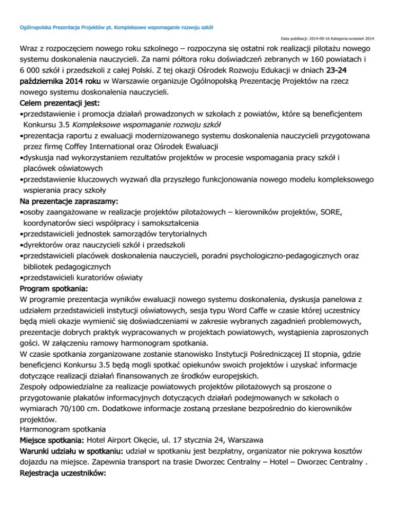 Ogólnopolska Prezentacja Projektów pt. Kompleksowe wspomaganie rozwoju szkół Data publikacji: 2014-09-16 Kategoria:wrzesień 2014 Wraz z rozpoczęciem nowego roku szkolnego – rozpoczyna się ostatni rok realizacji pilotażu nowego systemu doskonalenia nauczycieli. Za nami półtora roku doświadczeń zebranych w 160 powiatach i 6 000 szkół i przedszkoli z całej Polski. Z tej okazji Ośrodek Rozwoju Edukacji w dniach 23-24 października 2014 roku w Warszawie organizuje Ogólnopolską Prezentację Projektów na rzecz nowego systemu doskonalenia nauczycieli. Celem prezentacji jest: •przedstawienie i promocja działań prowadzonych w szkołach z powiatów, które są beneficjentem Konkursu 3.5 Kompleksowe wspomaganie rozwoju szkół •prezentacja raportu z ewaluacji modernizowanego systemu doskonalenia nauczycieli przygotowana przez firmę Coffey International oraz Ośrodek Ewaluacji •dyskusja nad wykorzystaniem rezultatów projektów w procesie wspomagania pracy szkół i placówek oświatowych •przedstawienie kluczowych wyzwań dla przyszłego funkcjonowania nowego modelu kompleksowego wspierania pracy szkoły Na prezentacje zapraszamy: •osoby zaangażowane w realizacje projektów pilotażowych – kierowników projektów, SORE, koordynatorów sieci współpracy i samokształcenia •przedstawicieli jednostek samorządów terytorialnych •dyrektorów oraz nauczycieli szkół i przedszkoli •przedstawicieli placówek doskonalenia nauczycieli, poradni psychologiczno-pedagogicznych oraz bibliotek pedagogicznych •przedstawicieli kuratoriów oświaty Program spotkania: W programie prezentacja wyników ewaluacji nowego systemu doskonalenia, dyskusja panelowa z udziałem przedstawicieli instytucji oświatowych, sesja typu Word Caffe w czasie której uczestnicy będą mieli okazje wymienić się doświadczeniami w zakresie wybranych zagadnień problemowych, prezentacje dobrych praktyk wypracowanych w projektach powiatowych, wystąpienia zaproszonych gości. W załączeniu ramowy harmonogram spotkania. W czasie spotkania zorganizowane zostanie stanowisko Instytucji Pośredniczącej II stopnia, gdzie beneficjenci Konkursu 3.5 będą mogli spotkać opiekunów swoich projektów i uzyskać informacje dotyczące realizacji działań finansowanych ze środków europejskich. Zespoły odpowiedzialne za realizacje powiatowych projektów pilotażowych są proszone o przygotowanie plakatów informacyjnych dotyczących działań podejmowanych w szkołach o wymiarach 70/100 cm. Dodatkowe informacje zostaną przesłane bezpośrednio do kierowników projektów. Harmonogram spotkania Miejsce spotkania: Hotel Airport Okęcie, ul. 17 stycznia 24, Warszawa Warunki udziału w spotkaniu: udział w spotkaniu jest bezpłatny, organizator nie pokrywa kosztów dojazdu na miejsce. Zapewnia transport na trasie Dworzec Centralny – Hotel – Dworzec Centralny . Rejestracja uczestników: Rejestracja poprzez formularz zgłoszeniowy. Osoby rejestrujące prosimy o wybranie tematu sesji dobrych praktyk, w którym deklarują udział: •Sieci współpracy i samokształcenia •Roczne plany wspomagania •Powiatowe programy wspomagania
