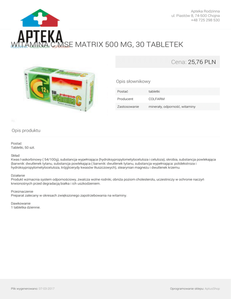 Apteka Rodzinna ul. Piastów 8, 74-500 Chojna +48 725 298 530 WITAMINA C MSE MATRIX 500 MG, 30 TABLETEK Cena: 25,76 PLN Opis słownikowy Postać tabletki Producent COLFARM Zastosowanie minerały, odporność, witaminy Opis produktu Postać Tabletki, 50 szt. Skład Kwas l-askorbinowy ( 54/100g), substancja wypełniająca (hydroksypropylometyloceluloza i celuloza), skrobia, substancja powlekająca (barwnik: dwutlenek tytanu, substancja powlekająca ( barwnik: dwutlenek tytanu, substancja wypełniająca: polidekstroza i hydroksypropylometyloceluloza, trójglicerydy kwasów tłuszczowych), stearynian magnezu i dwutlenek krzemu. Działanie Produkt wzmacnia system odpornościowy, zwalcza wolne rodniki, obniża poziom cholesterolu, uczestniczy w ochronie naczyń krwionośnych przed degradacją białka i ich uszkodzeniem. Przeznaczenie Preparat zalecany w okresach zwiększonego zapotrzebowania na witaminy. Dawkowanie 1 tabletka dziennie. Plik wygenerowano: 07-03-2017 Powered by TCPDF (www.tcpdf.org) Oprogramowanie sklepu: AptusShop