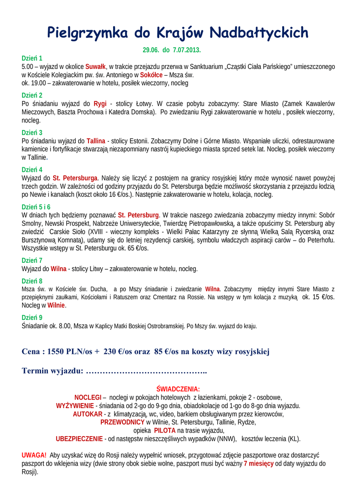 Pielgrzymka do Krajów Nadbałtyckich 29.06. do 7.07.2013. Dzień 1 5.00 – wyjazd w okolice Suwałk, w trakcie przejazdu przerwa w Sanktuarium „Cząstki Ciała Pańskiego” umieszczonego w Kościele Kolegiackim pw. św. Antoniego w Sokółce – Msza św. ok. 19.00 – zakwaterowanie w hotelu, posiłek wieczorny, nocleg Dzień 2 Po śniadaniu wyjazd do Rygi - stolicy Łotwy. W czasie pobytu zobaczymy: Stare Miasto (Zamek Kawalerów Mieczowych, Baszta Prochowa i Katedra Domska). Po zwiedzaniu Rygi zakwaterowanie w hotelu , posiłek wieczorny, nocleg. Dzień 3 Po śniadaniu wyjazd do Tallina - stolicy Estonii. Zobaczymy Dolne i Górne Miasto. Wspaniałe uliczki, odrestaurowane kamienice i fortyfikacje stwarzają niezapomniany nastrój kupieckiego miasta sprzed setek lat. Nocleg, posiłek wieczorny w Tallinie. Dzień 4 Wyjazd do St. Petersburga. Należy się liczyć z postojem na granicy rosyjskiej który może wynosić nawet powyżej trzech godzin. W zależności od godziny przyjazdu do St. Petersburga będzie możliwość skorzystania z przejazdu łodzią po Newie i kanałach (koszt około 16 €/os.). Następnie zakwaterowanie w hotelu, kolacja, nocleg. Dzień 5 i 6 W dniach tych będziemy poznawać St. Petersburg. W trakcie naszego zwiedzania zobaczymy miedzy innymi: Sobór Smolny, Newski Prospekt, Nabrzeże Uniwersyteckie, Twierdzę Pietropawłowską, a także opuścimy St. Petersburg aby zwiedzić Carskie Sioło (XVIII - wieczny kompleks - Wielki Pałac Katarzyny ze słynną Wielką Salą Rycerską oraz Bursztynową Komnatą), udamy się do letniej rezydencji carskiej, symbolu władczych aspiracji carów – do Peterhofu. Wszystkie wstępy w St. Petersburgu ok. 65 €/os. Dzień 7 Wyjazd do Wilna - stolicy Litwy – zakwaterowanie w hotelu, nocleg. Dzień 8 Msza św. w Kościele św. Ducha, a po Mszy śniadanie i zwiedzanie Wilna. Zobaczymy między innymi Stare Miasto z przepięknymi zaułkami, Kościołami i Ratuszem oraz Cmentarz na Rossie. Na wstępy w tym kolacja z muzyką ok. 15 €/os. Nocleg w Wilnie. Dzień 9 Śniadanie ok. 8.00, Msza w Kaplicy Matki Boskiej Ostrobramskiej. Po Mszy św. wyjazd do kraju. Cena : 1550 PLN/os + 230 €/os oraz 85 €/os na koszty wizy rosyjskiej Termin wyjazdu: …………………………………….. ŚWIADCZENIA: NOCLEGI – noclegi w pokojach hotelowych z łazienkami, pokoje 2 - osobowe, WYŻYWIENIE - śniadania od 2-go do 9-go dnia, obiadokolacje od 1-go do 8-go dnia wyjazdu. AUTOKAR - z klimatyzacją, wc, video, barkiem obsługiwanym przez kierowców, PRZEWODNICY w Wilnie, St. Petersburgu, Tallinie, Rydze, opieka PILOTA na trasie wyjazdu, UBEZPIECZENIE - od następstw nieszczęśliwych wypadków (NNW), kosztów leczenia (KL). UWAGA! Aby uzyskać wizę do Rosji należy wypełnić wniosek, przygotować zdjęcie paszportowe oraz dostarczyć paszport do wklejenia wizy (dwie strony obok siebie wolne, paszport musi być ważny 7 miesięcy od daty wyjazdu do Rosji).
