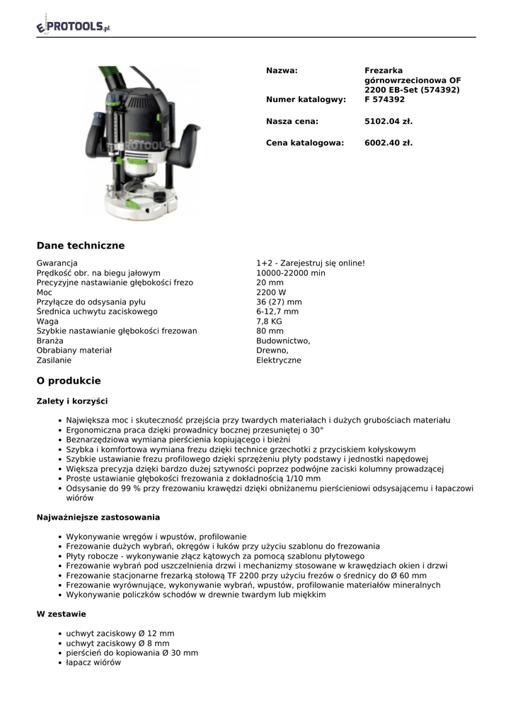 Nazwa: Numer katalogwy: Frezarka górnowrzecionowa OF 2200 EB-Set (574392) F 574392 Nasza cena: 5102.04 zł. Cena katalogowa: 6002.40 zł. Dane techniczne Gwarancja Prędkość obr. na biegu jałowym Precyzyjne nastawianie głębokości frezo Moc Przyłącze do odsysania pyłu Średnica uchwytu zaciskowego Waga Szybkie nastawianie głębokości frezowan Branża Obrabiany materiał Zasilanie 1+2 - Zarejestruj się online! 10000-22000 min 20 mm 2200 W 36 (27) mm 6-12,7 mm 7,8 KG 80 mm Budownictwo, Drewno, Elektryczne O produkcie Zalety i korzyści Największa moc i skuteczność przejścia przy twardych materiałach i dużych grubościach materiału Ergonomiczna praca dzięki prowadnicy bocznej przesuniętej o 30° Beznarzędziowa wymiana pierścienia kopiującego i bieżni Szybka i komfortowa wymiana frezu dzięki technice grzechotki z przyciskiem kołyskowym Szybkie ustawianie frezu profilowego dzięki sprzężeniu płyty podstawy i jednostki napędowej Większa precyzja dzięki bardzo dużej sztywności poprzez podwójne zaciski kolumny prowadzącej Proste ustawianie głębokości frezowania z dokładnością 1/10 mm Odsysanie do 99 % przy frezowaniu krawędzi dzięki obniżanemu pierścieniowi odsysającemu i łapaczowi wiórów Najważniejsze zastosowania Wykonywanie wręgów i wpustów, profilowanie Frezowanie dużych wybrań, okręgów i łuków przy użyciu szablonu do frezowania Płyty robocze - wykonywanie złącz kątowych za pomocą szablonu płytowego Frezowanie wybrań pod uszczelnienia drzwi i mechanizmy stosowane w krawędziach okien i drzwi Frezowanie stacjonarne frezarką stołową TF 2200 przy użyciu frezów o średnicy do Ø 60 mm Frezowanie wyrównujące, wykonywanie wybrań, wpustów, profilowanie materiałów mineralnych Wykonywanie policzków schodów w drewnie twardym lub miękkim W zestawie uchwyt zaciskowy Ø 12 mm uchwyt zaciskowy Ø 8 mm pierścień do kopiowania Ø 30 mm łapacz wiórów SYSTAINER z wyposażeniem (zestaw adaptera szyn prowadzących, prowadnica boczna z regulacją precyzyjną i osłoną ssącą, drążki prowadzące, pierścień do kopiowania o średnicy 17 mm, pierścień do kopiowania o średnicy 24 mm, pierścień do kopiowania o średnicy 27 mm, pierścień do kopiowania o średnicy 40 mm, bieżnia D36, bieżnia do pierścieni do kopiowania, rozszerzenie przyłożenia) narzędzie do obsługi w systainerze SYS 4 Powered by TCPDF (www.tcpdf.org)