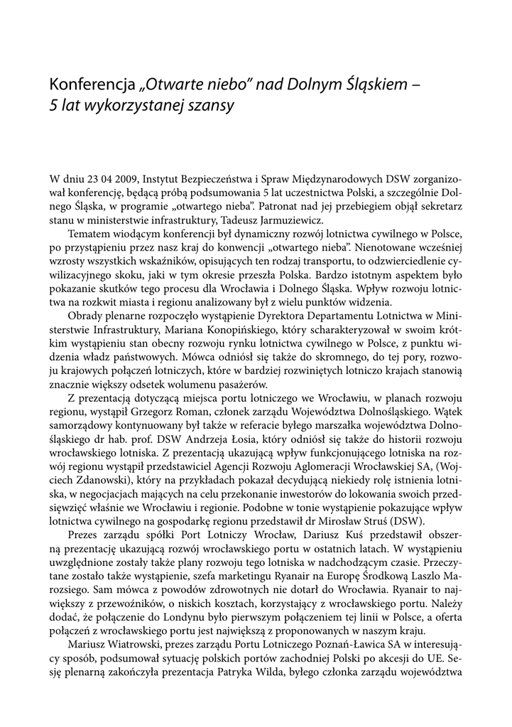 Konferencja „Otwarte niebo” nad Dolnym Śląskiem – 5 lat wykorzystanej szansy W dniu 23 04 2009, Instytut Bezpieczeństwa i Spraw Międzynarodowych DSW zorganizował konferencję, będącą próbą podsumowania 5 lat uczestnictwa Polski, a szczególnie Dolnego Śląska, w programie „otwartego nieba”. Patronat nad jej przebiegiem objął sekretarz stanu w ministerstwie infrastruktury, Tadeusz Jarmuziewicz. Tematem wiodącym konferencji był dynamiczny rozwój lotnictwa cywilnego w Polsce, po przystąpieniu przez nasz kraj do konwencji „otwartego nieba”. Nienotowane wcześniej wzrosty wszystkich wskaźników, opisujących ten rodzaj transportu, to odzwierciedlenie cywilizacyjnego skoku, jaki w tym okresie przeszła Polska. Bardzo istotnym aspektem było pokazanie skutków tego procesu dla Wrocławia i Dolnego Śląska. Wpływ rozwoju lotnictwa na rozkwit miasta i regionu analizowany był z wielu punktów widzenia. Obrady plenarne rozpoczęło wystąpienie Dyrektora Departamentu Lotnictwa w Ministerstwie Infrastruktury, Mariana Konopińskiego, który scharakteryzował w swoim krótkim wystąpieniu stan obecny rozwoju rynku lotnictwa cywilnego w Polsce, z punktu widzenia władz państwowych. Mówca odniósł się także do skromnego, do tej pory, rozwoju krajowych połączeń lotniczych, które w bardziej rozwiniętych lotniczo krajach stanowią znacznie większy odsetek wolumenu pasażerów. Z prezentacją dotyczącą miejsca portu lotniczego we Wrocławiu, w planach rozwoju regionu, wystąpił Grzegorz Roman, członek zarządu Województwa Dolnośląskiego. Wątek samorządowy kontynuowany był także w referacie byłego marszałka województwa Dolnośląskiego dr hab. prof. DSW Andrzeja Łosia, który odniósł się także do historii rozwoju wrocławskiego lotniska. Z prezentacją ukazującą wpływ funkcjonującego lotniska na rozwój regionu wystąpił przedstawiciel Agencji Rozwoju Aglomeracji Wrocławskiej SA, (Wojciech Zdanowski), który na przykładach pokazał decydującą niekiedy rolę istnienia lotniska, w negocjacjach mających na celu przekonanie inwestorów do lokowania swoich przedsięwzięć właśnie we Wrocławiu i regionie. Podobne w tonie wystąpienie pokazujące wpływ lotnictwa cywilnego na gospodarkę regionu przedstawił dr Mirosław Struś (DSW). Prezes zarządu spółki Port Lotniczy Wrocław, Dariusz Kuś przedstawił obszerną prezentację ukazującą rozwój wrocławskiego portu w ostatnich latach. W wystąpieniu uwzględnione zostały także plany rozwoju tego lotniska w nadchodzącym czasie. Przeczytane zostało także wystąpienie, szefa marketingu Ryanair na Europę Środkową Laszlo Marozsiego. Sam mówca z powodów zdrowotnych nie dotarł do Wrocławia. Ryanair to największy z przewoźników, o niskich kosztach, korzystający z wrocławskiego portu. Należy dodać, że połączenie do Londynu było pierwszym połączeniem tej linii w Polsce, a oferta połączeń z wrocławskiego portu jest największą z proponowanych w naszym kraju. Mariusz Wiatrowski, prezes zarządu Portu Lotniczego Poznań-Ławica SA w interesujący sposób, podsumował sytuację polskich portów zachodniej Polski po akcesji do UE. Sesję plenarną zakończyła prezentacja Patryka Wilda, byłego członka zarządu województwa KRONIKA NAUKOWA 265 Dolnośląskiego, który przedstawił bardzo interesującą koncepcję połączenia wrocławskiego lotniska z istniejącą siecią kolejową. Propozycja tego samorządowca, różniąca się w sposób zasadniczy od projektowanego połączenia, tworzyłaby prawdziwy multimodalny, lotniskowy węzeł komunikacyjny. Dyskusja, która rozpoczęła się po ostatnim wystąpieniu kontynuowana była w kuluarach konferencji. Dyskutanci wskazali także na ograniczenia rozwojowe, jakie stoją przed transportem lotniczym i funkcjonowaniem lokalnych portów lotniczych. W sesji panelowej analizie zostało poddane wieloaspektowo rozumiane funkcjonowanie portu lotniczego we Wrocławiu. Wystąpienia dotyczyły bezpieczeństwa portu (dr Marek Szczelina), aspektów ekologicznych w funkcjonowaniu lotniska (dr Helena Wyligała), czy konkurencji portów niemieckich (Edyta Pijet-Migoń). Przedstawiony został także stan bieżący i perspektywy liberalizacji przewozów lotniczych miedzy Polską i Ukrainą (Jakub Rutkowski UW). Poruszony został także, sygnalizowany w sesji plenarnej, problem słabego rozwoju przewozów krajowych w Polsce (mgr Bogusław Węgliński). Sesję panelową zakończyło wystąpienie dotyczące funkcjonowania Lotniczego Pogotowia Ratunkowego (mgr Małgorzata Lizut). Konferencja stworzyła szanse do przeprowadzenia szerokiej debaty dotyczącej miejsca i prognoz rozwoju lotnictwa cywilnego w Polsce, choć szczególnej analizie poddano jego rozwój na Dolnym Śląsku. Uczestnictwo przedstawicieli administracji państwowej, samorządowej, a także władz portów lotniczych, przewoźników oraz ludzi nauki zajmujących się tematyką lotniczą pozwoliło na szerokie i interdyscyplinarne podejście do problemu. Uczestnicy konferencji uznali, że sektor lotniczych usług transportowych jest jednym z ważnych elementów determinujących rozwój gospodarczy i cywilizacyjny regionu, a tego rodzaju spotkania poprawiają zdecydowanie jakość debaty na temat jego rozwoju. Spotkanie było pierwszą na Dolnym Śląsku próbą podsumowania 5 lat funkcjonowania lotnictwa cywilnego w nowej rzeczywistości „otwartego nieba”. Bogusław WĘGLIŃSKI Dolnośląska Szkoła Wyższa